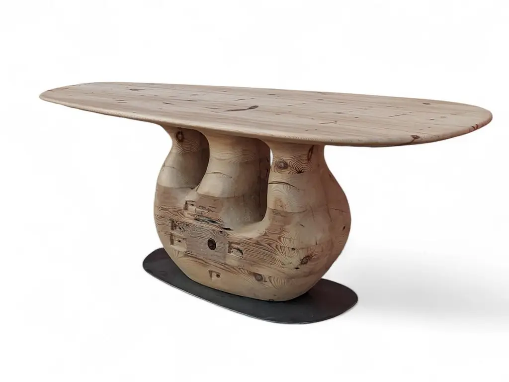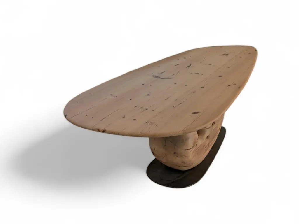 Tea 1750 Collection Dining Table V2 by AMBER x IÑIGO CALLEJADimensions: W 230 x D 100 x H 75 cm. Materials: Old Tea Beams, Steel. Iñigo Calleja is an engineer, designer and soulful maker born in Spain. He landed his first graduate job at European engineering leader BMW in Munich and developed a successful career in different companies that took his places all around the world. He found his inner entrepreneur living in Sydney and self developed his woodworking skills by chance and need. Once he realized he could build almost anything that he sketched he knew were about to get really exciting. In 2017 he decided to lay roots in coastal Cádiz, a city founded in the year 1000BC that hosts a breathtaking history and constructions that have seen human civilizations grow. Iñigo feels an unstoppable attraction for rare timbers he finds in many derelict buildings that were built centuries ago that are being demolished or renovated and becomes attracted to the stories those fine timbers treasure within.“The century old beams that we salvage from historic buildings in the tri-millenary city of Cádiz have always been around since our beginnings and are essentially our trademark.We were lucky to recover a batch of roof rafters from the old British Embassy in Calle Sagasta nr.1 whose construction dates back to 1750! A time when the Port of Cádiz was the main harbor of mainland Spain, enjoying the virtual monopoly of trade with the Americas.The common purpose of the designs in this collection is to achieve a high end looking sculptural and beautiful piece whilst exposing cracks, wrinkles and other superficial imperfections that these structural beams have garnered over their colossal career. By doing so we honor the lives of all people and characters that have dwelled this magnificent building over its almost 300 years of existence.”