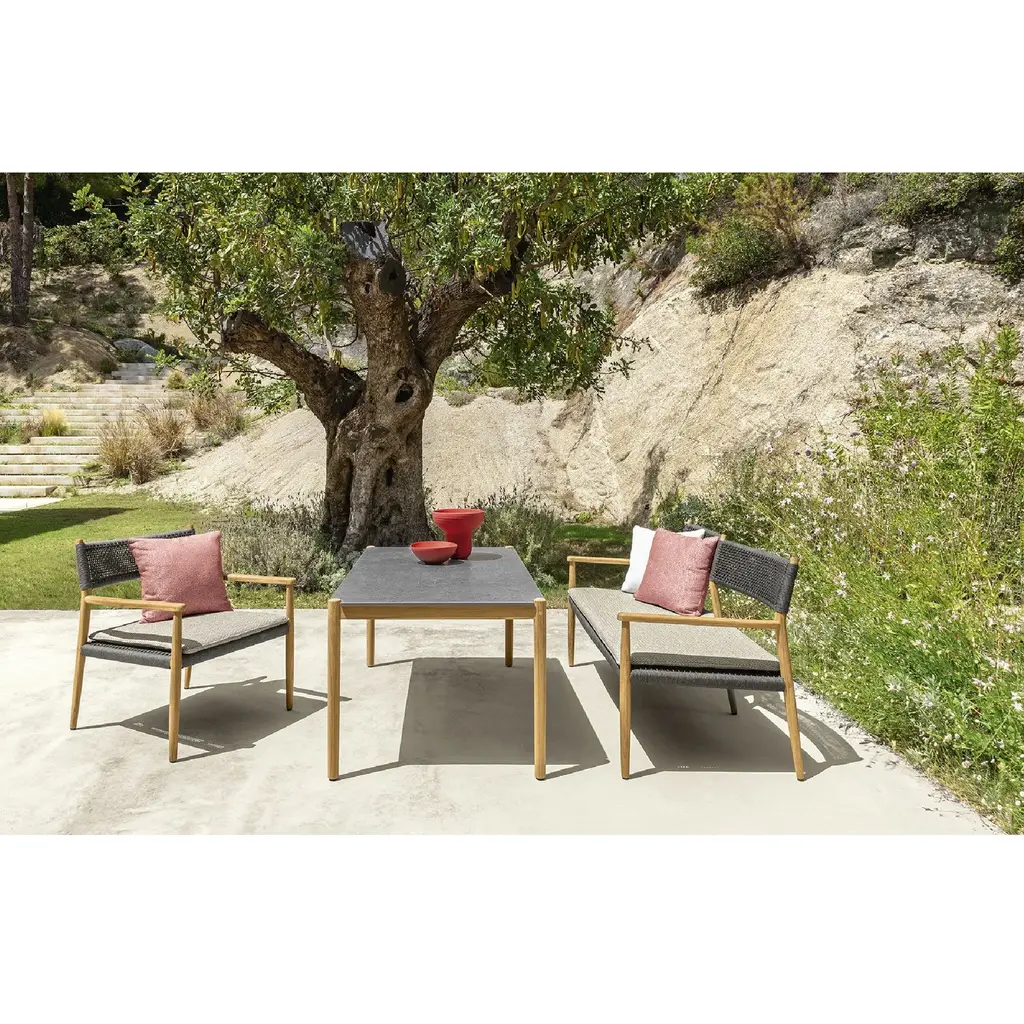 Inspired by warm summer evenings, the Dolcevita dining table is perfect for moments of conviviality. The simple structure highlights the attention to detail and the natural beauty of teak and stoneware. The seductive textures of these materials radiate a light and fresh atmosphere, which characterizes with style, garden and outdoor living.