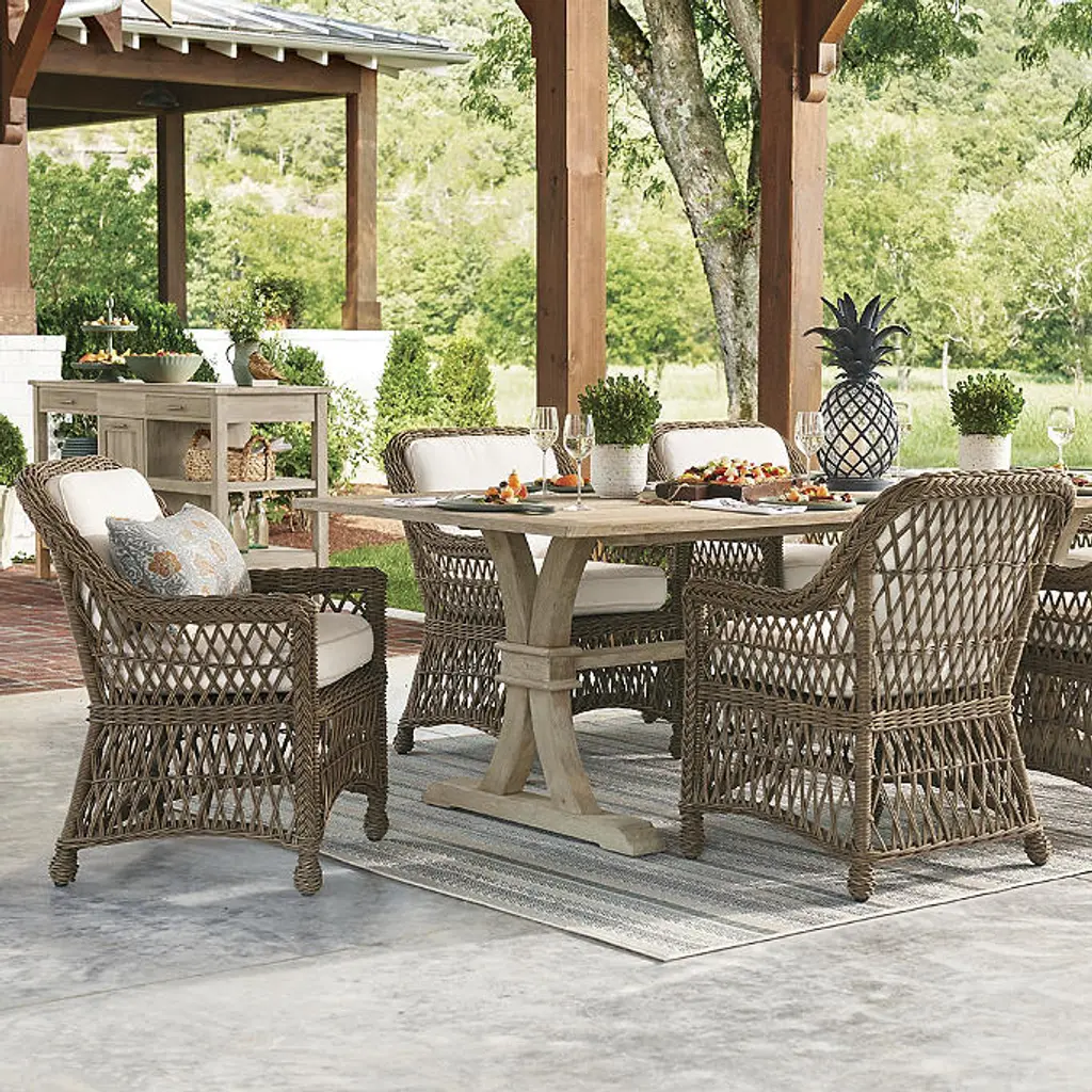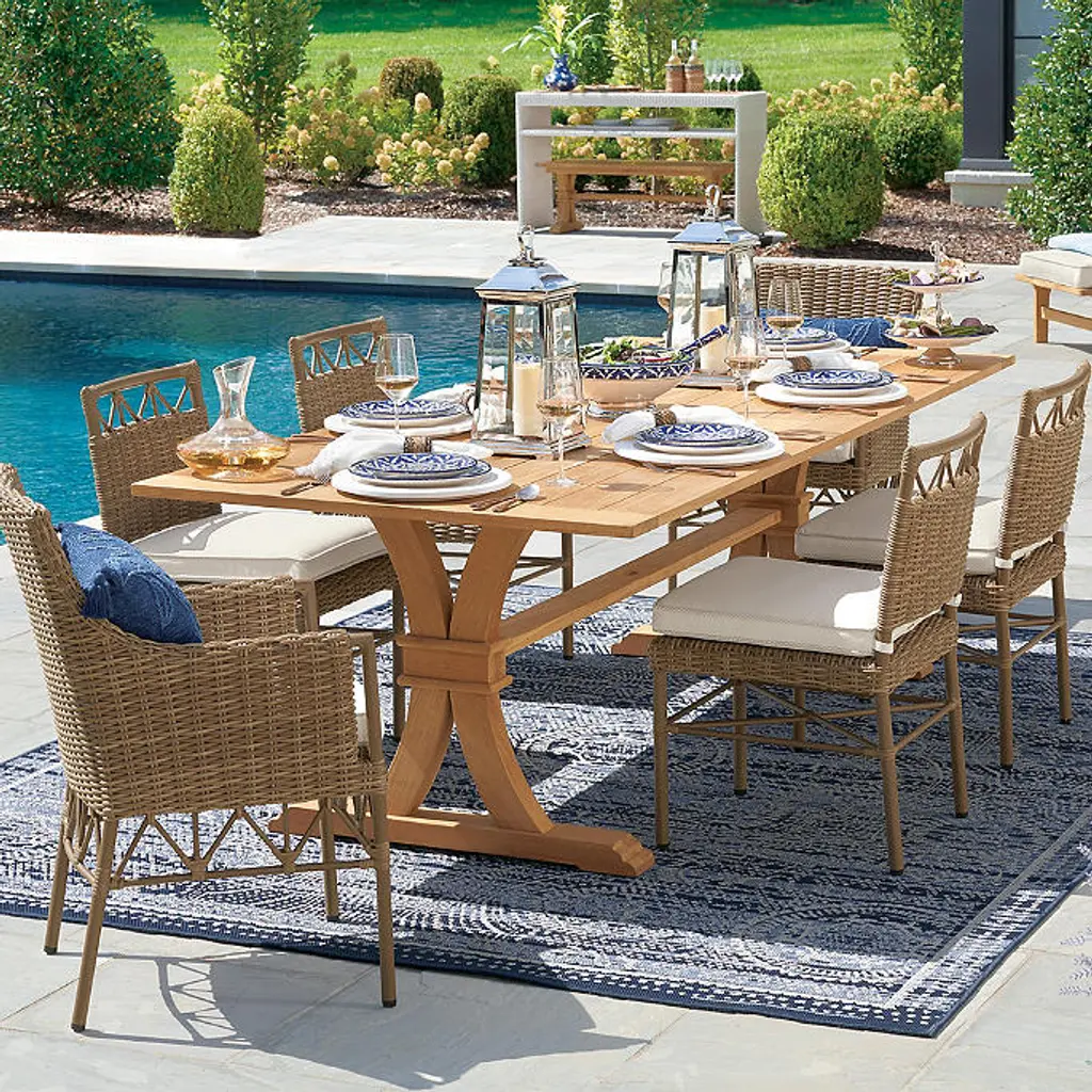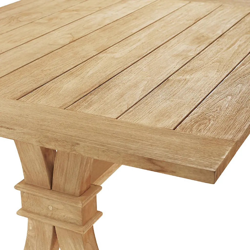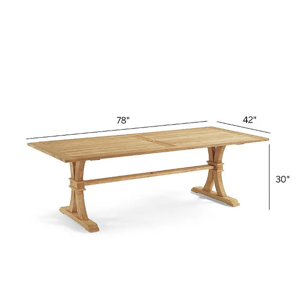 Based on traditional farmhouse-style tables, our Teak Farmhouse Collection is perfect for large gatherings of family and friends. Wide planks of high-quality, kiln-dried teak are affixed to a substantial trestle base. Naturally impervious to the elements, this teak table delivers superior resiliency over time. Contract-grade Hand-built from sustainably harvested, high-quality teak that is naturally resistant to mildew, so it holds up to rain and humidity Durable teak frame is kiln dried to remove moisture, guarding against warping and cracking, and sanded by hand so it's smooth to the touch Over time, teak will develop a natural silver patina if left untreated Frame is backed by an industry-leading 10-year structural warranty Finely sanded to a smooth finishTeak naturally releases resinous oils as it weathers; using a rug is recommended to help prevent staining of deck or patio surfaces Fully concealed stainless steel hardware Adjustable foot glides Mortise and tenon joinery 2" umbrella hole 95" table seats six to eight Assembly required To avoid staining, do not place new Weathered Teak items on porous stone surface until after at least three rainfalls to account for the release of natural oils. See Materials & Care below for more details. Imported A Frontgate exclusive. At Frontgate, our primary focus is quality. We guarantee that every product we sell will stand up to the supreme test – our customers' satisfaction. To learn more about our policies, visit our Shipping & Processing, Returns & Exchanges and Warranty & Price Guarantee pages.