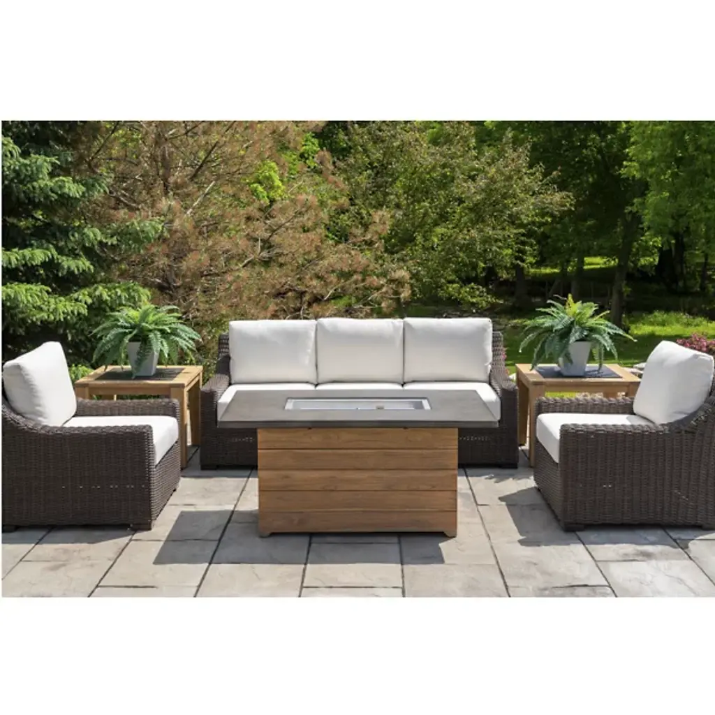 The Teak Round Outdoor Fire Table with Faux Concrete Top by Lloyd Flanders is a stylish and durable addition to any outdoor space. Crafted from sustainably sourced, FSC-certified Brazilian teak, it boasts exceptional weather resistance thanks to its high oil content, tight grain, and natural strength. Over time, the teak gracefully develops a silver patina, with variations influenced by environmental conditions. Combining elegance with functionality, this eco-friendly table is a timeless choice that enhances outdoor dining with sophistication and lasting quality.
