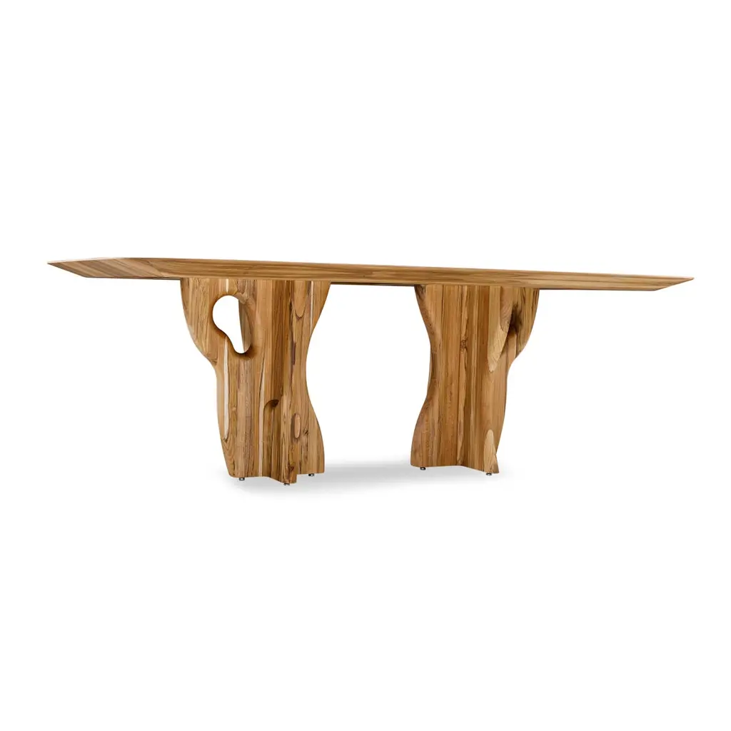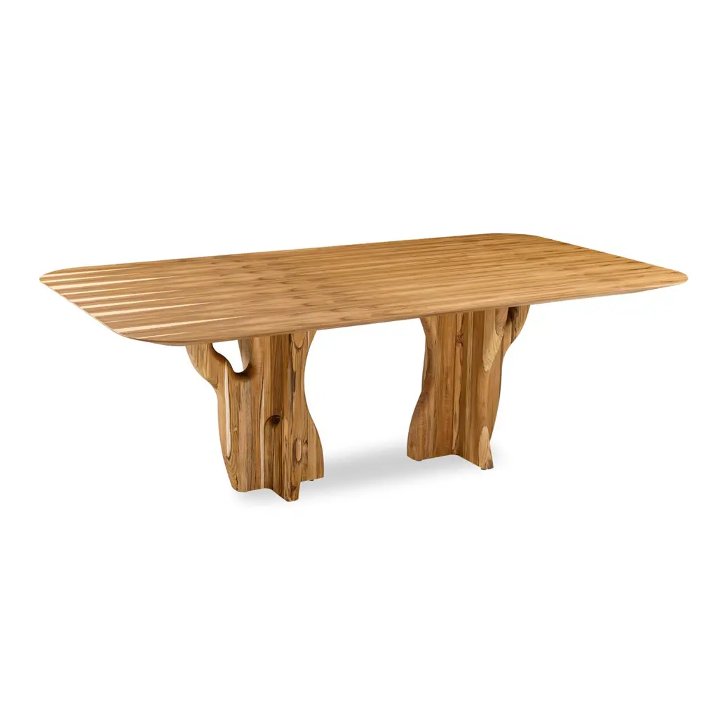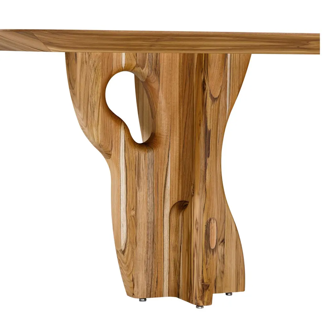 A Suma teak wood dining room table designed by Uultis Studio, with 86" teak veneered top and Amazon tree inspired organic legs. The Suma dining table brings the natural beauty of the Brazilian Amazon into your home. Inspired by the Sumaúma tree, one of the Amazon's most majestic wonders, the organic design of the base mimics the intricate roots of this towering tree. Crafted with solid teak wood legs and an exquisite 86” teak veneered top, the table offers both elegance and functionality, making it perfect for daily use and special gatherings alike. Its rounded corners soften the overall aesthetic, while the natural variations in the teak wood give each table its own unique character.The Suma table's matte, velvety teak touch finish enhances the wood's natural beauty, providing a tactile experience that complements its visual appeal. Designed to blend seamlessly with both contemporary and modern decor, this dining table serves as a focal point in any dining space. Whether you're hosting a dinner party or enjoying a family meal, the Suma table elevates the experience with its organic and artfully crafted design.Perfectly paired with a wide range of chairs from the Uultis collection, this table can be customized to suit your space and style. With its Amazon-inspired base, the Suma dining table not only brings nature’s grandeur into your home but also reflects Uultis's dedication to sustainable, eco-friendly design. Assembly is simple, thanks to detailed instructions, allowing you to enjoy this stunning piece without hassle.