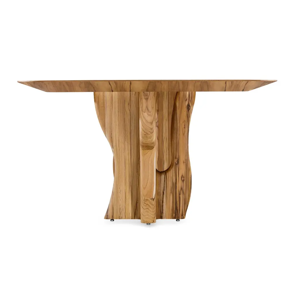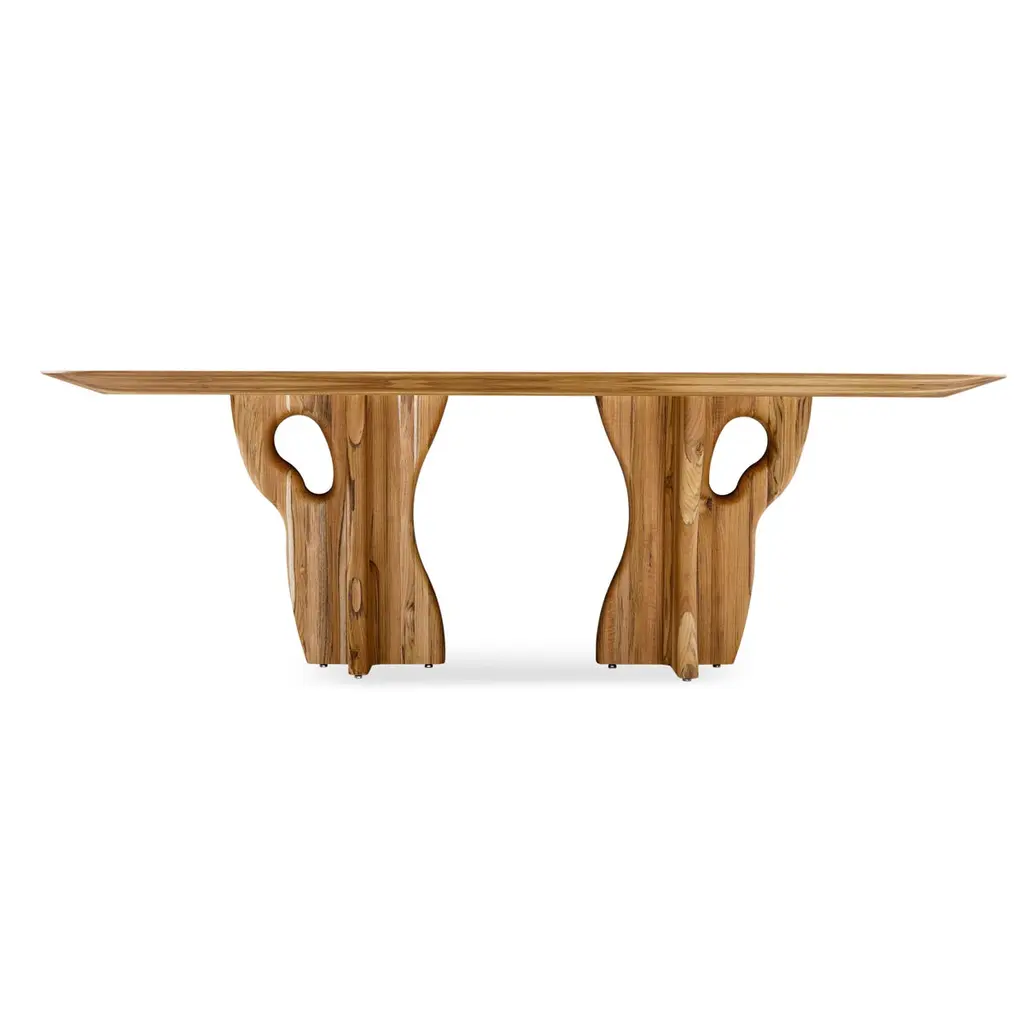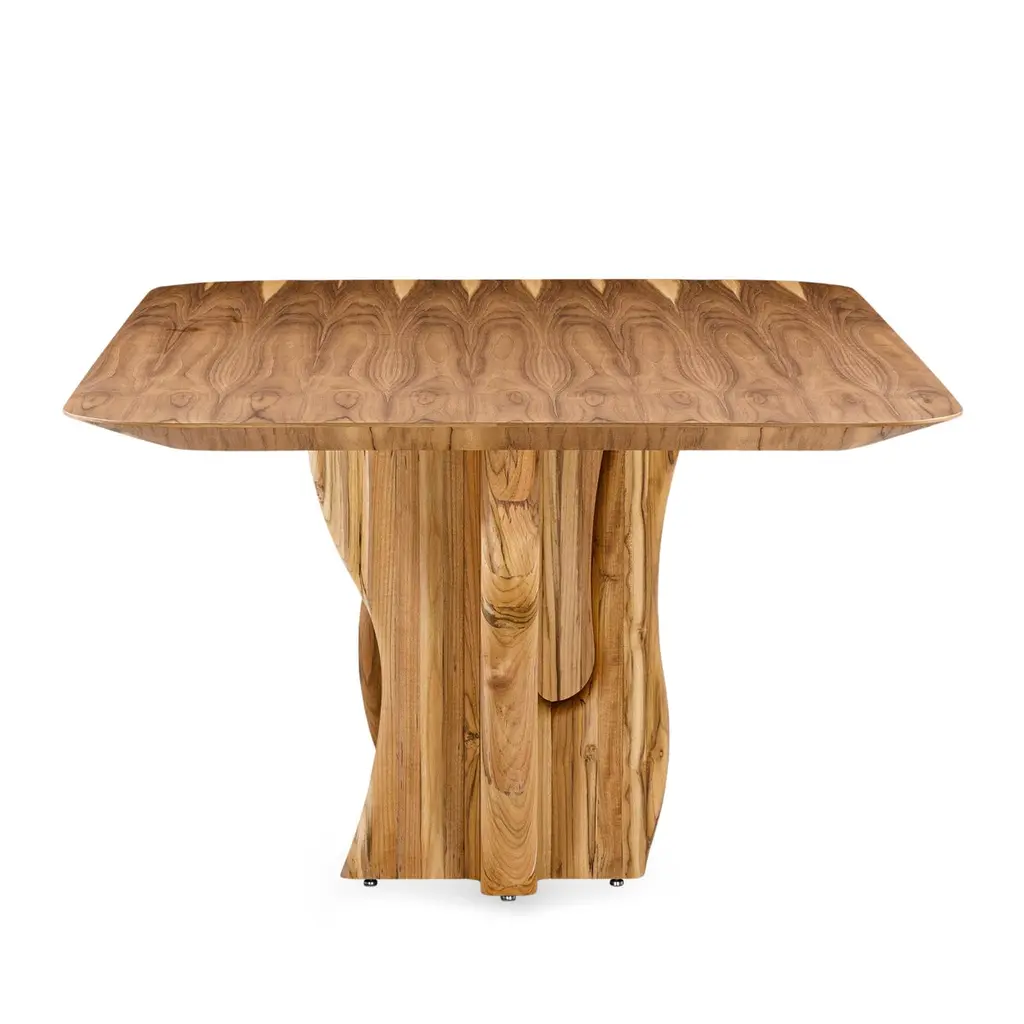 A Suma teak wood dining room table designed by Uultis Studio, with 86" teak veneered top and Amazon tree inspired organic legs. The Suma dining table brings the natural beauty of the Brazilian Amazon into your home. Inspired by the Sumaúma tree, one of the Amazon's most majestic wonders, the organic design of the base mimics the intricate roots of this towering tree. Crafted with solid teak wood legs and an exquisite 86” teak veneered top, the table offers both elegance and functionality, making it perfect for daily use and special gatherings alike. Its rounded corners soften the overall aesthetic, while the natural variations in the teak wood give each table its own unique character.The Suma table's matte, velvety teak touch finish enhances the wood's natural beauty, providing a tactile experience that complements its visual appeal. Designed to blend seamlessly with both contemporary and modern decor, this dining table serves as a focal point in any dining space. Whether you're hosting a dinner party or enjoying a family meal, the Suma table elevates the experience with its organic and artfully crafted design.Perfectly paired with a wide range of chairs from the Uultis collection, this table can be customized to suit your space and style. With its Amazon-inspired base, the Suma dining table not only brings nature’s grandeur into your home but also reflects Uultis's dedication to sustainable, eco-friendly design. Assembly is simple, thanks to detailed instructions, allowing you to enjoy this stunning piece without hassle.