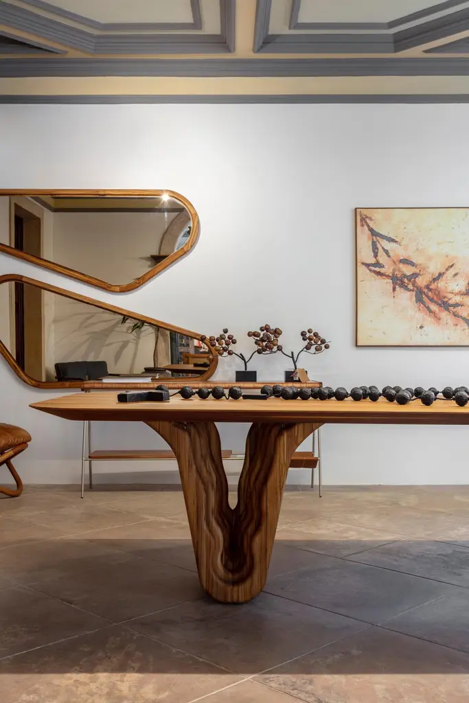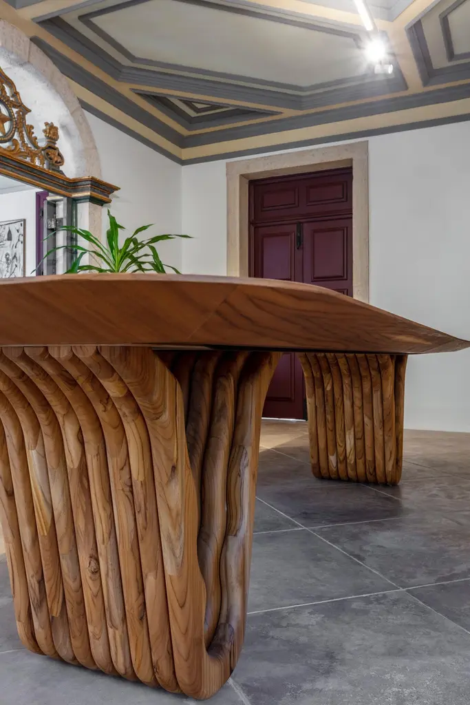 A teak wood Dolomitas dining room table designed by Studio + A! for Uultis with 98” top. The Dolomitas dining room table by Studio + A! for Uultis is a stunning masterpiece crafted from teak wood, with a 98” top that merges natural beauty with modern design. The table's base is inspired by the rugged yet majestic Dolomites mountain range, capturing the essence of nature’s power and elegance. This one-of-a-kind dining table features a unique solid wood base combined with MDF, creating an eye-catching sculptural silhouette that mimics the natural formations of the Dolomites. Its teak wood veneered top, featuring a matte and velvety teak touch finish, boasts natural variations that make each table uniquely distinctive, adding charm and character to any dining space.The beveled underside of the top adds a refined touch, highlighting the careful attention to detail that went into its design. Perfect for both large family gatherings and intimate dinners, the Dolomitas table can comfortably serve as the centerpiece of any dining room, blending effortlessly with modern, contemporary, or rustic decor.Uultis is committed to sustainability, using eco-friendly materials and craftsmanship that prioritize the preservation of nature's beauty. The Dolomitas dining table not only elevates the aesthetic of any home but also represents Uultis's dedication to responsible and sustainable furniture design. Whether placed in a dining room or a large open kitchen, this remarkable table offers a timeless blend of elegance, durability, and natural artistry. The Dolomitas dining table will make every meal a special occasion, celebrating the beauty of both design and nature.