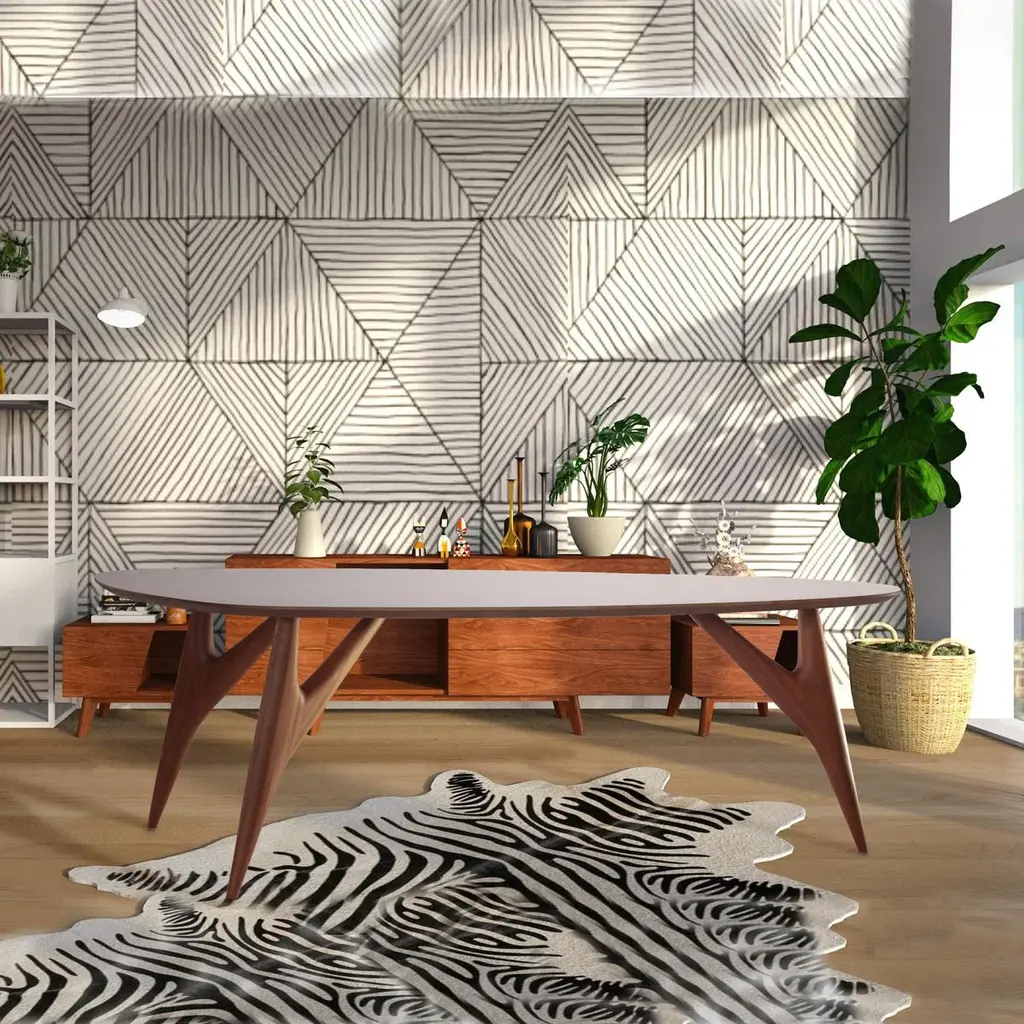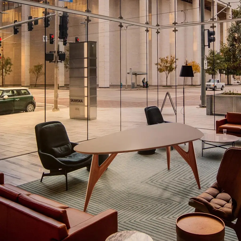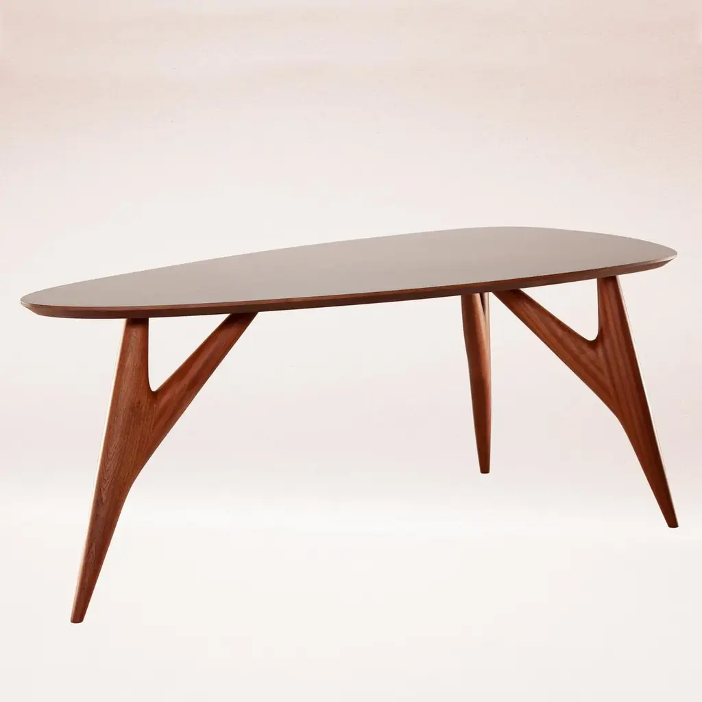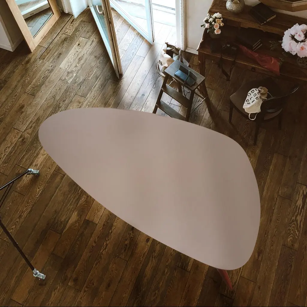 Table ted one beige a table with an elliptical shape like a sail of long format, the table top is constructed with rare elements of solid wood and quality hpl laminate, in this case of a very special color and fascinating a beige with a slight red dominant, a unique color. Ted transmits lightness and joy through the peculiarity of the three legs, their unique bifurcation together with the airy but lush shape of the top gives ted an elegance that will charm any space. The unique smooth oval contours of the legs can only be achieved by passionate hand crafting. our products are easy to maintain, and the choice of certified, emission-free finishes gives our wood elements an extremely natural and pleasant feel. New custom designs are available\.