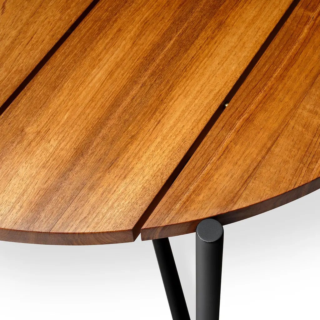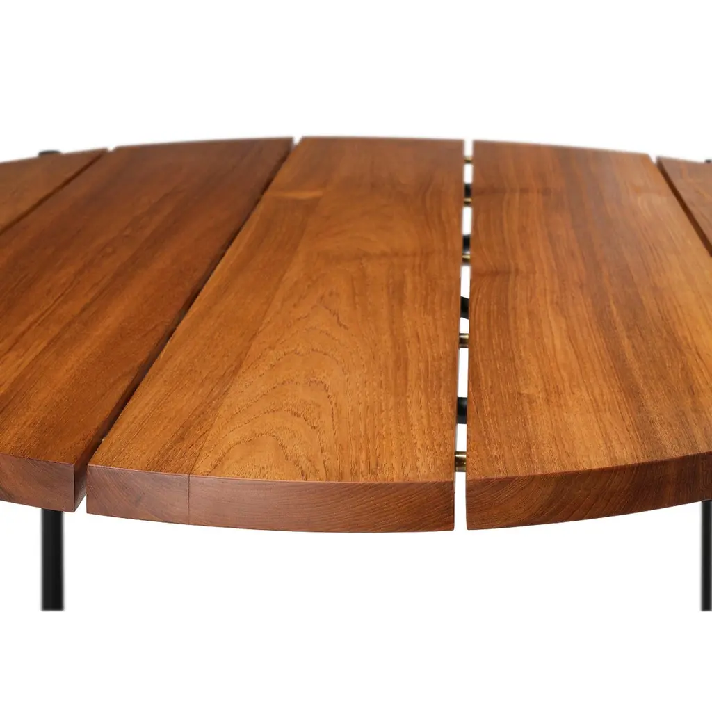 This dining table is part of the Madeira Line from Ten10. The table is made to order. The top is solid plank oiled teak 1 1/4" thick with brass dowels. The base is powder-coated stainless steel. Brass dowels separate the planks. The table measures 46" diameter x 27" high. Custom diameters and heights are available. The table is suitable for indoor or outdoor use. In regards to materials, the top is also available in vertical grain western red cedar. The base is stainless steel powder coated in a semi gloss black color. We can also offer a matte black, oil rubbed bronze, or green color powder coat. Please inquire if you prefer another color. Photos also show the table with stools and optional cushions.