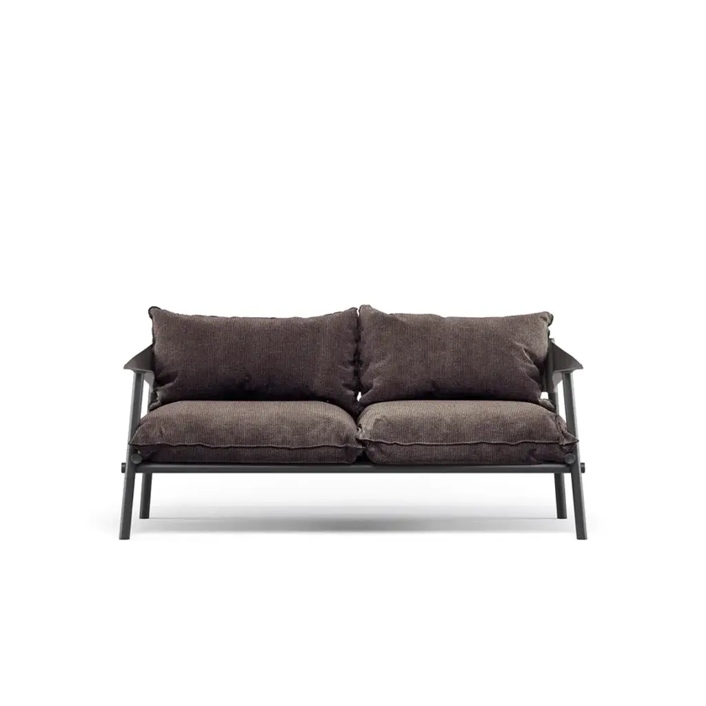 Terramare is a 2 seater garden sofa made with painted aluminum structure, eco-leather armrests and seat cushions covered in synthetic fabric and polyester.Available combinations armchair and sofas:White structure - off-white eco-leather backrestGray-green structure - green eco-leather backrestBlack structure - dark chocolate eco-leather backIndian brown structure - chocolate eco-leather backresPillows:Off-white, turquoise, dark gray, light gray, brown, hibiscus, pinstripeWelcoming shapes and wide dimensions characterise the Terramare collection by Chiaramonte-Marin, a comprehensive range of dining and lounge furniture, coffee tables and sunbeds, as well as tables in a variety of shapes and sizes, including square in a small and large version, and rectangular with different dimensions. The perfect collection to stylishly furnish hospitality and private spaces, both indoors and outdoors.