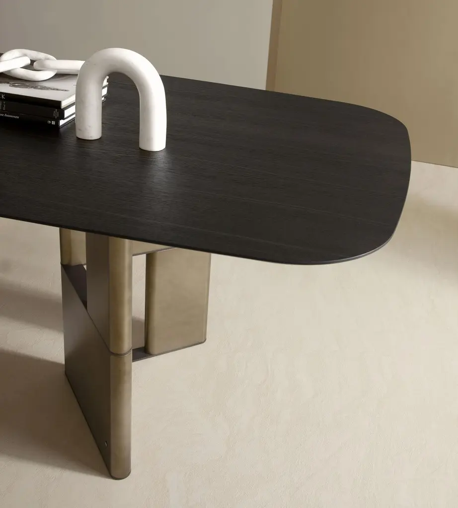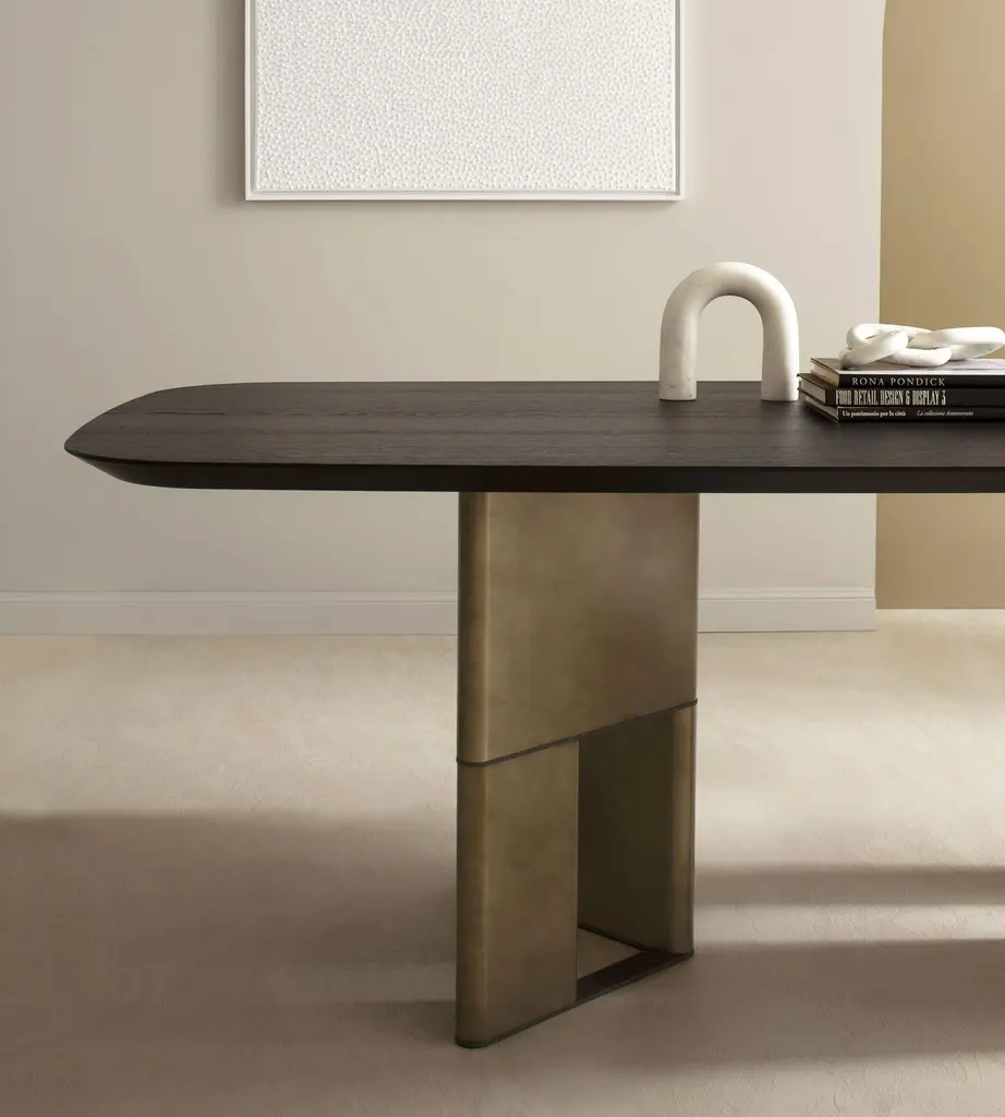 Tetris Laguna Oak and Bronze Dining Table, 10 Seats, by Morica DesignDimensions: D 120 x W 300 x H 75 cm.Materials: Laguna oak, oxidized bronze, dark burnished metal.Available in 6, 8, or 10 seats.Available in Canaletto Walnut, Laguna Oak, and Natural Oak. Please contact us.Table with legs in curved MDF veneered with real wood or lacquered MDF, with metal inserts painted with epoxy powders.Adjustable table feet on the floor. Shaped top in 40mm real wood veneered and brushed MDF with 30° beveled edge, hand-edged and finished with natural paints.The spark of an idea began with three brothers, Moreno, Riccardo, and Carlo, and the desire to provide genuine Made in Italy design furniture, delivered to customer homes directly from the factory.We guarantee our customers a controlled, certified supply chain and an excellent service that makes it easy for their items to be delivered to directly their homes.We are a fresh organization, full of ideas with the desire to make the world a better place, to change the way we consume by providing beauty, sustainability,y and reliable service!