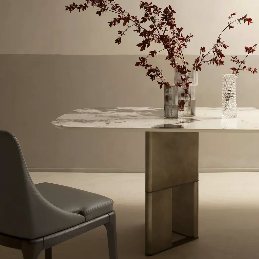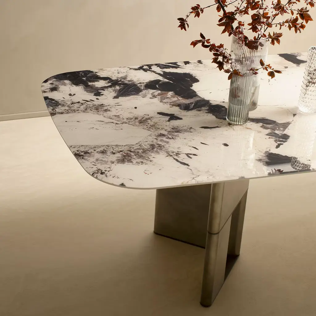 Distinguished by its innovative design and meticulous craftsmanship, this table features curved MDF legs lacquered in Oxidized Bronze with shaped metallic inserts, coated in epoxy powder, and finished in dark-burnished Bronze. The contoured tabletop is crafted from printed glass with a Patagonia marble effect, supported by matching lacquered MDF. A blend of modern aesthetics and functional elegance, this table promises to elevate any living or dining space with its sophisticated style.