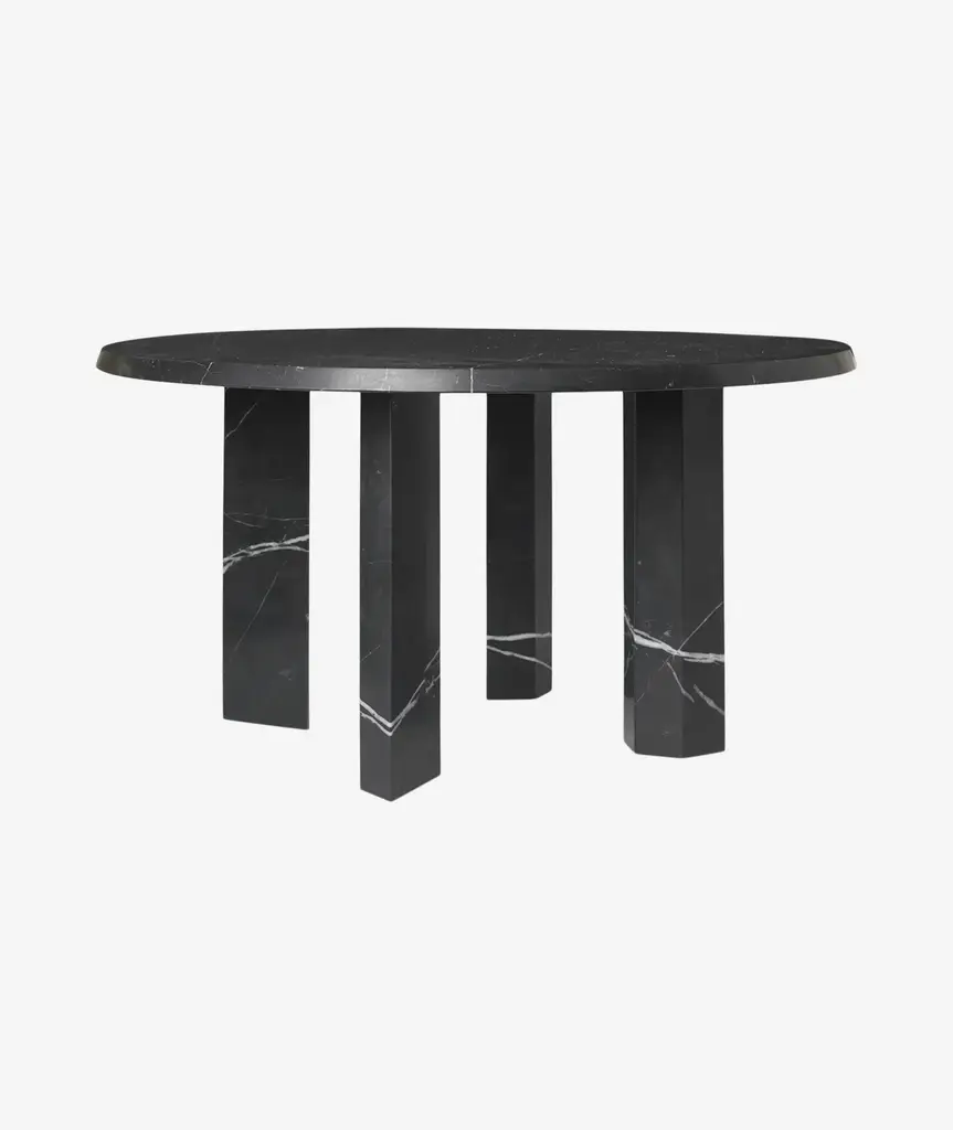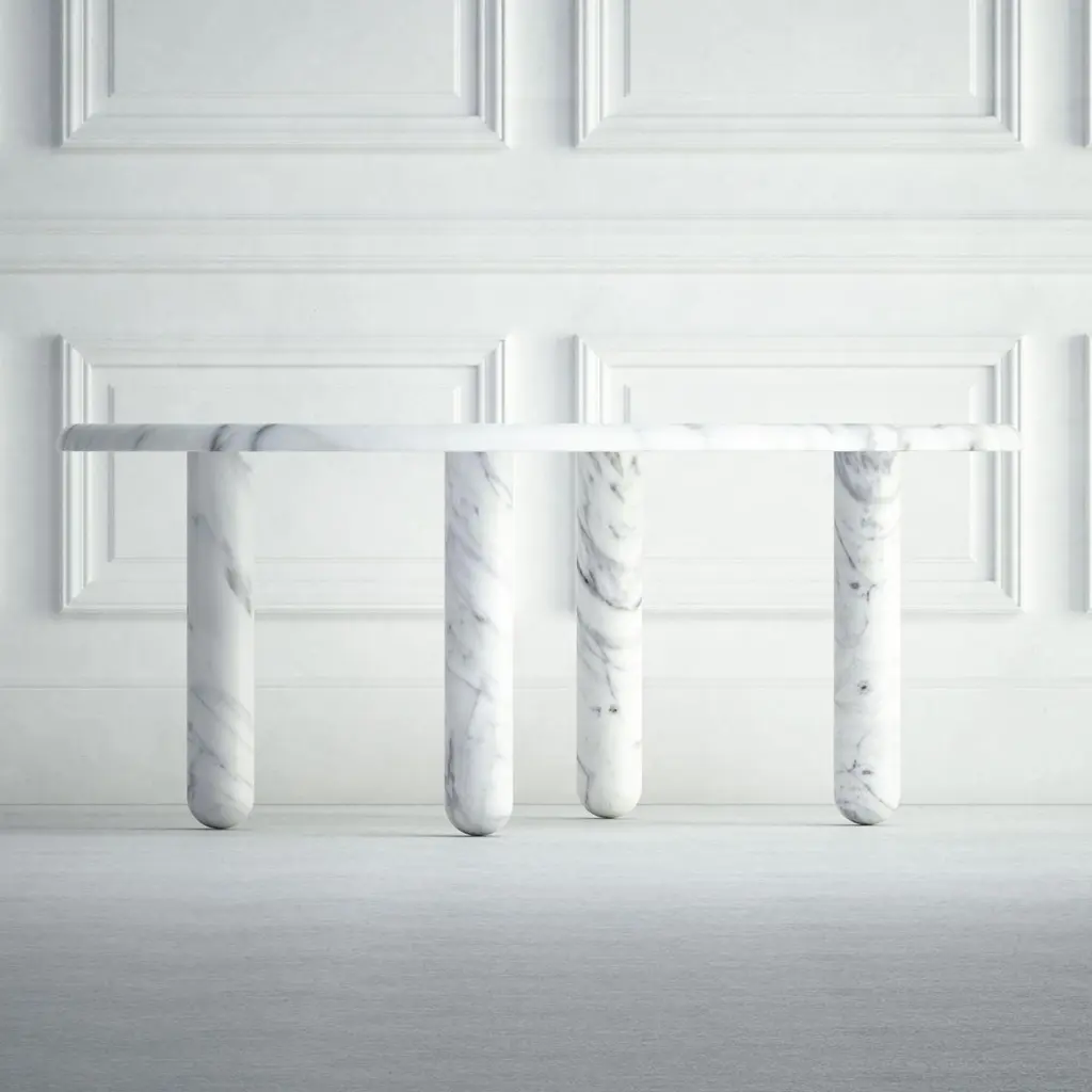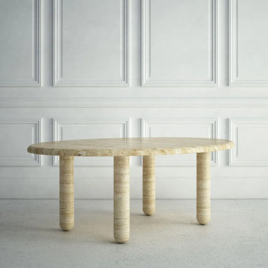The Delphine is a graceful modern dining table. The top is a carved oval-shaped stone slab, with subtle edging. Each of the four legs is carved into a thin, cylindrical shape, with the bottoms of the legs gently rounded. This gives the table a very distinctive, graceful, modern, but fun look. The same stone is used throughout. The table is available in our cream travertine, white marble or black marble - all durable stones that will hold up well with time. This table would work wonderfully well in a modern Dining Room decor.