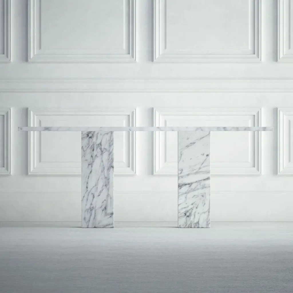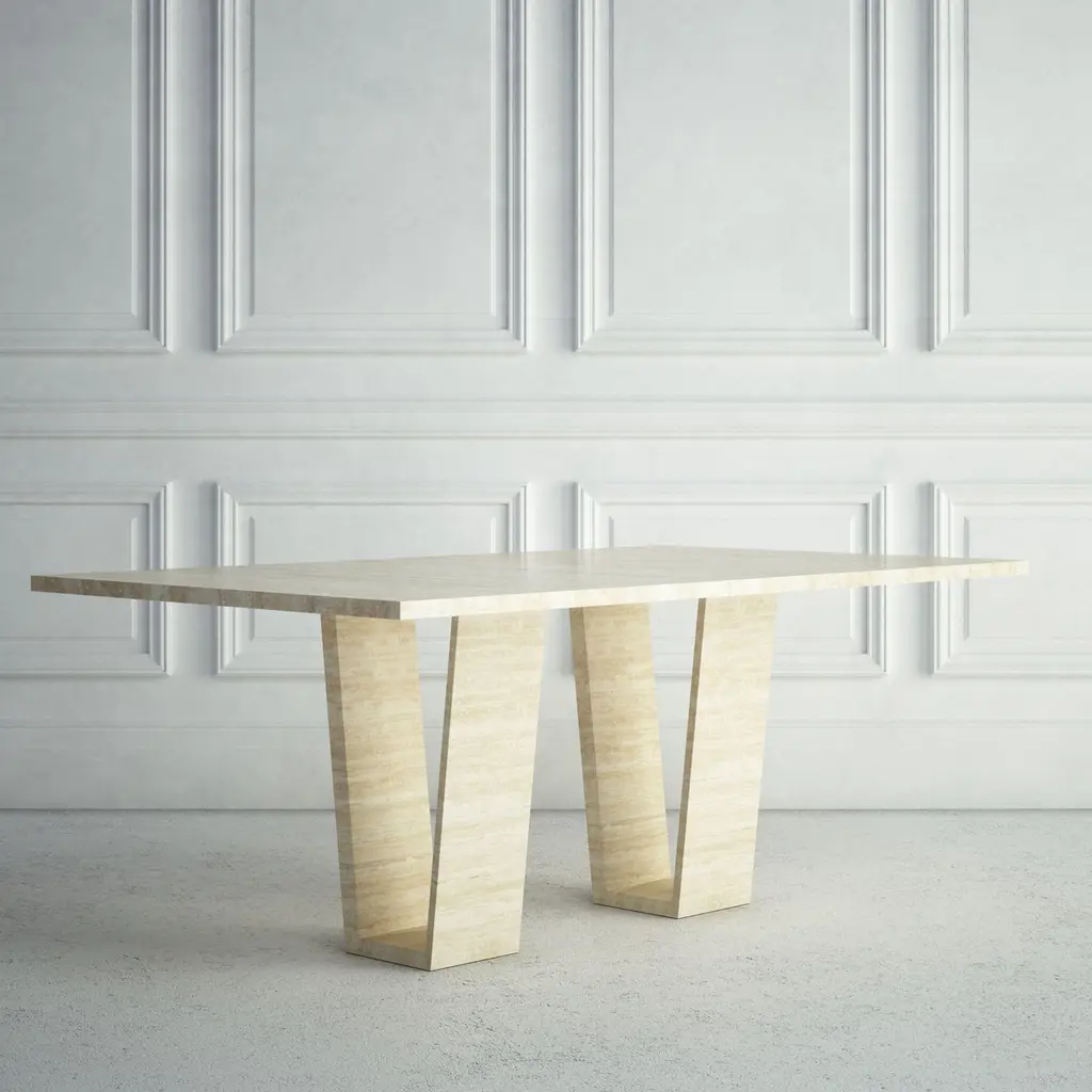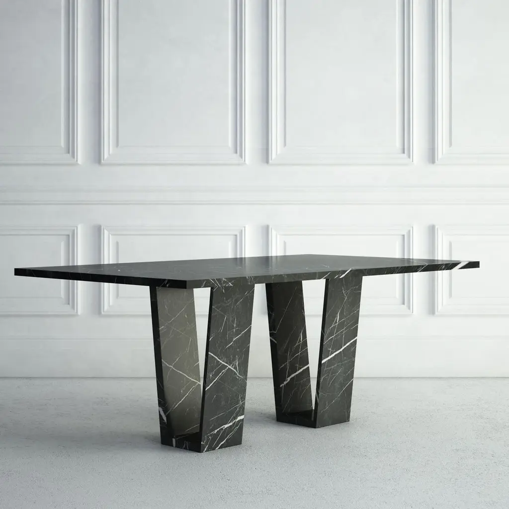 The Elise: A Modern Stone Dining Table With A Rectangular Top And Angled Bases