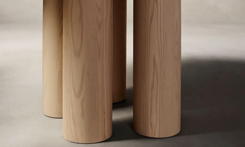 In the Reade Round Dining Table, strong and sculptural forms collide. The design features a circular tabletop and columnar legs, each shaped from solid ash by Amish artisans. Handcrafted in Ohio.