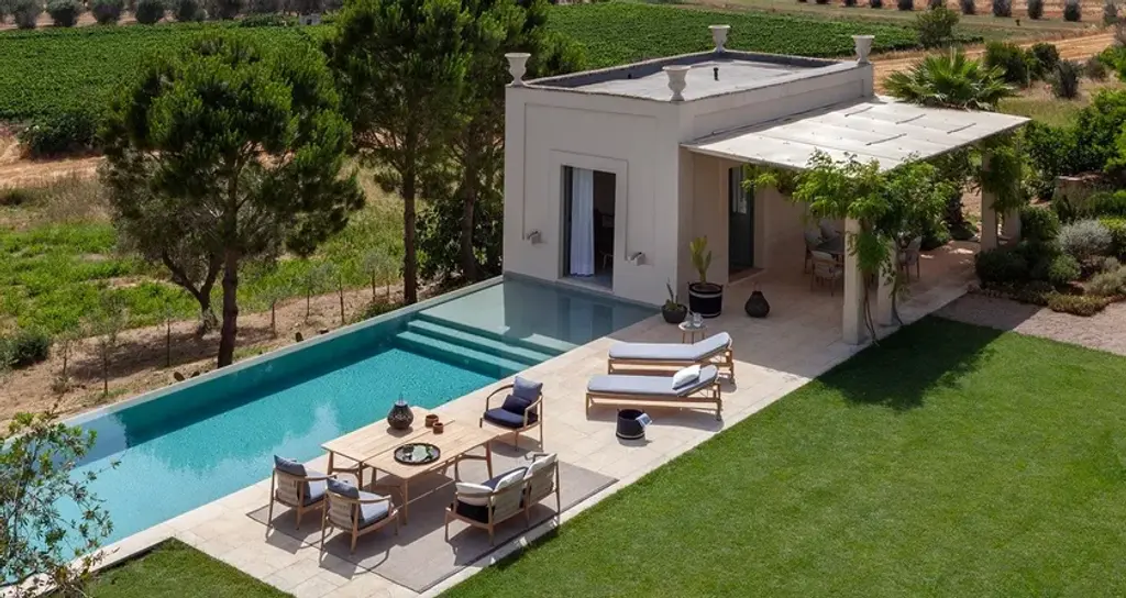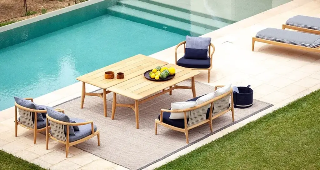 Designed for a more informal dining experience, the outdoor table is generously sized and low in height to match the ergonomic seating of the two-seater sofa and armchairs from The Secret Garden outdoor furniture collection, designed by Roberto Lazzeroni.The frame and top are made of solid teak wood in a natural finish. The top has a staved pattern that reflects a typical motif of older nautical eras. Part of the range offered by Poltrona Frau Boundless Living Outdoor Collections.