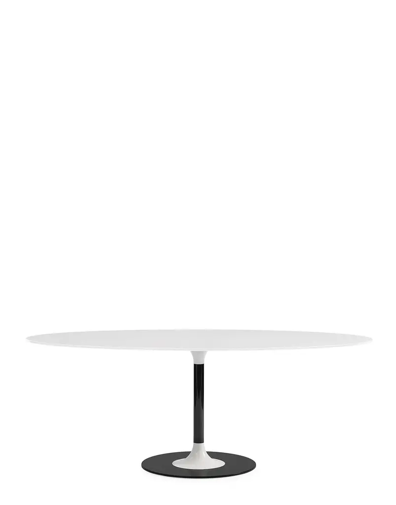 Endless colour, playing with new shapes and sizes. The family of "jewel" tables expands with THIERRY XXL, designed for dining in oval and round versions, completing the series of THIERRY BISTROT, designed for lounge bar atmospheres. The elegant yet cosy mood of the collection plays on a lively range of colours, including grey, burgundy and white variants. A passe-partout furnishing solution for many occasions of use, characterised by metal legs and glass tops in vibrant colours like precious gems.