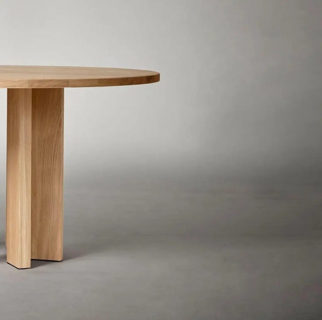 Thola Round Dining Table in European Light Solid Oak by Mokko AmsterdamDimensions: Ø 130 x H 75 cm. Materials: European oak.Available in different material options and dimensions. Designed by Aad Bos and crafted in the Netherlands. Please contact us.Designed by Aad Bos and crafted in the Netherlands out of solid European oak or American walnut. The product is made to order with a production time of 7-8 weeks and customizable in design, size, material and color.We welcome you to our studio to get a feel for the quality and presence of our objects.Mokko represents a collection of interior objects designed by founder Aad Bos. The Amsterdam-based studio was established in 2017 and creates custom products for interior professionals and design enthusiasts internationally.Objects by Mokko feature a rhythm of monolithic form, created through an iteration of volumes and voids. Architectural elements are balanced, weighed and stripped from excess, until the essence of the inspiration is translated into a sculptural object that is emotionally resonant.With respect for nature and robust furniture building, each piece is made in close collaboration with local carpenters in the Netherlands from high-quality, sustainable materials. All objects are custom-made and conceived as future heirlooms; intended to be valued, used and passed down through generations.