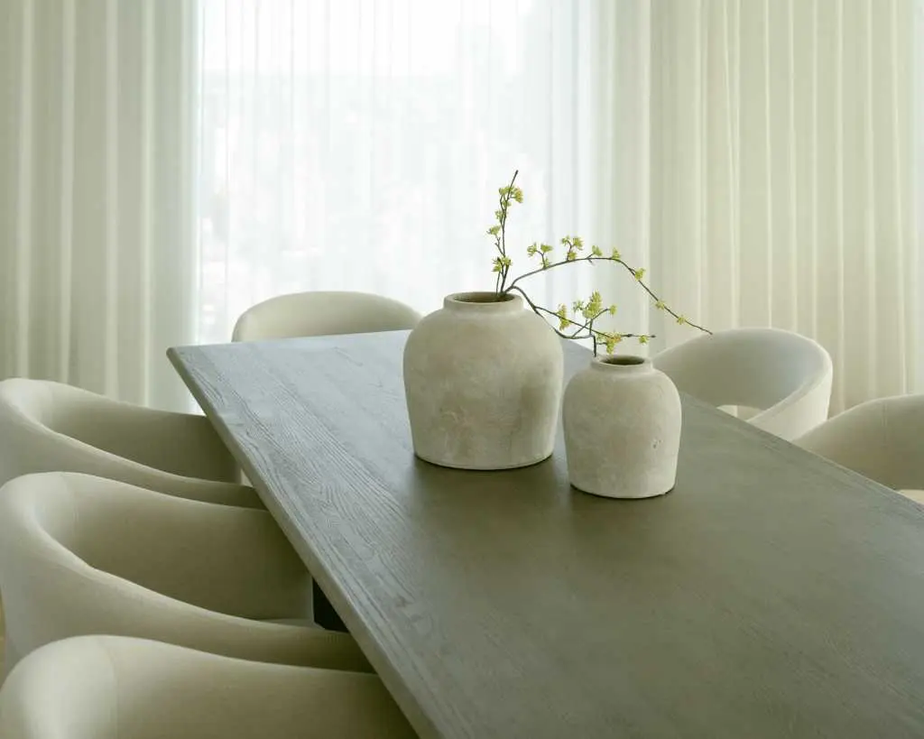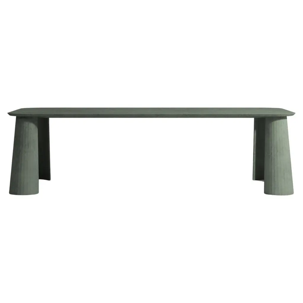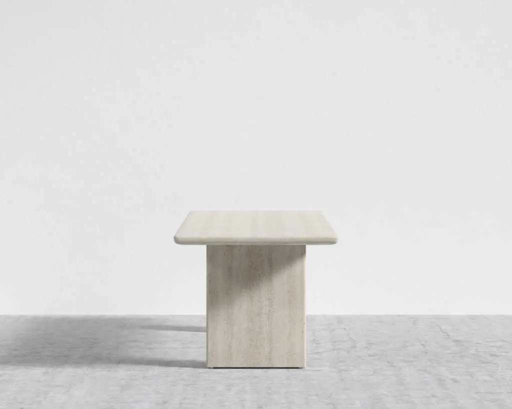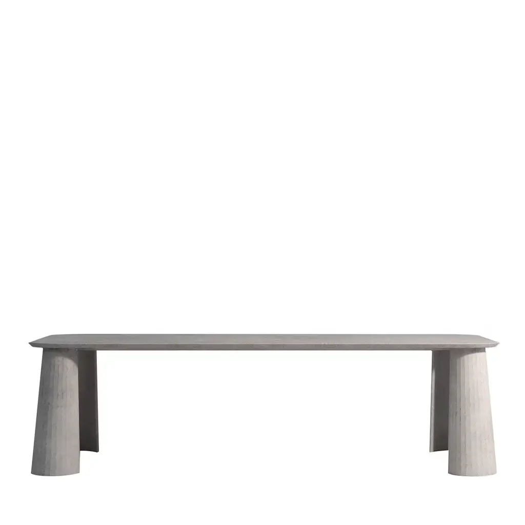 Indulge in the exquisite elegance of the Tiberius Dining Table. Borrowing elements from Roman architecture, the grand, monumental silhouette of the Tiberius is meticulously crafted to evoke a sense of timeless elegance. This statement piece is available in two distinct finishes, each with its own unique allure. Choose the sophisticated white travertine in a refined 82" size, or opt for the grandeur of the 95" grey oak, crafted from 100% solid wood. Both sizes offer a striking dining experience and serve as stunning centerpieces for any dining space.