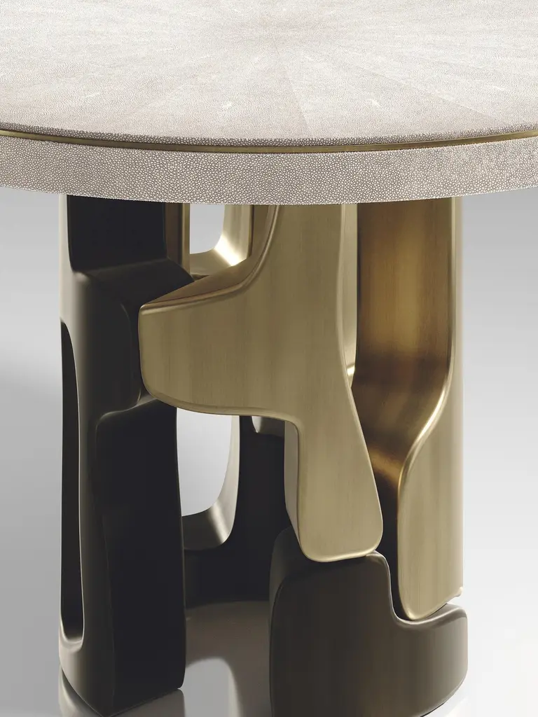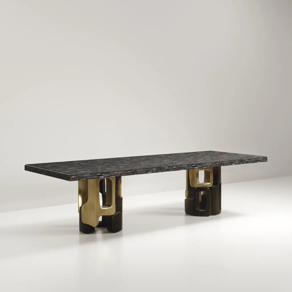 The Paris based label has distinguished themselves since their launch, with their iconic use of shagreen mixed with brass and other exotic materials. All furniture is handcrafted by skilled artisans, ultimately making each piece unique, designed in Paris and produced in the Philippines.The Apoli I Dining table by Kifu Paris is both dramatic and organic in its unique design. The stunning semi-precious Tiger Eye Blue top sits on a pair of geometric and sculptural bronze-patina brass bases. This piece is designed by Kifu Augousti the daughter of Ria and Yiouri Augousti. Part of the Apoli Capsule Series, see images of collection at end of slide.The dimensions of this piece are 118.11 x 43.31 x 29.53 inchesAll Kifu Paris pieces are handmade by artisans, ultimately making each piece unique.Custom color/sizing is available on request.Wipe clean with a soft dry cloth.Although inspired by her parents, her collection of Home Accessories and Furniture is a distinct identity of its own. Kifu uses handmade techniques of elaborate inlay patterns of shagreen, shells, semi-precious stones, materials she experienced as a child growing up in her parent’s studio, but interpreted in a younger quirkier way reflecting her youth. From her "jewelry inspired knobs" on decorative boxes, gold bar boxes and an extravagant inlay pattern mix of shagreen and shell inspired by galactic constellations, as seen on her enormous round mirror, is refreshing to see. Kifu embodies whimsical elements throughout her collection and is not afraid to be daring and unexpected in her approach to design.All shagreen-covered items should be kept out of direct sunlight, and color variants may occur on the stingray and other exotic finishes, but this showcases the Parisian label's commitment to creating authentic luxurious products using natural components.
