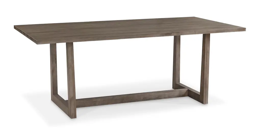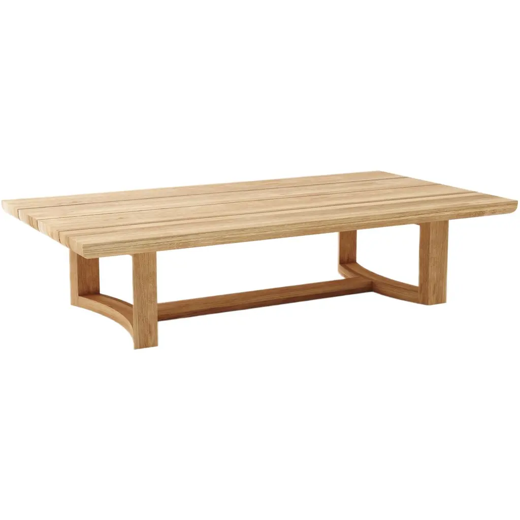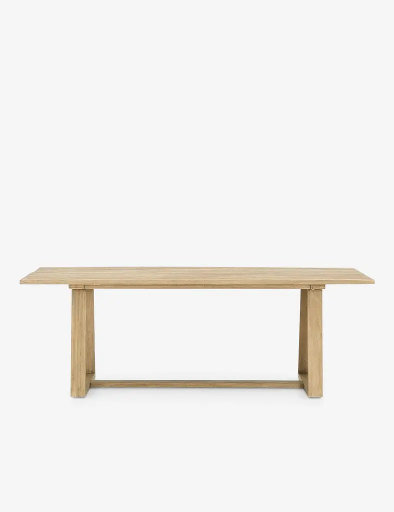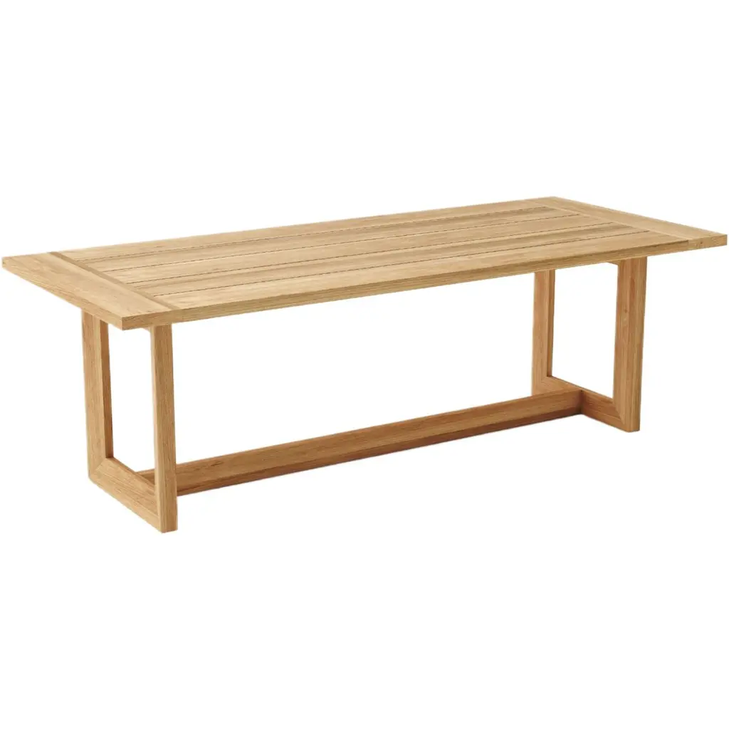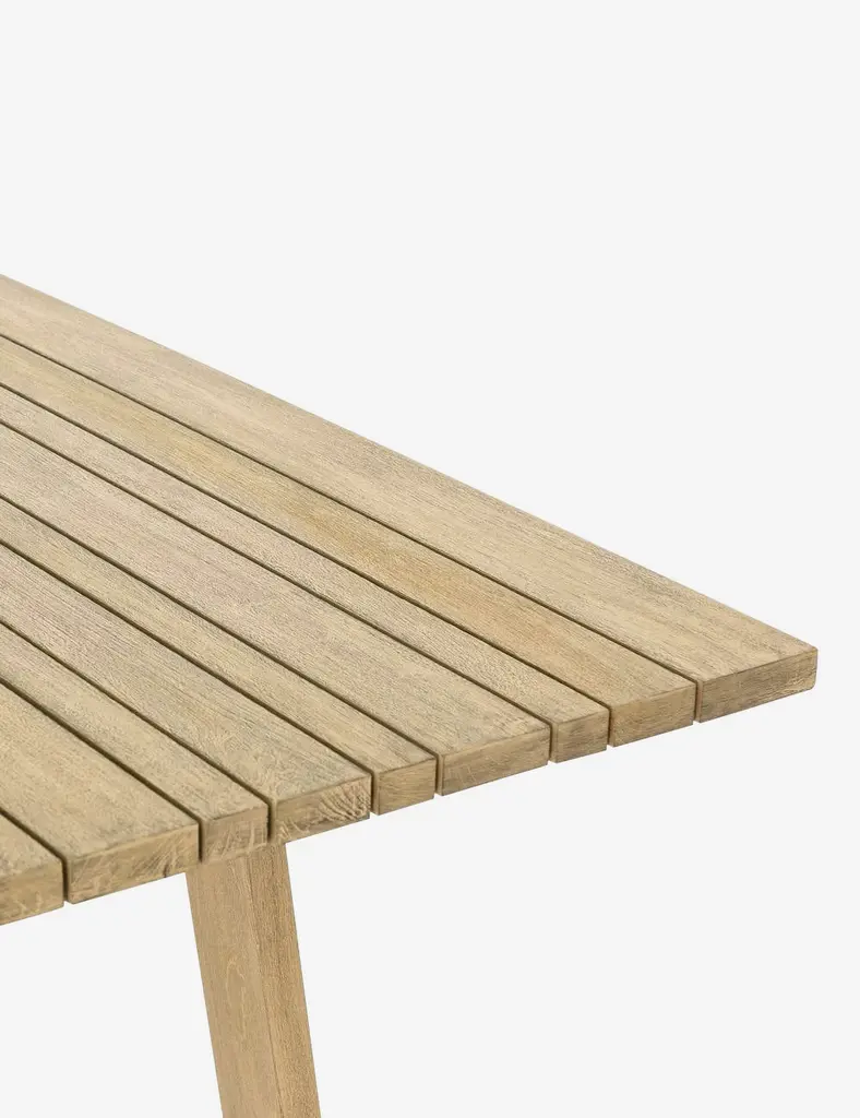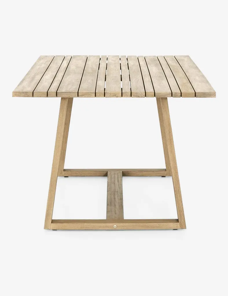 Outdoor dining just got a stylish upgrade. This wood table features a modern look with a slatted rectangular top and angled legs.
