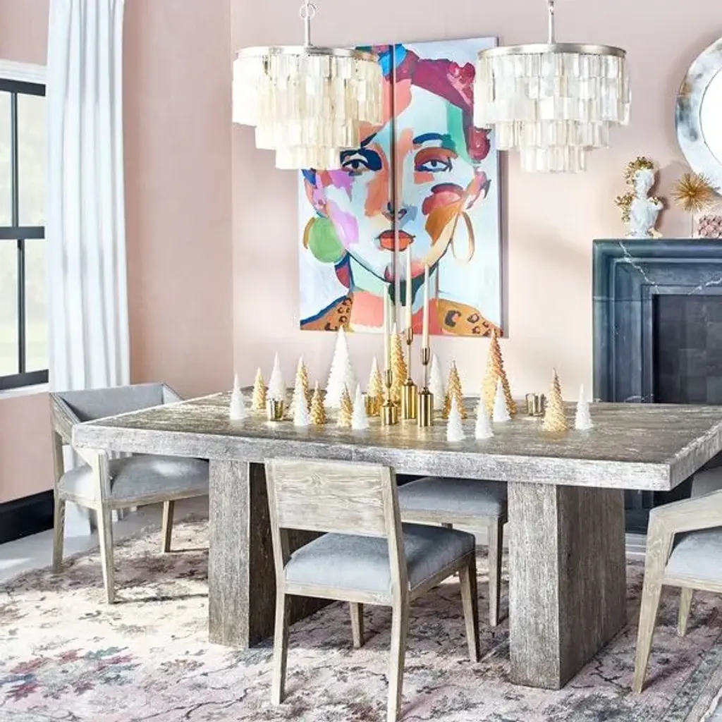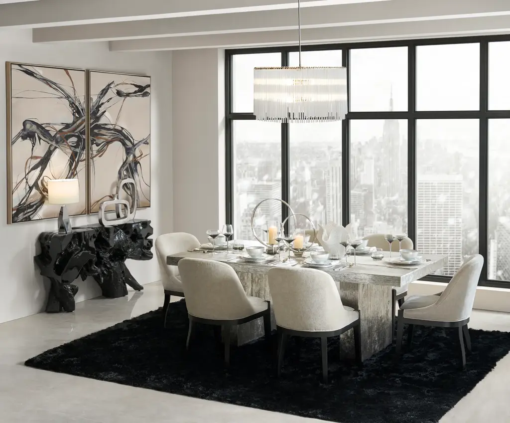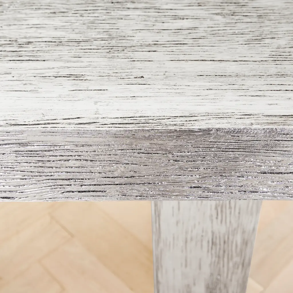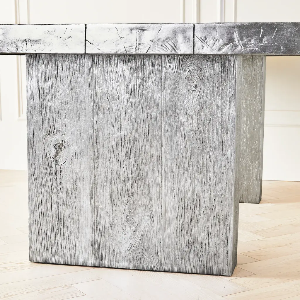 Our Timber Dining Table is constructed of resin which is cast from reclaimed old oak beams from the Baguio region of the Philippines originally used as railroad tracks. A multi-step, hand-applied process is used to achieve the luster. 84"W x 44"D x 30"H Net weight: 141.7 lbs. Seats up to 6 guests comfortably. Z Gallerie exclusive.