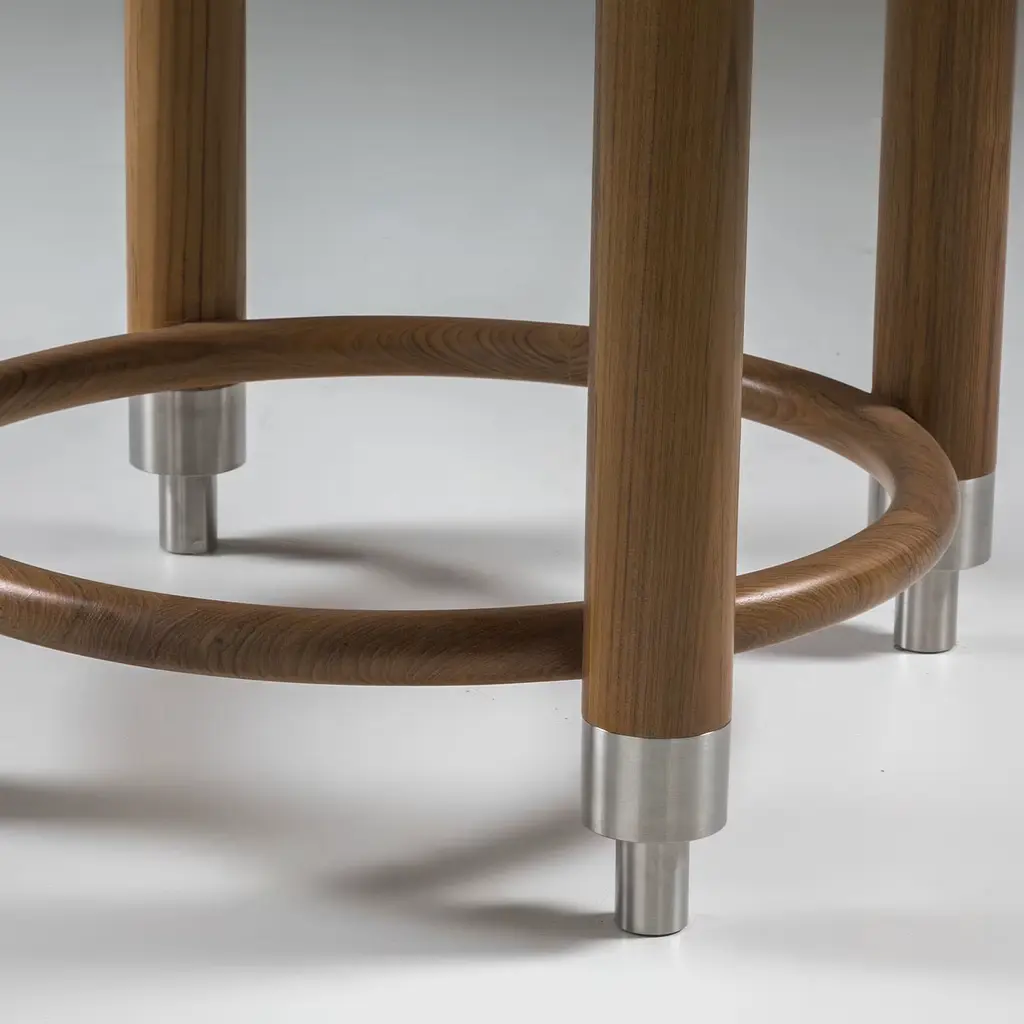 A spot-on solution to gather guests around for a relaxed meal on a patio, this round table in fine Iroko was conceived for fitting outdoor needs both in terms of aesthetics and functionality. Stainless steel details - immediately detectable in the cylindrical feet - neatly contrast with the warm Iroko structure, incorporating a ring at the base and welcoming a bright stoneware tabletop.