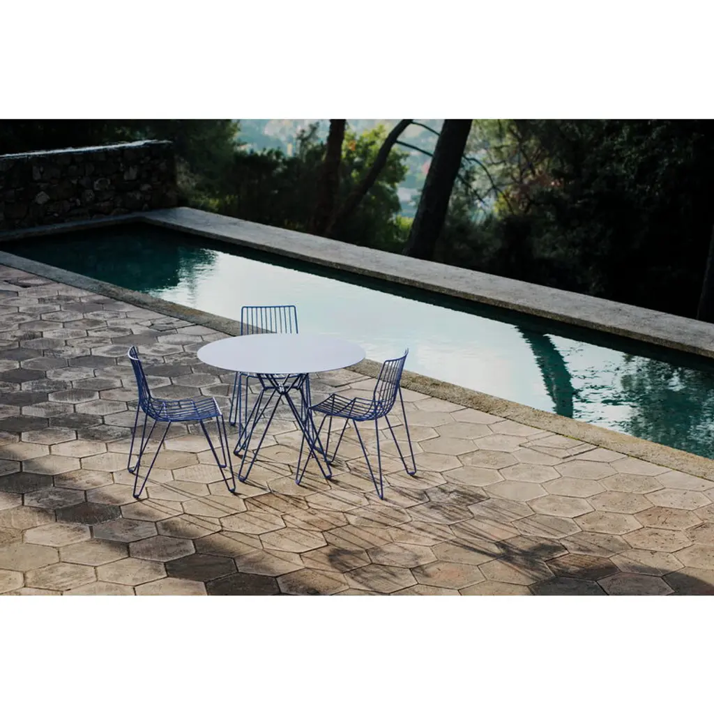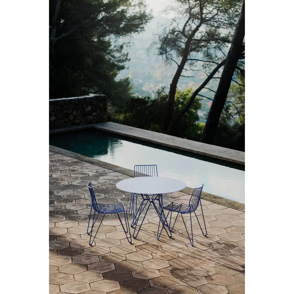 The Tio table by Massproductions is an elegant dining table suitable for both indoor and outdoor use. Gracefully supporting the round metal tabletop, Tio’s frame is made from galvanized steel wire with a refined powder coating, giving the table its distinctive light and airy look. Designed by Chris Martin, the sophisticated Tio collection is a timelessly beautiful choice for both the dining area and the terrace, indoors and out.