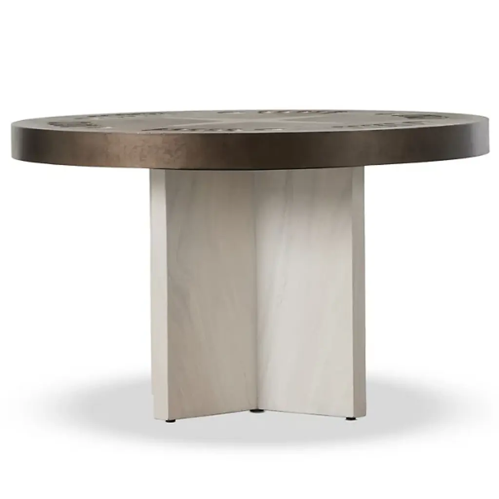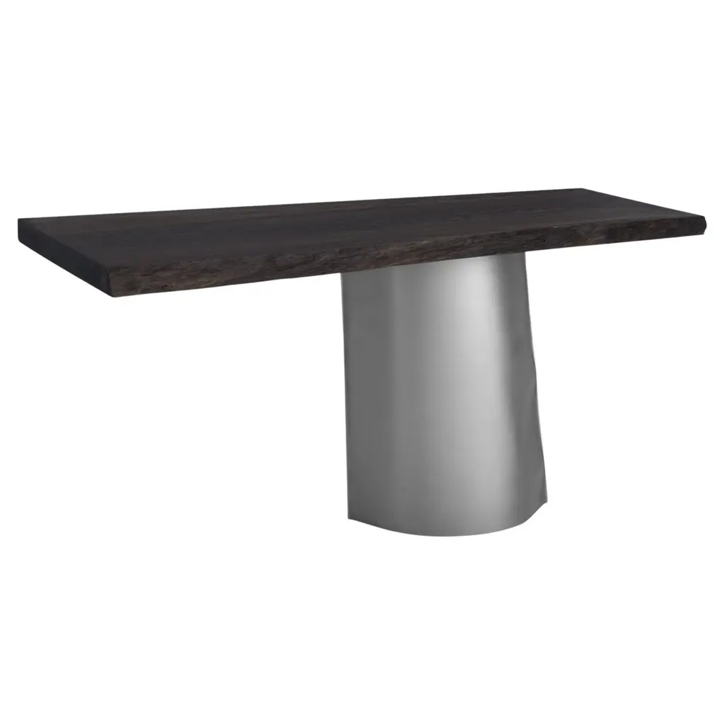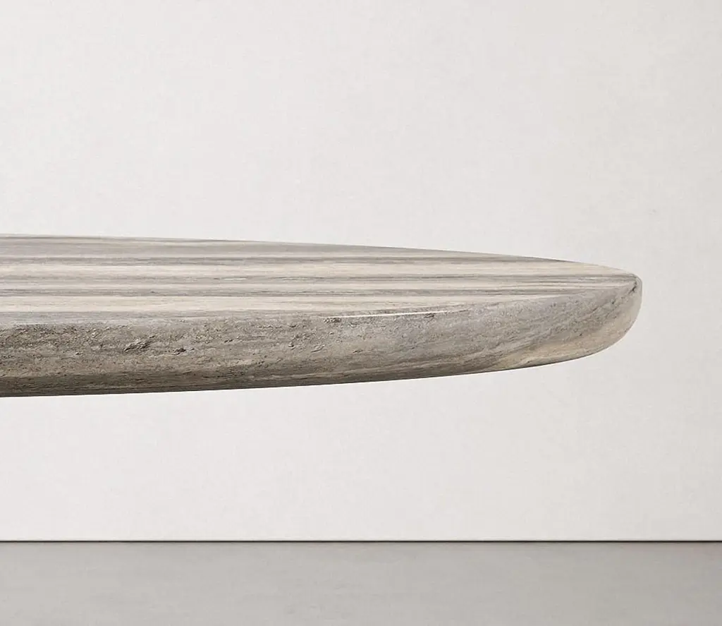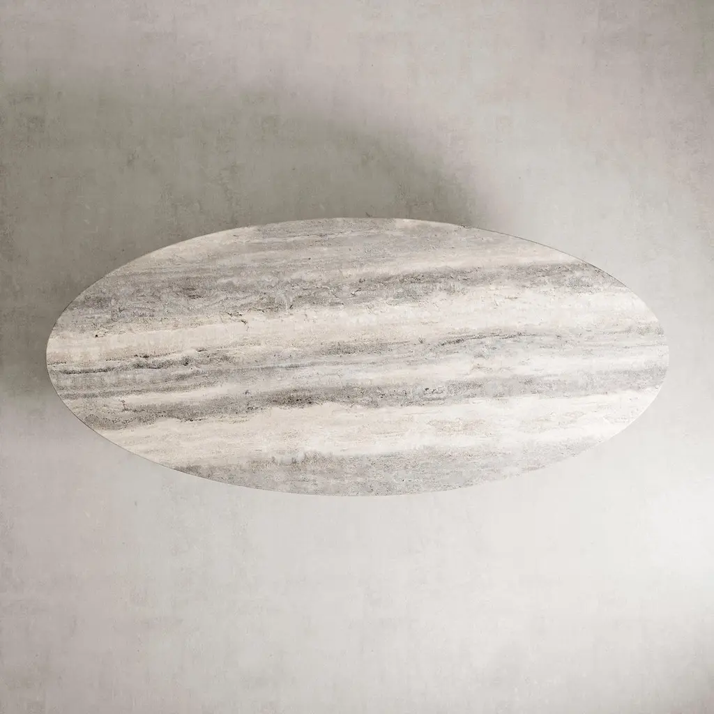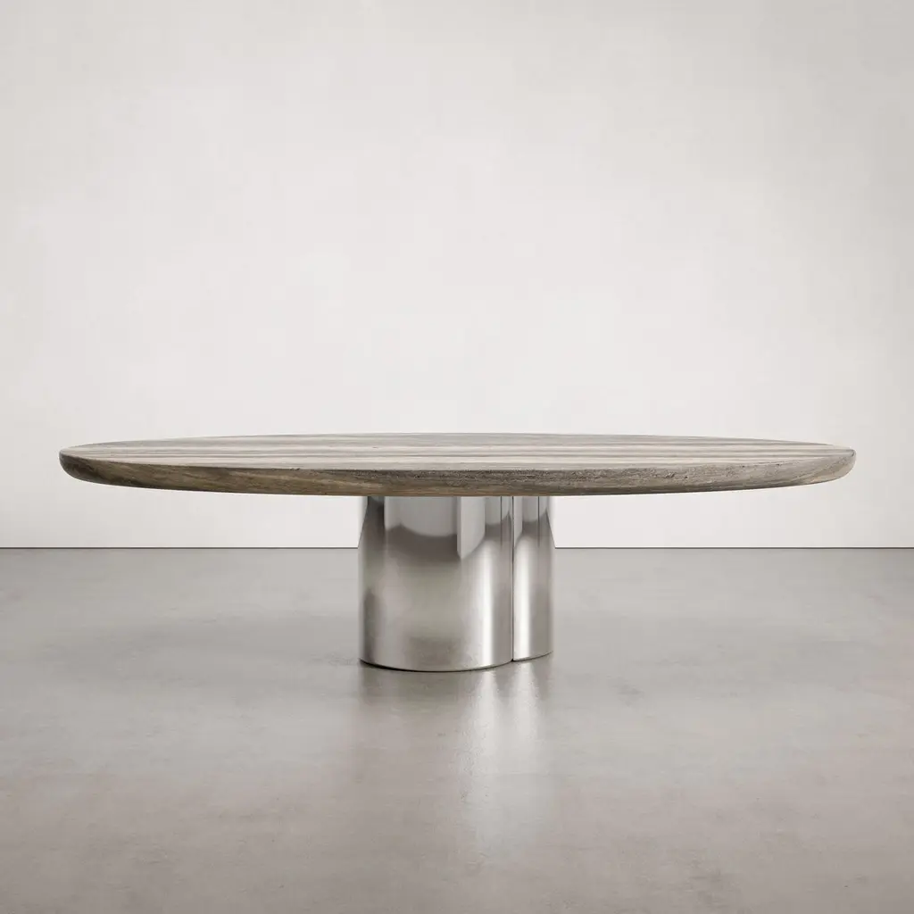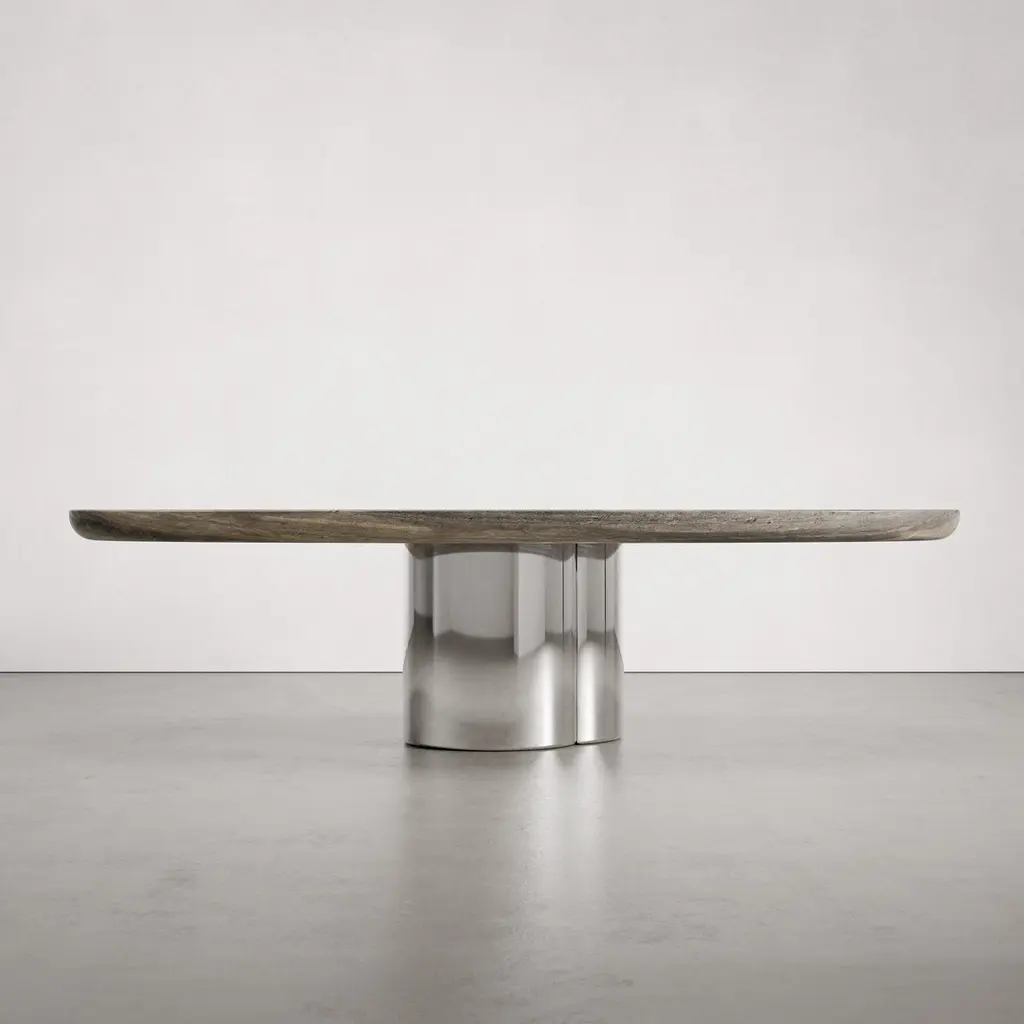 Tomoon 2.0 Dining Table by Verena BrauschDimensions: D 130 x W 290 x H 75 cm.Materials: Silver travertine, stainless steel.Verena Brausch brings new energy and singularity of purpose. Her primary motivation comes from her desire to create a better world for the next generation, a world in which environmental concerns are at the forefront of design work, balanced with purism, aesthetics, and excitement. This is the future she is determined to shape.Her love of ideas, her desire to challenge the status quo, her ambition of going new ways, her determination to use technological innovation to design new products, and her concern for environmental implications have accompanied one exciting creation after the other.Verena Brausch was born in Munich. After earning a degree from Munich Design University in Transportation Design, she worked in top design studios such as Adidas, BMW and Mercedes-Benz. She started her own brand VERENA BRAUSCH in 2022 in Paris.Her work spans a broad range of projects and scales, from interior design, architecture as well as industrial design and the development of unique furniture and lighting design. The perfect match between form, materials and colours is the driving force behind the conception of her projects. She is inspired by the interaction between these disciplines combined with a pure and exciting design attitude, constantly striving for perfection.With respect to context and tradition, she has worked on the highly acclaimed new luxury interior design of Mercedes-Benz cars, on iconic smart show cars and on the new Daimler corporate identity ‘Silver Look’. The scope of her projects is evidenced by her collaboration with well-known architects on lighting and furniture design for luxury apartments as well as fashion lines for high-end brands.She is proud of developing concepts to combine aesthetics and technological innovation with creative intelligence. She looks forward to uniting design skills with other industries’ insight to shape extraordinary designs.