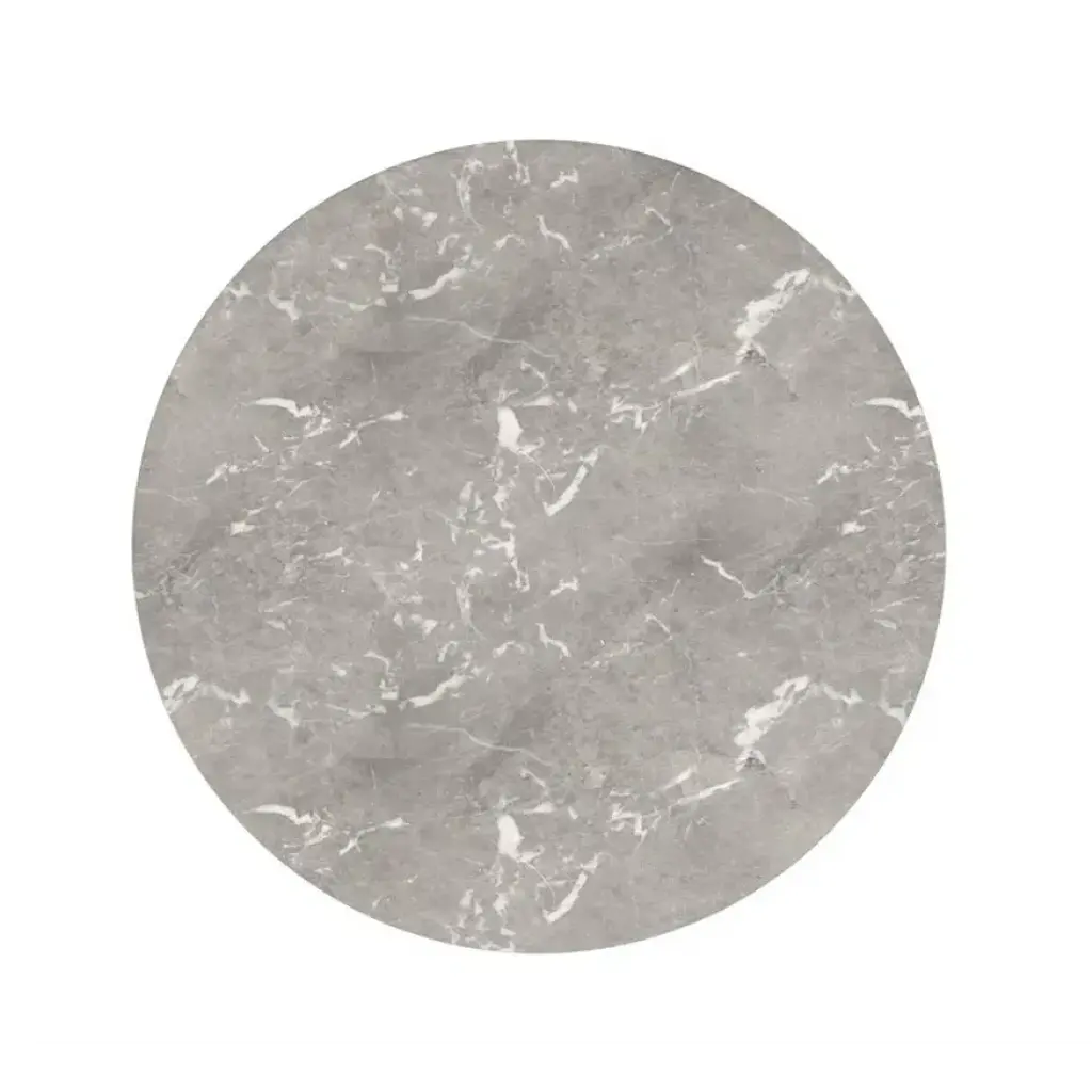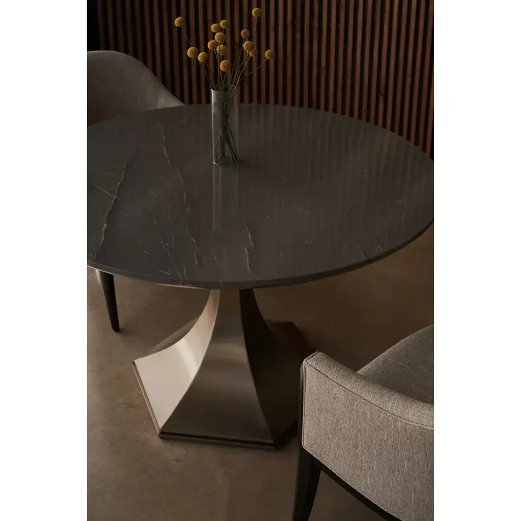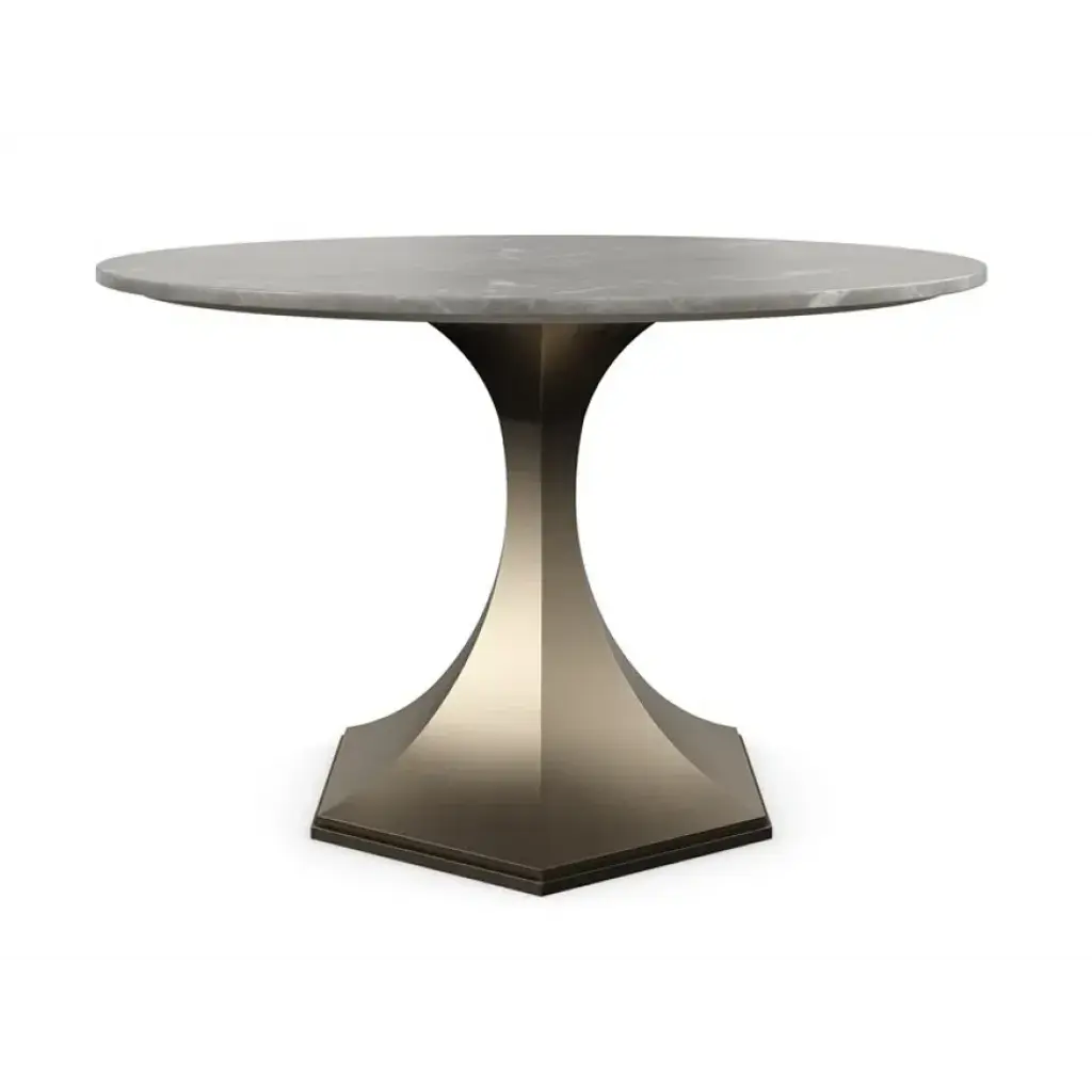 Rising to the occasion in any interior, this 48” pedestal table is well-scaled for an entryway, library or smaller dining space. Features a luxurious, yet durable, grey sintered stone top with the classic look of veined marble, perfectly poised on a cinched fluted base in a Brushed Antique Brass finish. Accommodates up to six seats when styled as a dining table.