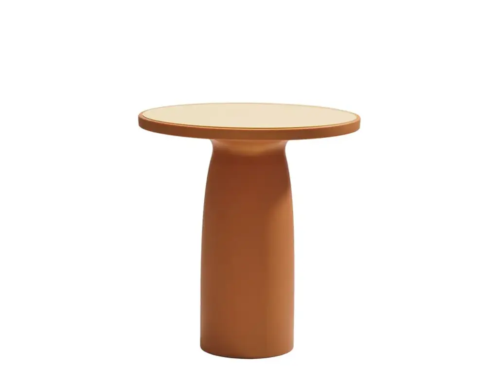 Toto is a round dining table in polyethylene with a height of 75 cm and a 70 cm diameter integrated top made in glass.The Toto Tables collection is based on the concept of a pillar shaped leg in recyclable polyethylene which allows a variety of combinations with different tops. The table tops are crafted from various materials: glass, HPL, stoneware, or durat and have different dimensions. All the products are suitable for indoor and outdoor use.