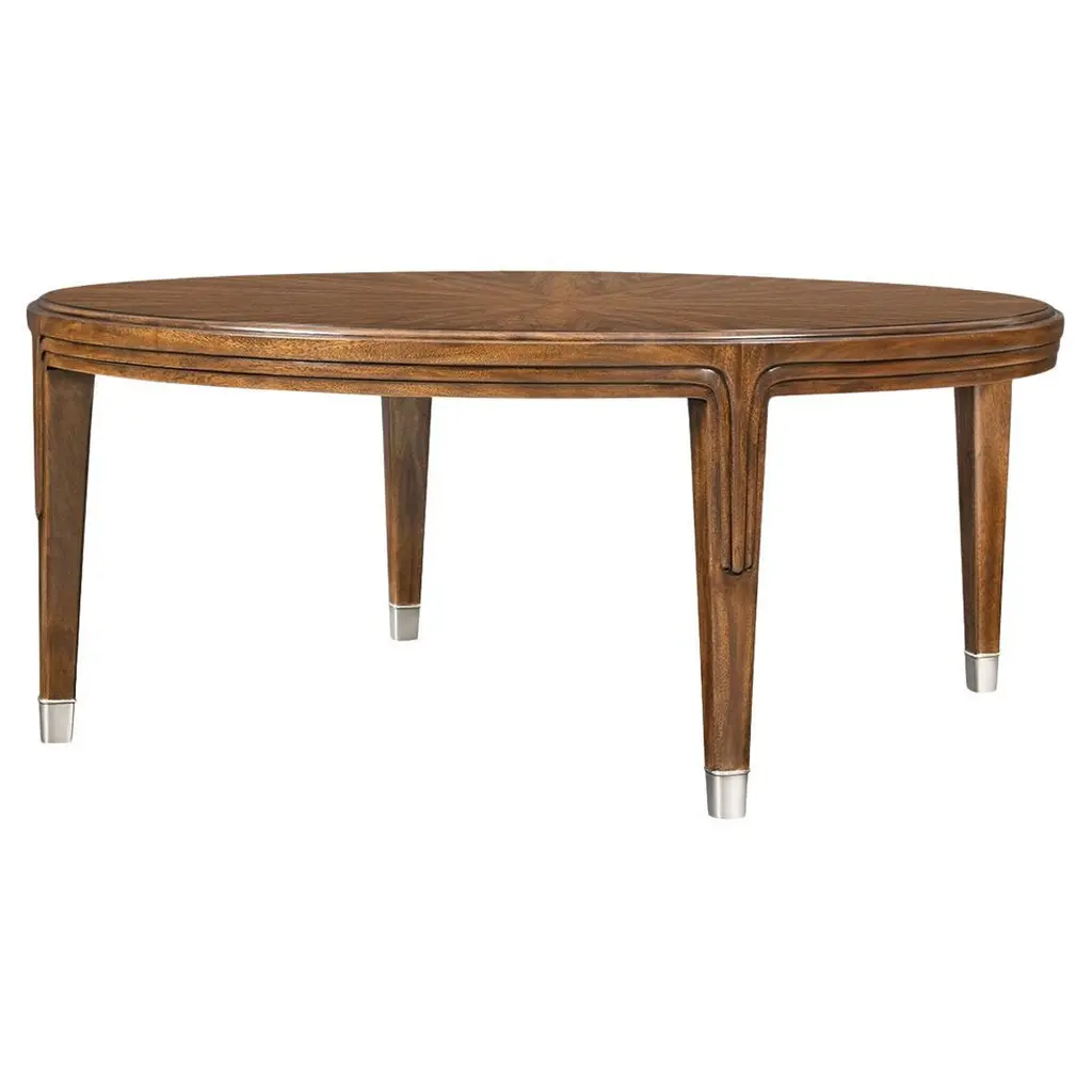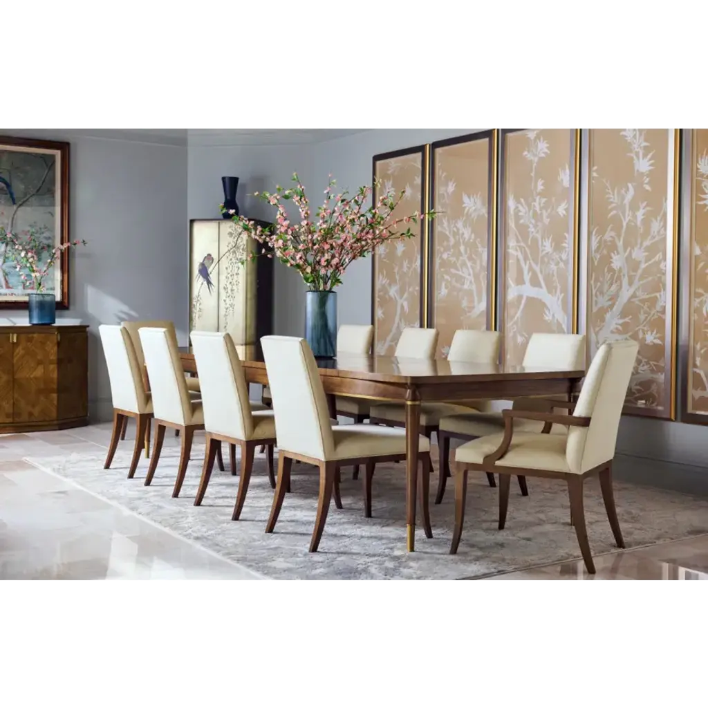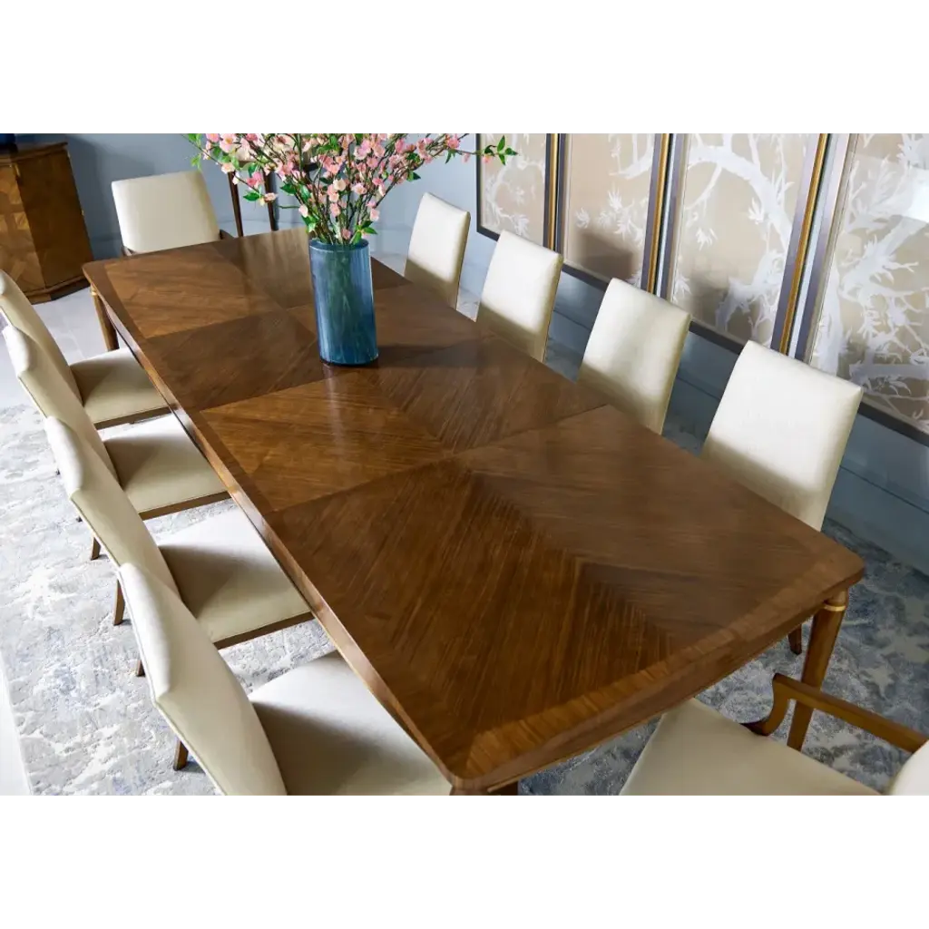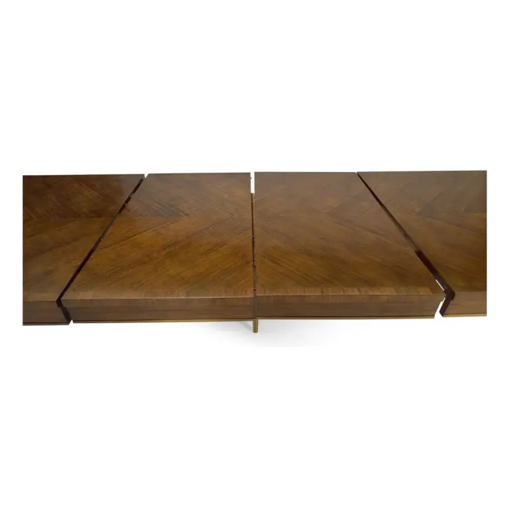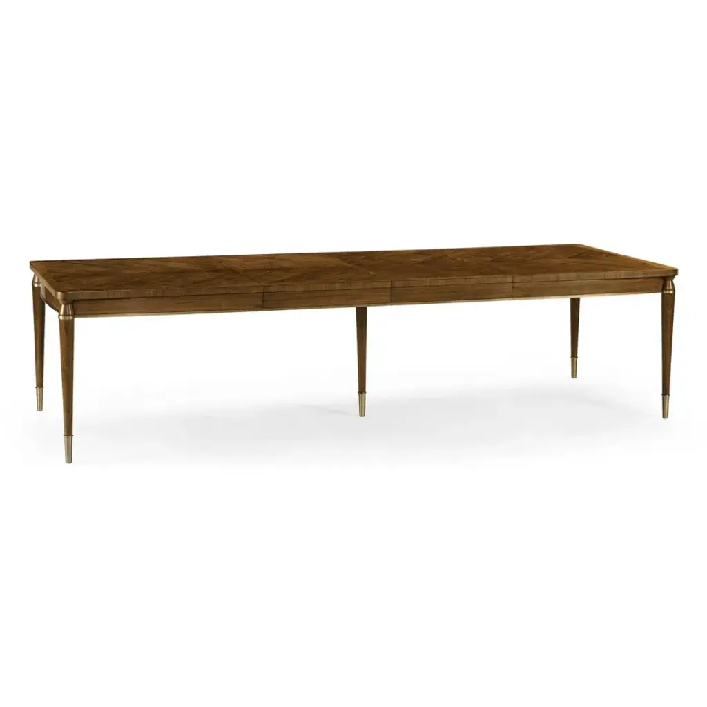 500348-120L-WTL This dining table features figured walnut veneer in a book matched pattern reminiscent of straw work. Brass hardware is cast in the Jonathan Charles foundry where it is acid dipped and hand rubbed to achieve a rich natural patina. This table has two leaves to accomodate up to ten guests.