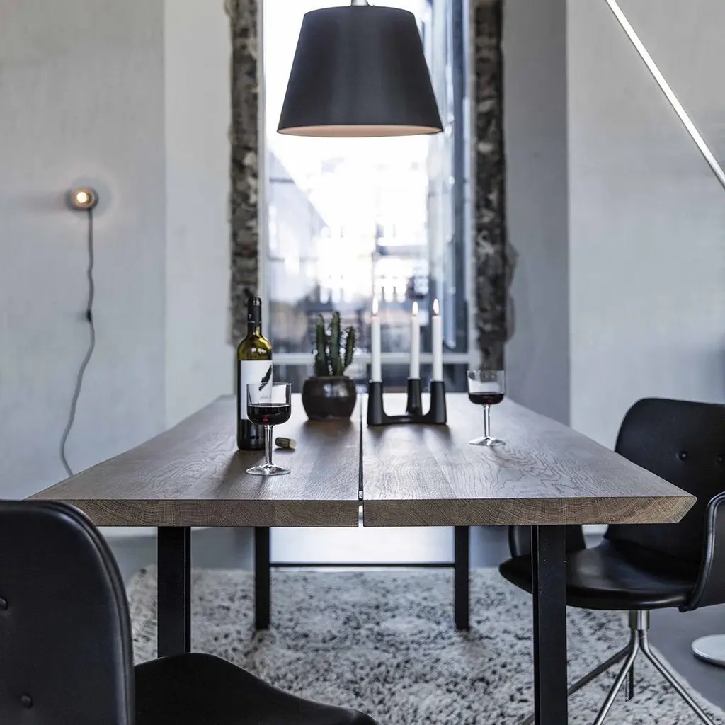 Track is a plank table of genuine materials in an industrial style, without seeming too rough or owerblown for a private home. We customize the length so it fits your dining room. The table top consists of two broad oak planks that rest across black iron profiles normally used for construction work in heavy industry. The choice of material bears a resemblance to railway tracks, leading to associations with both dynamism and extreme durability.