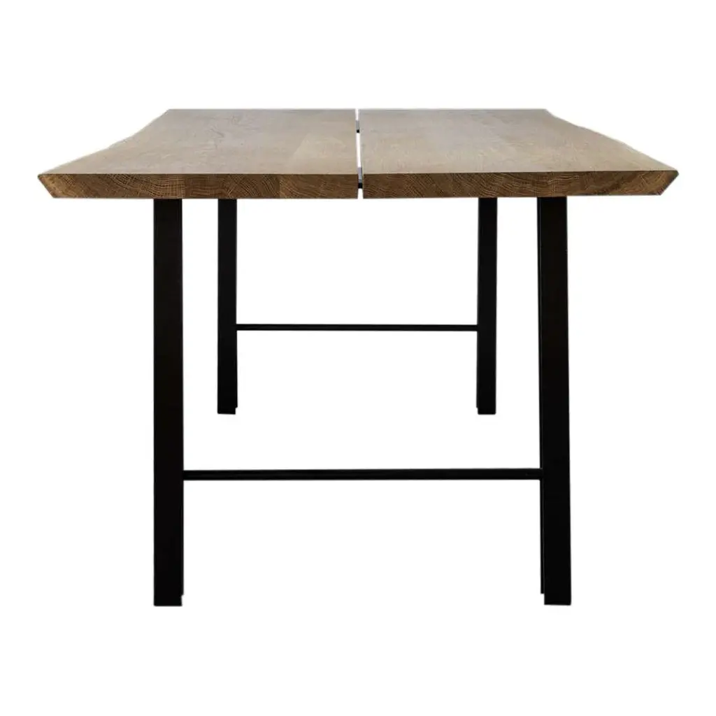 Track is a plank table of genuine materials in an industrial style, without seeming too rough or owerblown for a private home. We customize the length so it fits your dining room. The table top consists of two broad oak planks that rest across black iron profiles normally used for construction work in heavy industry. The choice of material bears a resemblance to railway tracks, leading to associations with both dynamism and extreme durability.