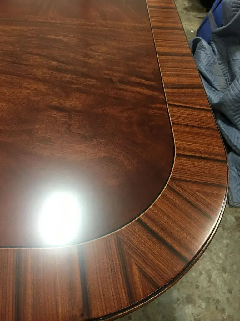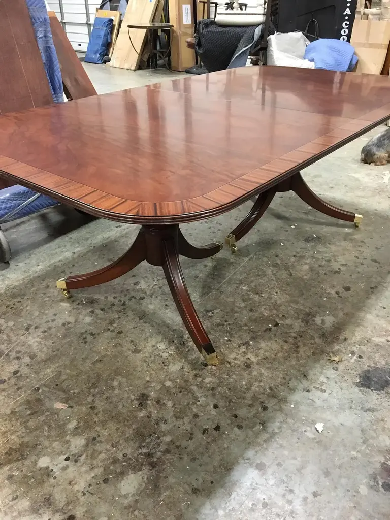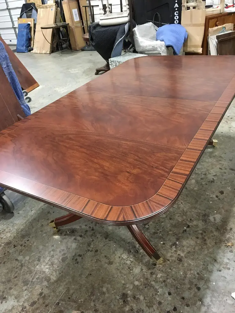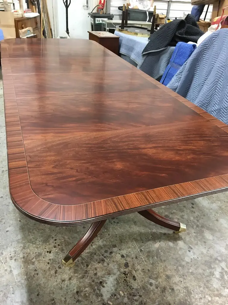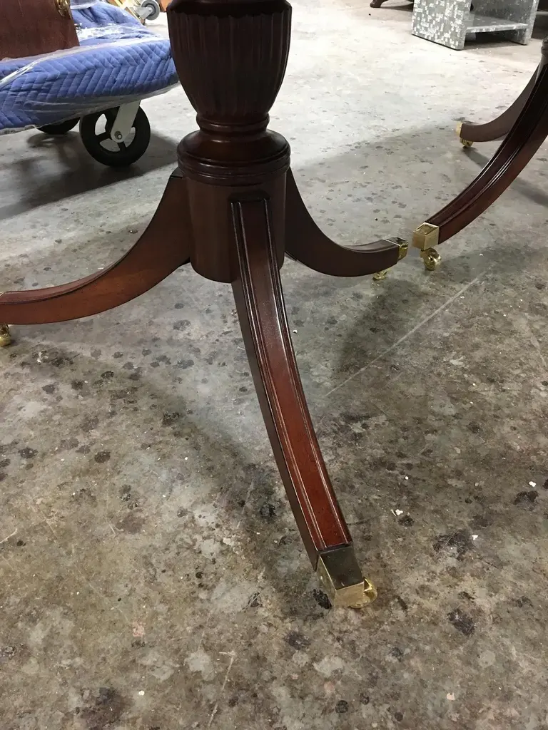 This is a made-to-order Traditional mahogany dining table made in the Leighton Hall shop. It features a field of slip-matched swirly crotch mahogany from west Africa and a Pau Ferro border from South America. It has a medium brown mahogany color with a hand rubbed and polished semigloss finish. The Sheraton-style pedestal legs terminate with solid brass toe caps with casters. Dimensions: 48 in. x 88 in. With two 24 in. Leaves (total length with leaves inserted is 136 in.) Estimated production time is 60-90 days.