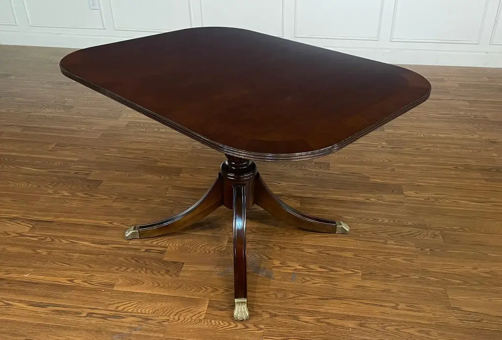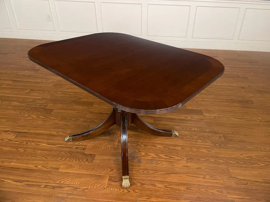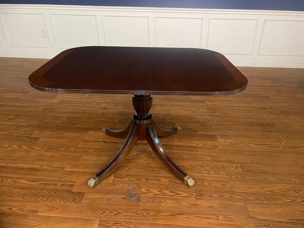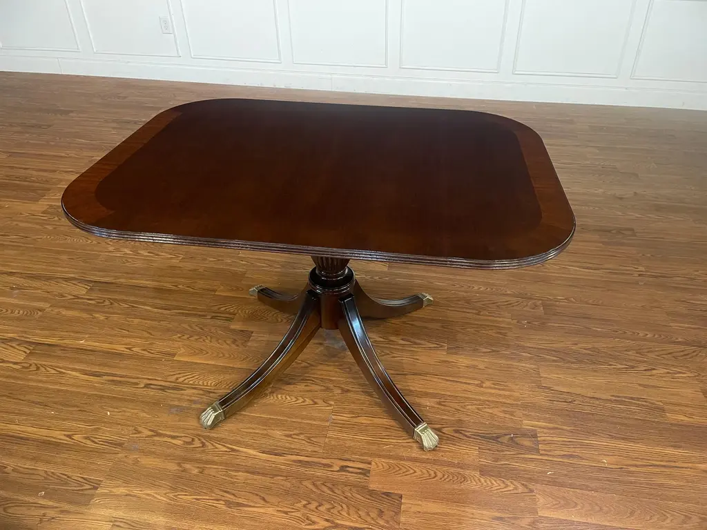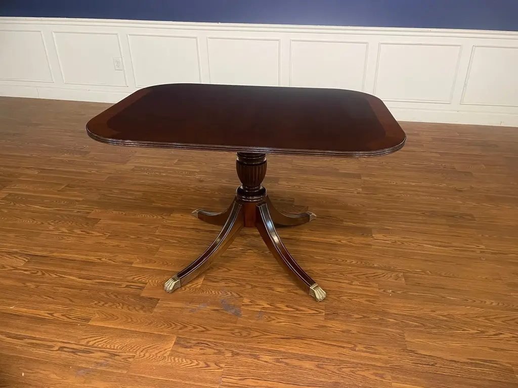 This is a mahogany breakfast table made-to-order in the Leighton Hall shop in Suwanee, Georgia. It is very versatile and can have multiple uses. It can be used as a breakfast table, game table, foyer table, writing table, or dining table for a small area. It features a top of cathedral mahogany with a straight grain mahogany border. The edge features a solid mahogany three beaded edge. It has a dark brown mahogany stain with a hand rubbed and polished semigloss top. The pedestal is a traditional four leg pedestal with a fluted urn carved center column and fluted legs which terminate with antique brass lions paw feet. Dimensions: 48”wide, 36” deep and 30” high.