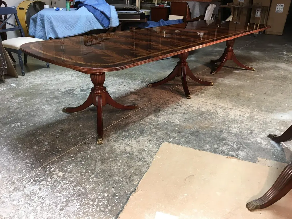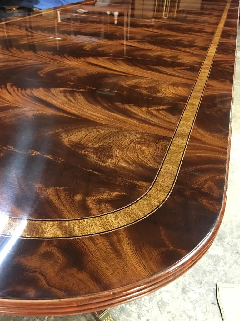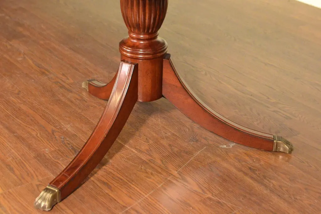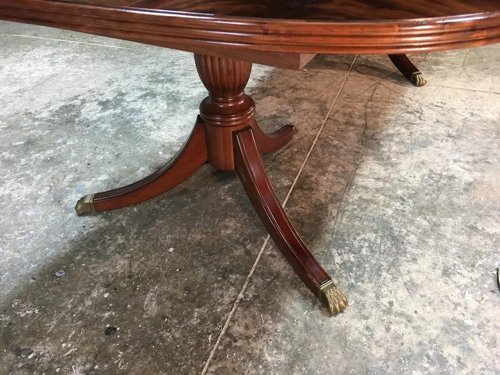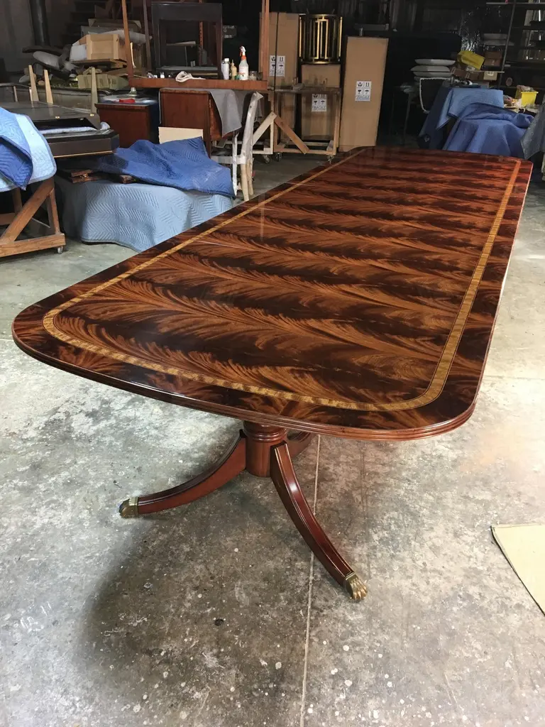 This is a made-to-order Large Traditional mahogany banquet/dining table made in the Leighton Hall shop. It features a field of slip-matched swirly crotch mahogany from west Africa with a satinwood inlay and a crotch mahogany border. It has a hand rubbed and polished semigloss finish. The end pedestals have three fluted legs and the center pedestal has four fluted legs. Each leg terminates with antique brass lions paw feet. Dimensions: 50 in. x 84 in. with three 24 in. Leaves (total length with leaves inserted is 156 in.) This table can be purchased as shown, or it can be customized to you desired size and design. We can make you a bench-made, one-of-a-kind table in our shop to your specifications. Various lengths and widths are available. Available with 2 (132 in. total length), 3 (as shown), 4 (180 in. total length) or 5 (204 in. total length) leaves. Other options available. Price will vary depending upon options. Estimated production time is 60-90 days.