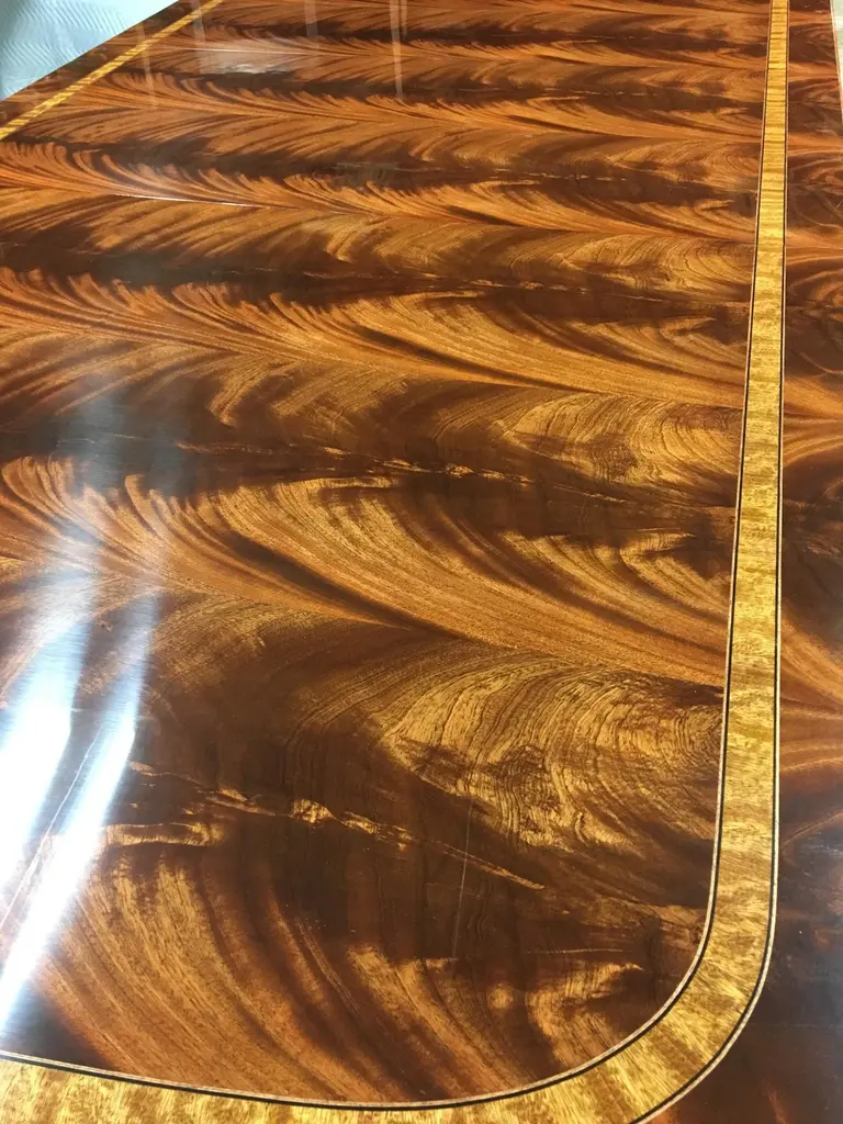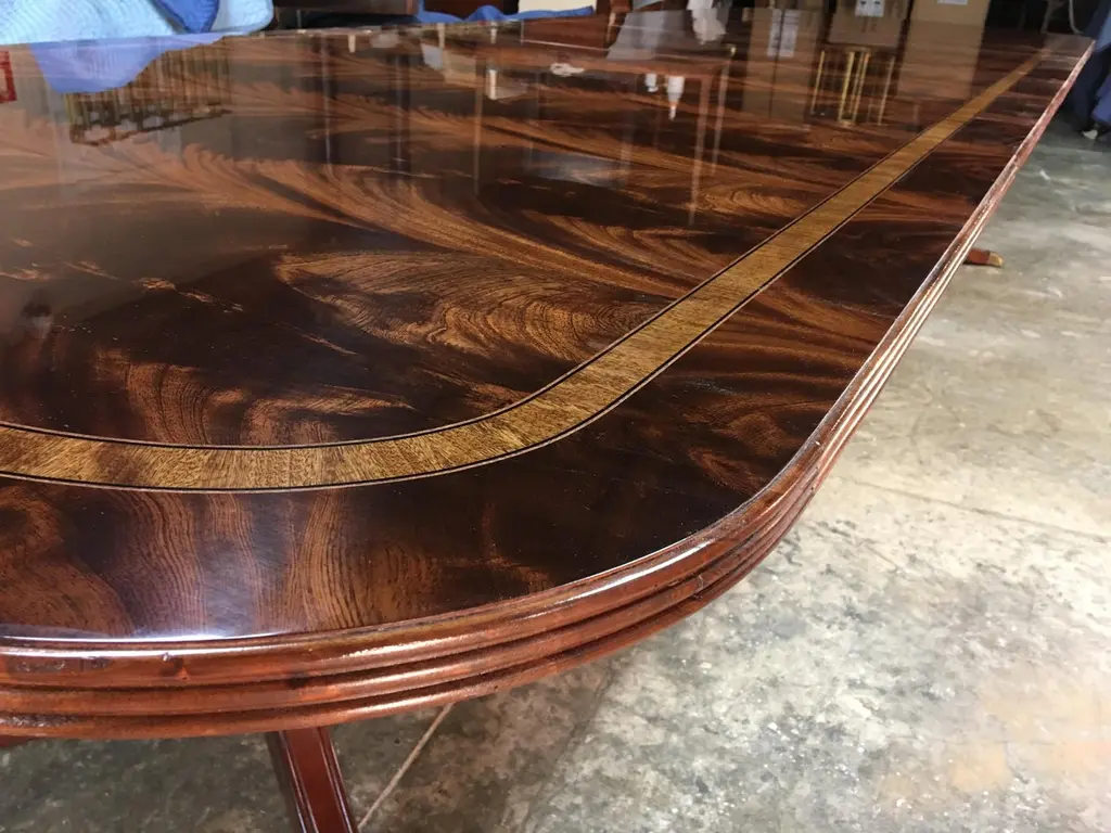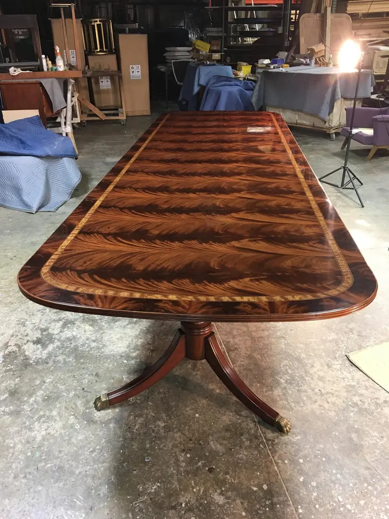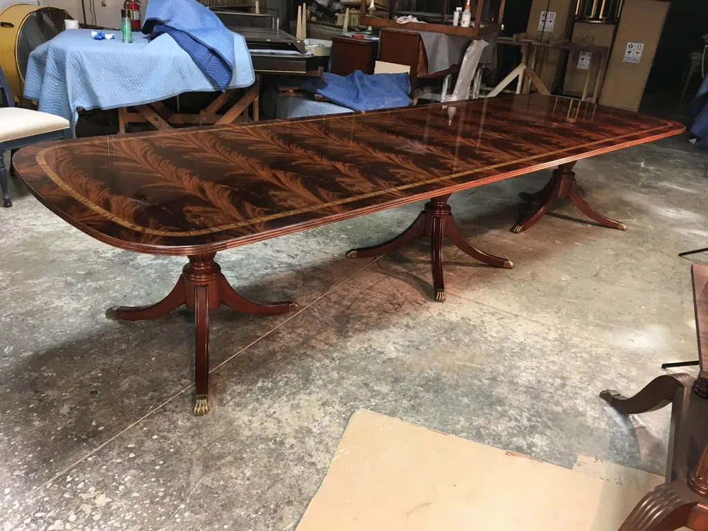 This is a made-to-order Large Traditional mahogany banquet/dining table made in the Leighton Hall shop. It features a field of slip-matched swirly crotch mahogany from west Africa with a satinwood inlay and a crotch mahogany border. It has a hand rubbed and polished semigloss finish. The end pedestals have three fluted legs and the center pedestal has four fluted legs. Each leg terminates with antique brass lions paw feet. Dimensions: 50 in. x 84 in. with three 24 in. Leaves (total length with leaves inserted is 156 in.) This table can be purchased as shown, or it can be customized to you desired size and design. We can make you a bench-made, one-of-a-kind table in our shop to your specifications. Various lengths and widths are available. Available with 2 (132 in. total length), 3 (as shown), 4 (180 in. total length) or 5 (204 in. total length) leaves. Other options available. Price will vary depending upon options. Estimated production time is 60-90 days.
