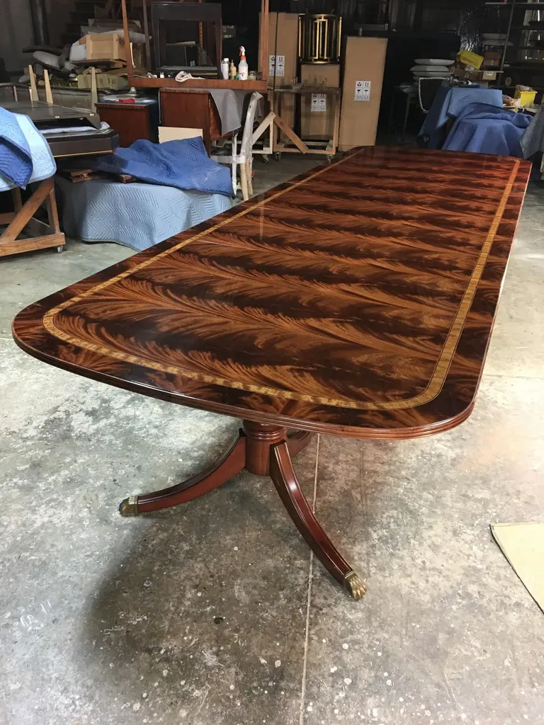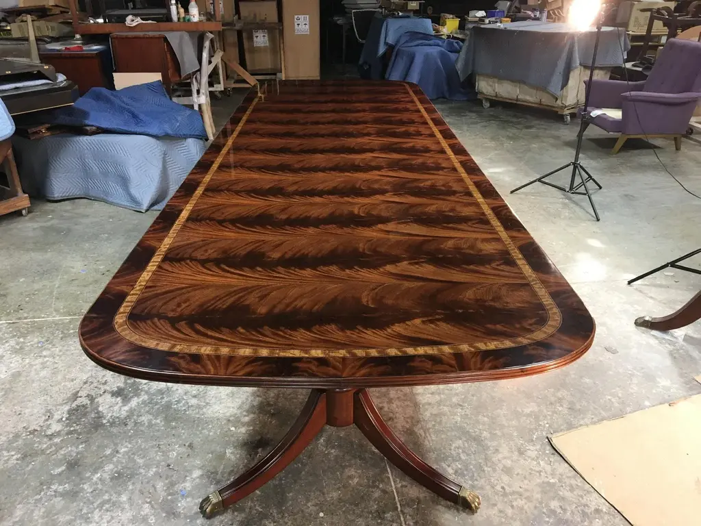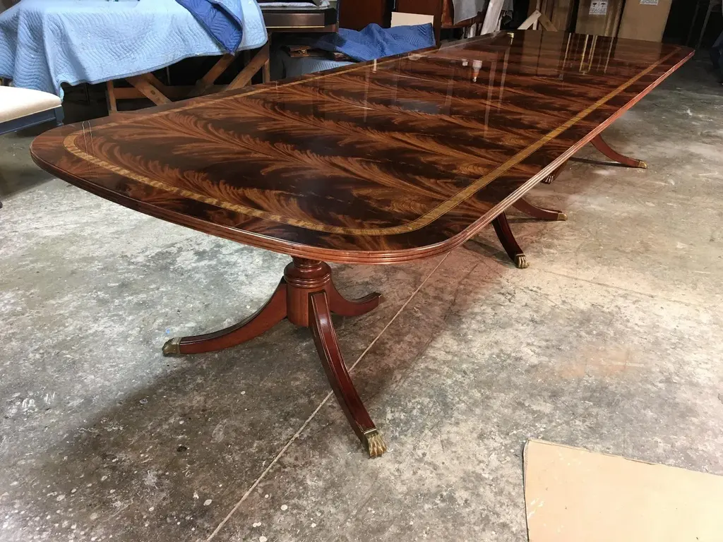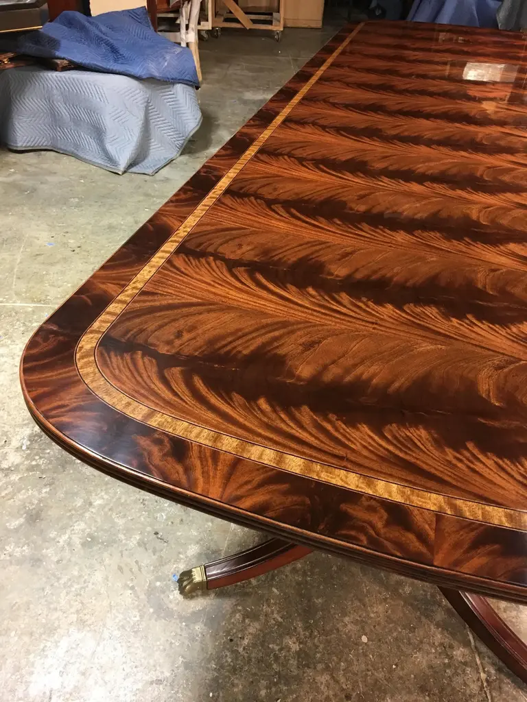 This is a made-to-order Large Traditional mahogany banquet/dining table made in the Leighton Hall shop. It features a field of slip-matched swirly crotch mahogany from west Africa with a satinwood inlay and a crotch mahogany border. It has a hand rubbed and polished semigloss finish. The end pedestals have three fluted legs and the center pedestal has four fluted legs. Each leg terminates with antique brass lions paw feet. Dimensions: 50 in. x 84 in. with three 24 in. Leaves (total length with leaves inserted is 156 in.)