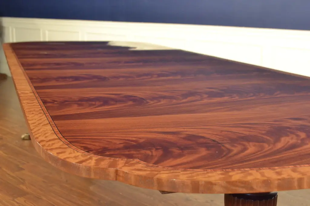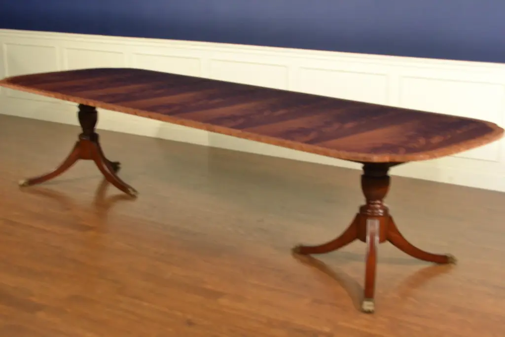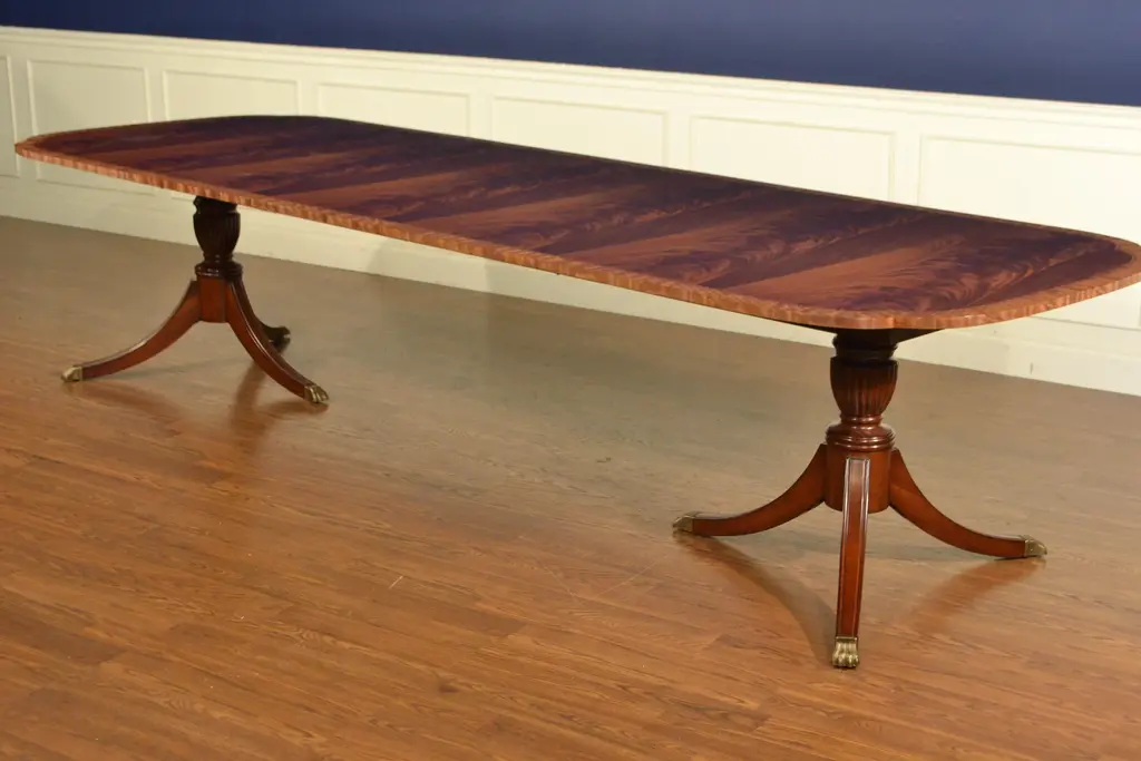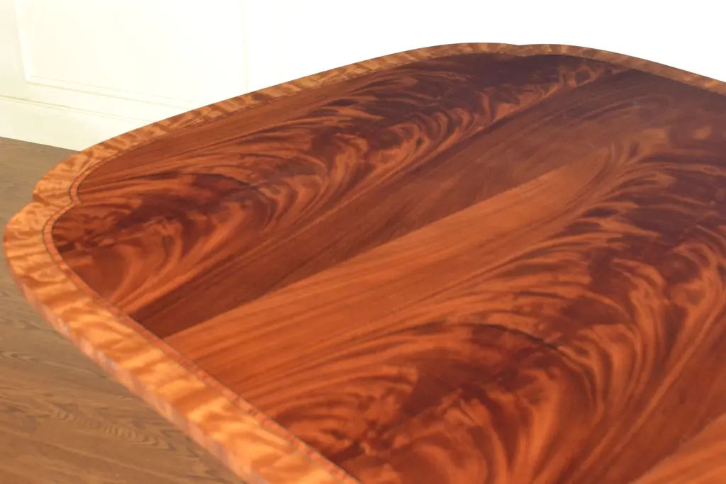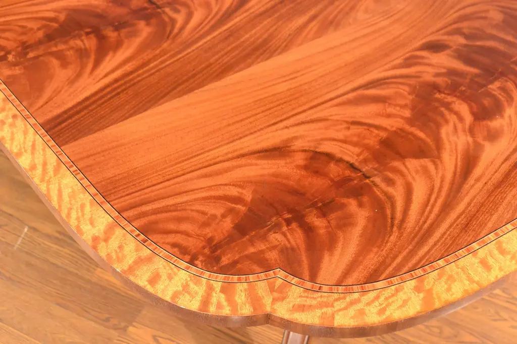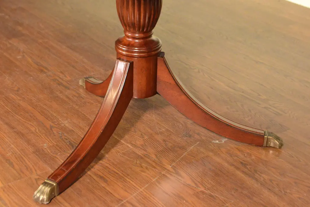 This is a made-to-order large traditional mahogany dining table made in the Leighton Hall shop. The highlight of this table is the elegantly shaped scalloped corners. It features a field of slip-matched swirly crotch mahogany from West Africa and a satinwood border from South America.It has our premier hand rubbed and polished semi-gloss finish. The pedestals have three fluted legs which terminate with antique brass lions paw feet. Dimensions: Width 46 in., length 74 in. with three 20 in. leaves (134 in. With all three leaves inserted), height 30 in. Estimated production time is 30-60 days.