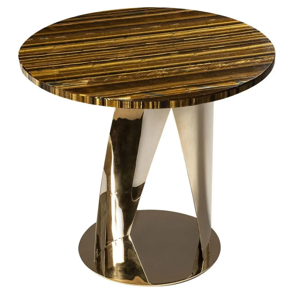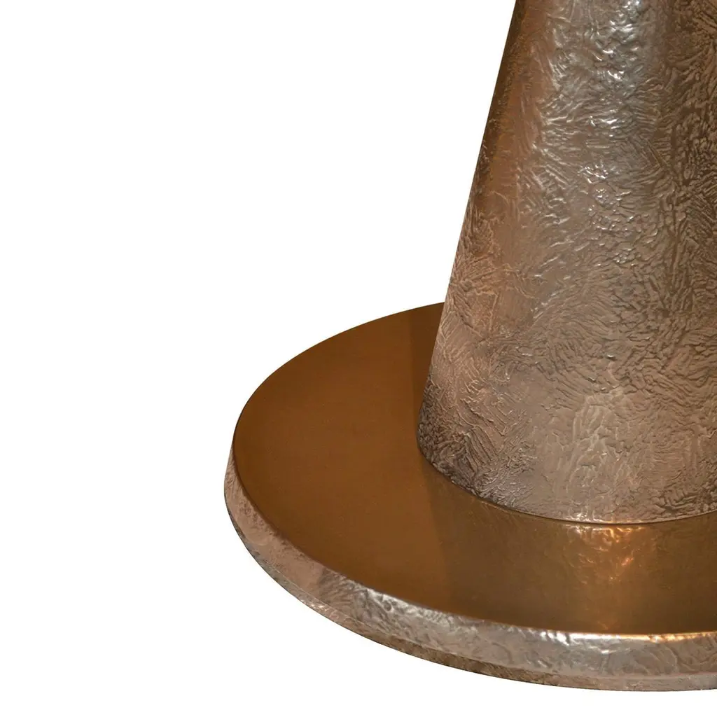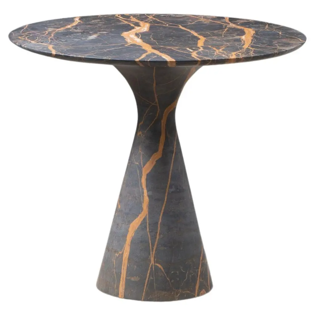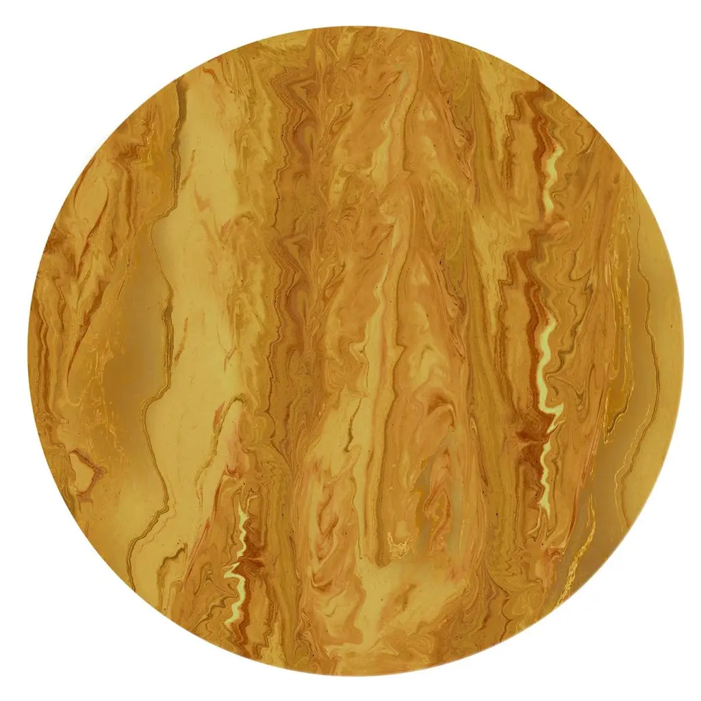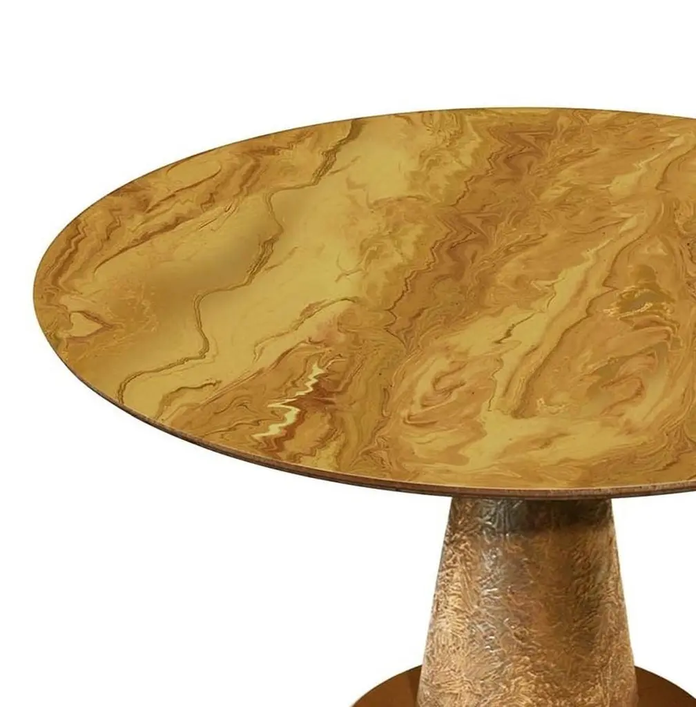 A statement piece in Classic and modern dining rooms alike, this stunning table is defined by a meticulous crafting process and singular visual aesthetic. Entirely crafted of wood, it features a striking round top with a captivating scagliola decoration (from the Italian "scaglia" meaning "chips") recreating the look of honey-colored marble. The use of moonstone in the scagliola infuses a sophisticated glossy finish that highlights the warm marble veins. The pillar leg is raised on a round base, whose bronze lacquered finish is mirrored by the border of the round top. Available in other sizes.