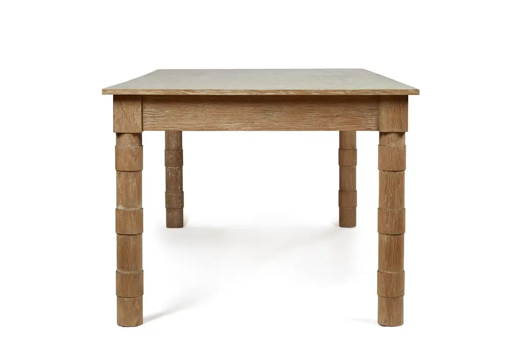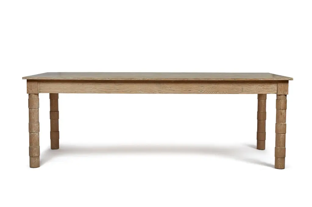 Martin & Brockett's Jenks Dining Table features clean-lined transitional turned legs and a solid wood top. Shown in Tanned Oak finish. Standard: H 30 in. x W 72 in. x D 38 in.Part of our Jenks Collection.Available for order in additional finishes and custom sizing.Lead time: 15-16 weeks.Video included for reference on leg details & sizing, shown with marble top and in our White Cerused finish on oak.