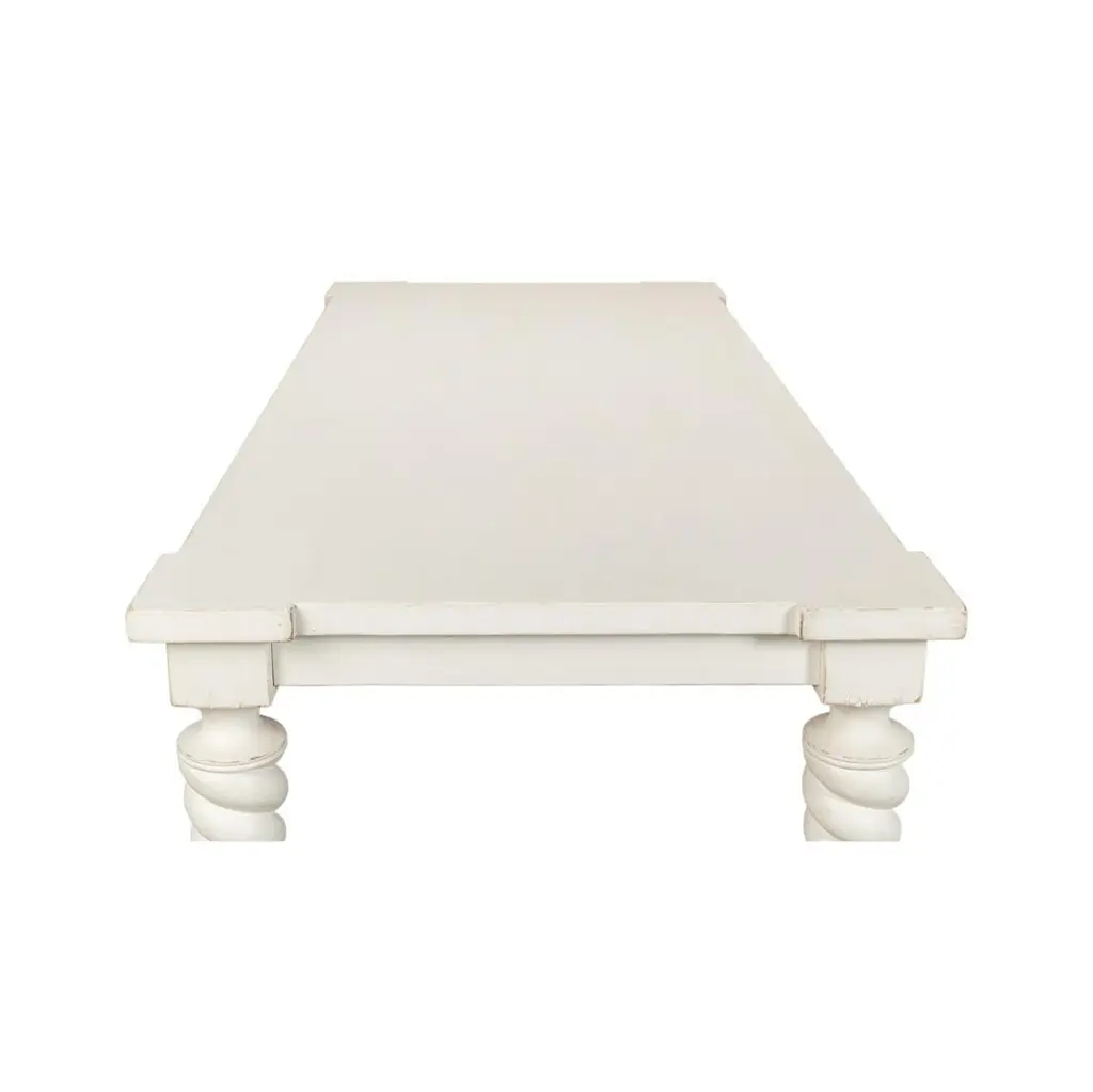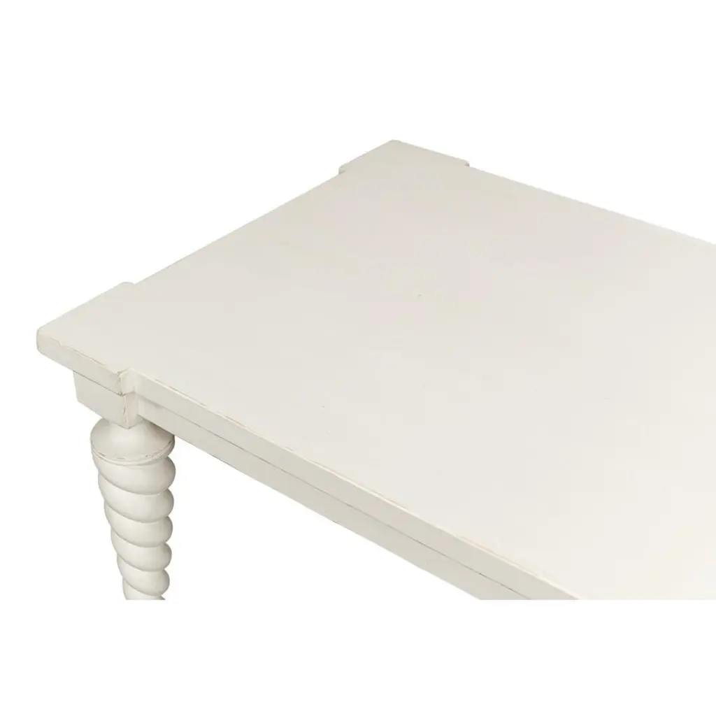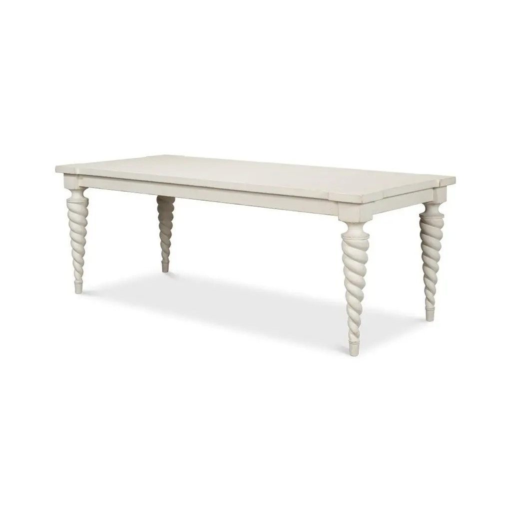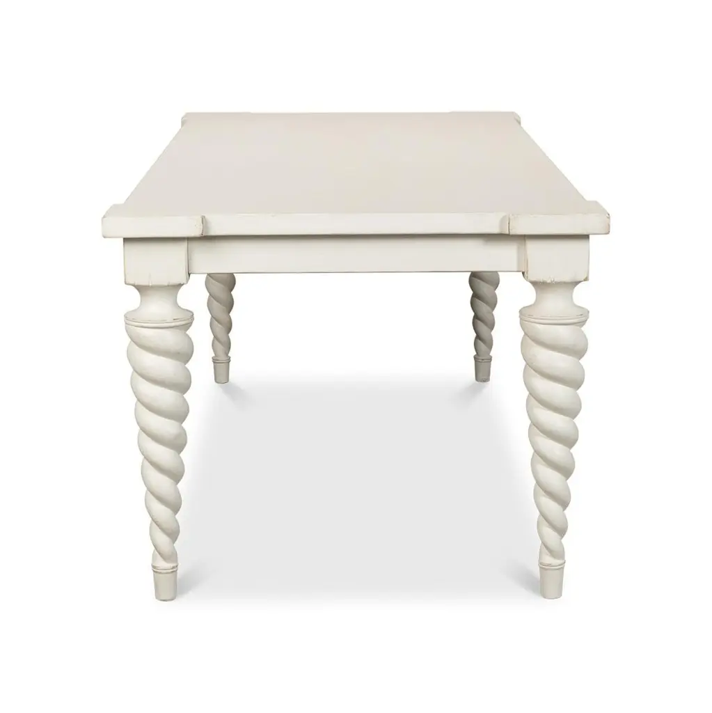 This table is a stunning blend of eco-conscious craftsmanship and sophisticated style, measuring an ample 85" in width, 37" in depth, and 30" in height.At the heart of its design are the rope-turned spiral legs, which offer a whimsical yet refined take on classic table structures. These unique legs support a generously sized tabletop with a recessed edge, giving the piece a delicate, floating appearance.The entire structure is coated in an antique white finish, enhancing its transitional style and allowing it to blend seamlessly with a range of interior decors—from modern minimalist to country chic.Dimensions: 85" W x 37" D x 30" H