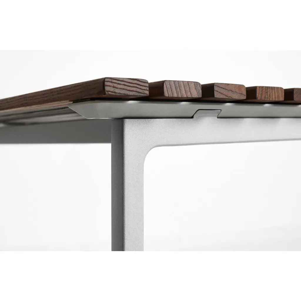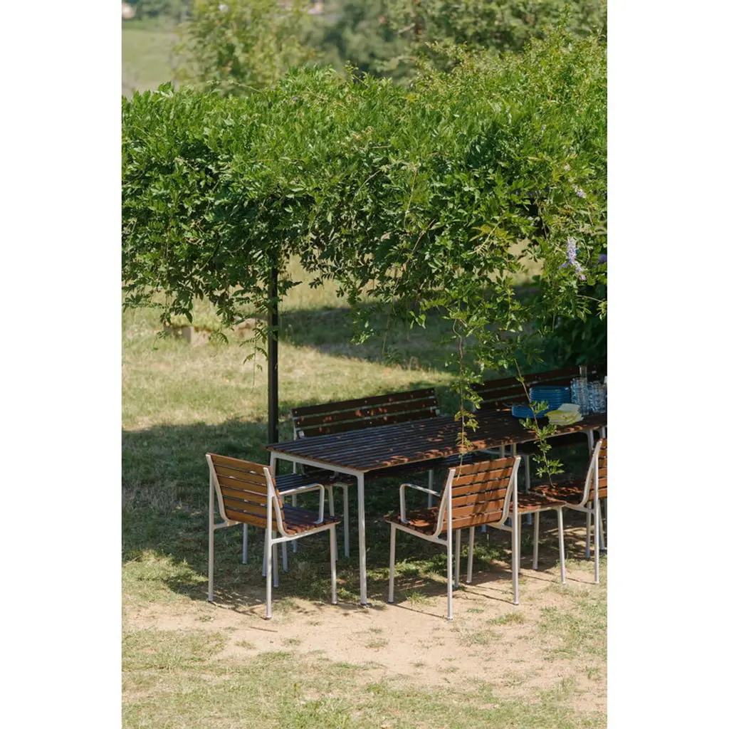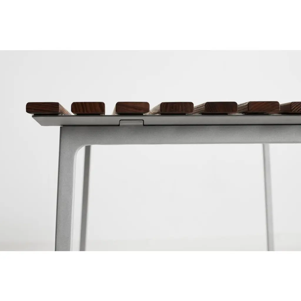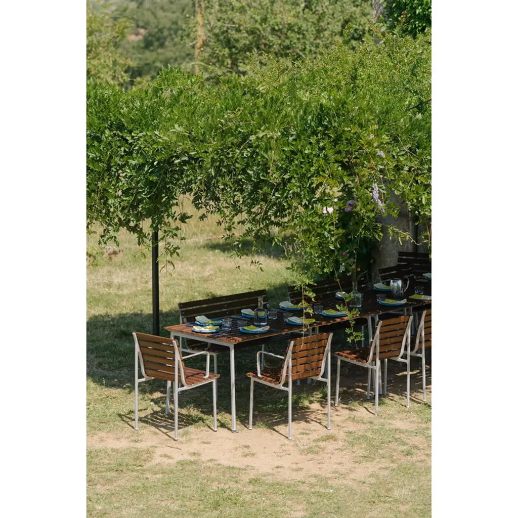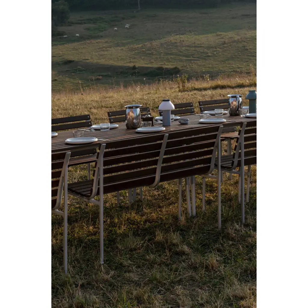 HAY's Traverse table brings together harmonious shapes and the rich texture of heat-treated ash, making it a natural fit for any outdoor space. Created by French designer Erwan Bouroullec, this large outdoor dining table adapts effortlessly to its surroundings, whether nestled in a lush garden or placed on a sleek urban balcony. Over time, the heat-treated ash develops a beautiful silver-gray patina, blending even more seamlessly into its surroundings. HAY's Traverse patio furniture is crafted from two strong, weather-resistant materials: a lightweight lacquered aluminum frame and solid heat-treated ash. This chemical-free treatment, achieved with steam and heat, enhances the wood's moisture resistance and strengthens it all the way to the core. The process gives the naturally light ash a dark surface, which gradually ages into a soft gray hue under exposure to UV light. To minimize packaging size, the furniture is delivered in parts.