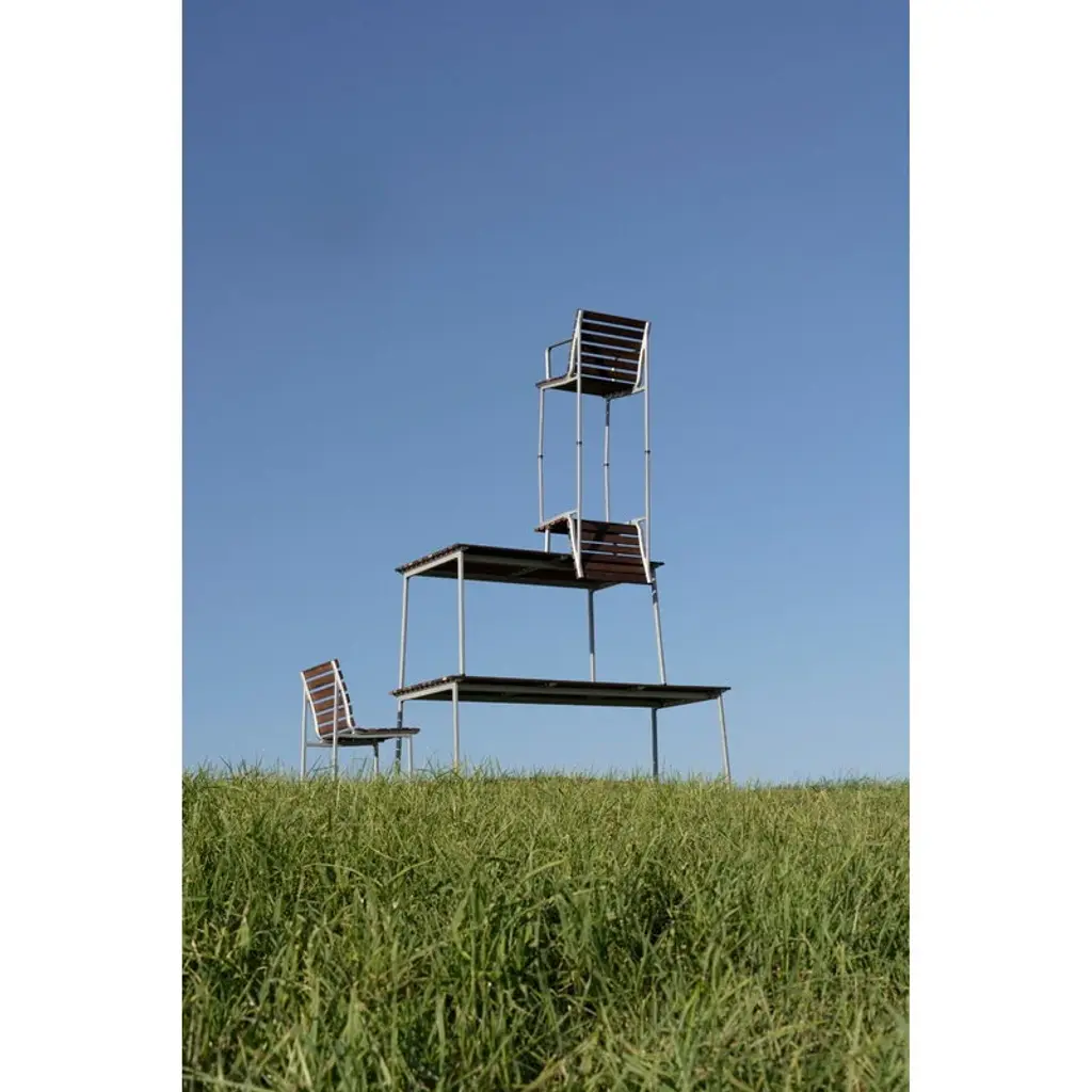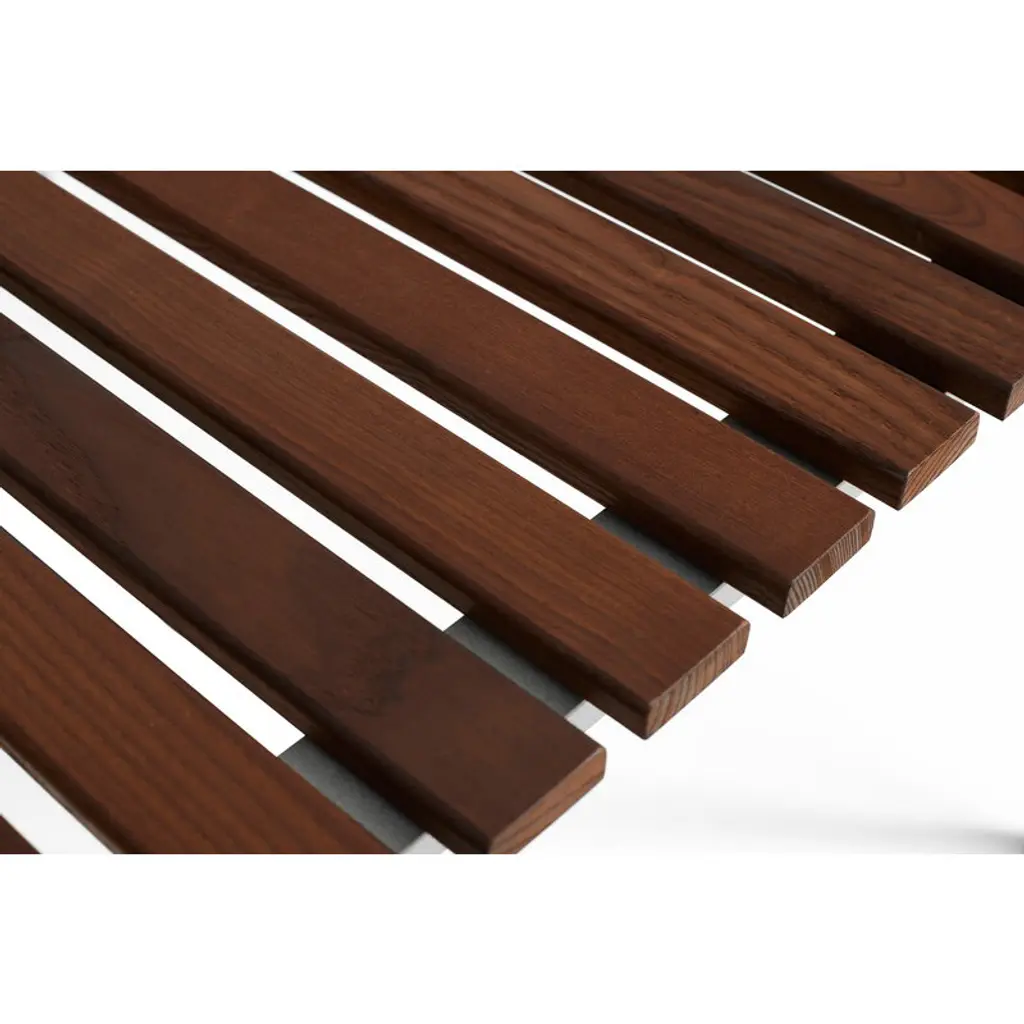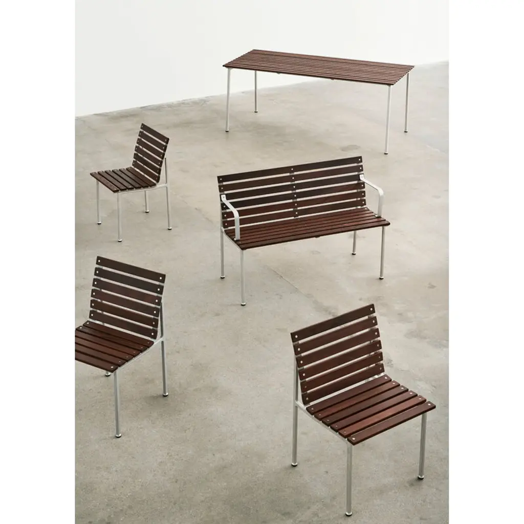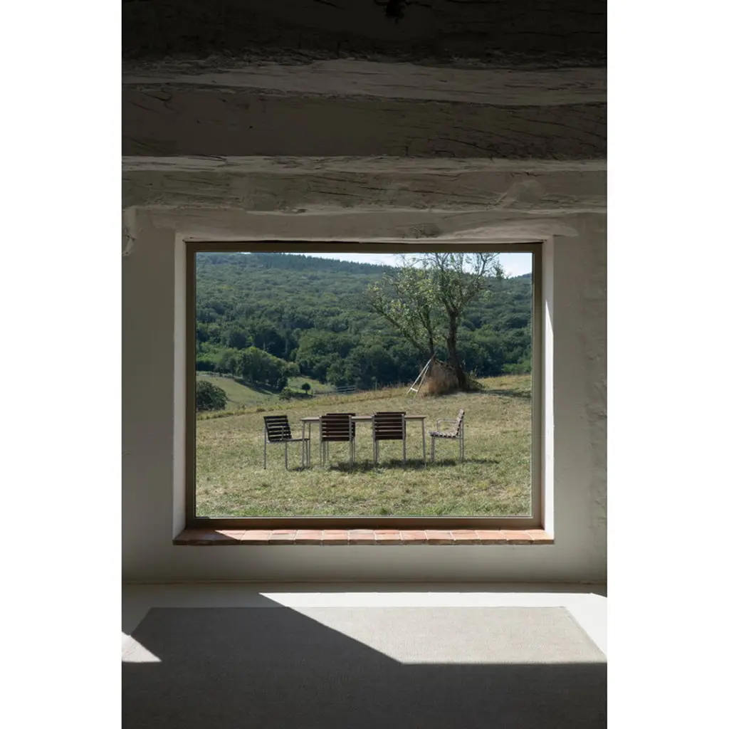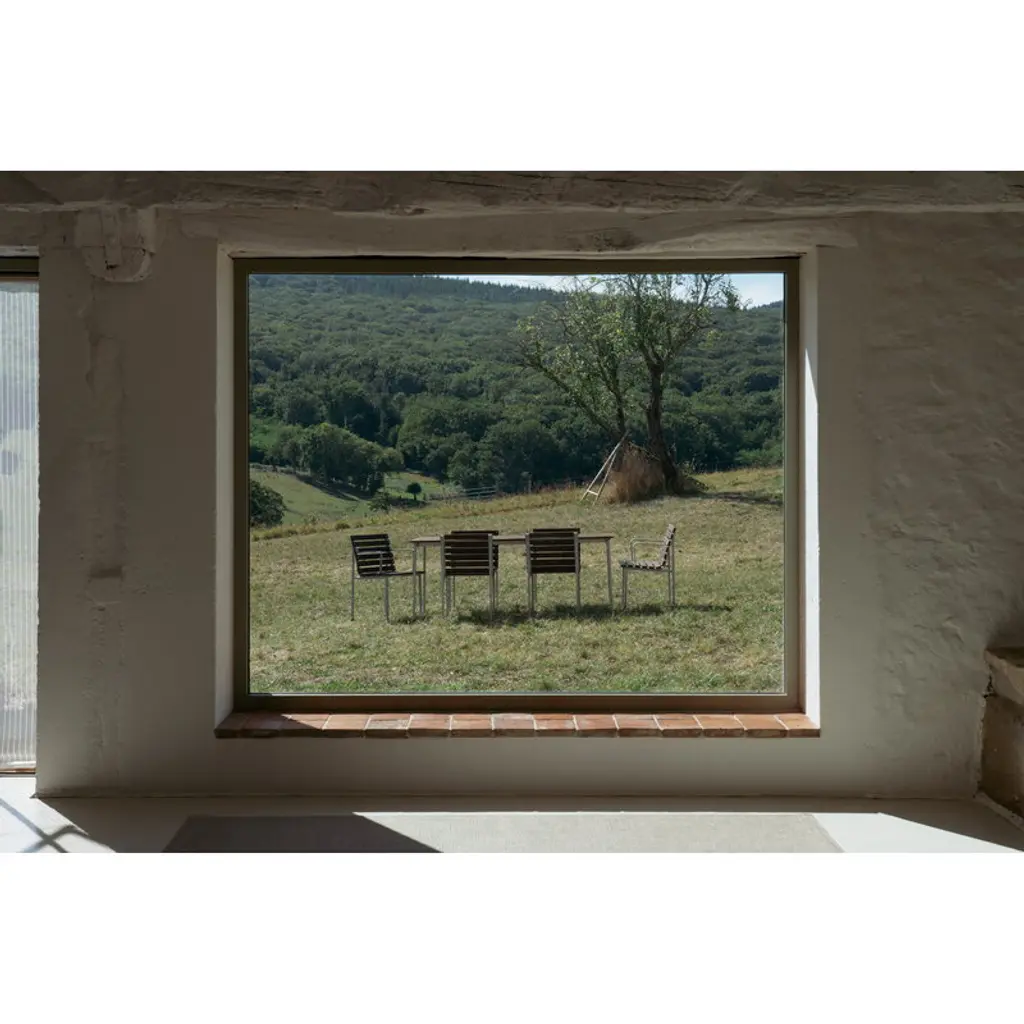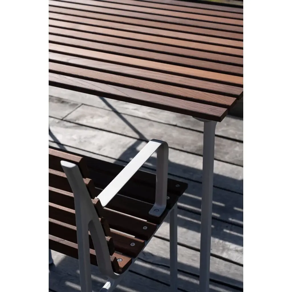 HAY's Traverse table brings together harmonious shapes and the rich texture of heat-treated ash, making it a natural fit for any outdoor space. Created by French designer Erwan Bouroullec, this large outdoor dining table adapts effortlessly to its surroundings, whether nestled in a lush garden or placed on a sleek urban balcony. Over time, the heat-treated ash develops a beautiful silver-gray patina, blending even more seamlessly into its surroundings. HAY's Traverse patio furniture is crafted from two strong, weather-resistant materials: a lightweight lacquered aluminum frame and solid heat-treated ash. This chemical-free treatment, achieved with steam and heat, enhances the wood's moisture resistance and strengthens it all the way to the core. The process gives the naturally light ash a dark surface, which gradually ages into a soft gray hue under exposure to UV light. To minimize packaging size, the furniture is delivered in parts.