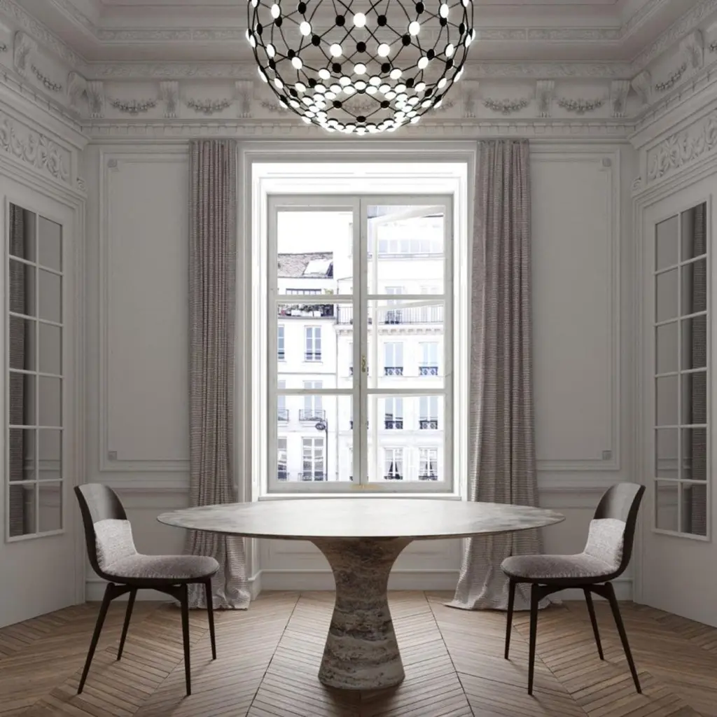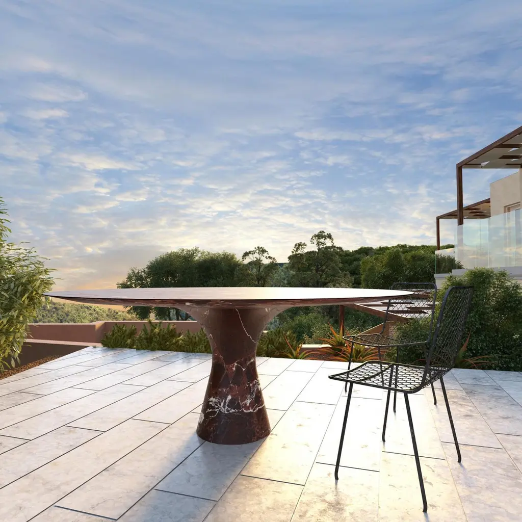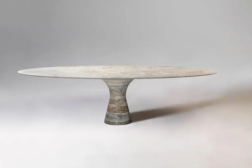 Travertino Silver Refined Contemporary Marble Dining Table 160/75Angelo is the essence of a round table in natural stone, a sculptural shape in robust material with elegant lines and refined finishes.The collection consists of a round/oval dining or conference table, side tables and lower tables.Suitable for both indoor and outdoor use!All tables are made by order and finished by hand to be sure that the table top and base become one pieceThe basic collection consists of 9 different marbles and different standard dimensions, however on request we make to measure.Almost any size or marble is possible!All tables are signed and numbered (the low and side tables are only signed).All tables are impregnated with Lithofin Nanotop. This protection is not visible and the marble keeps its natural look and feel. With the delivery of every table, a maintenance set of Lithofin is included.The production time is standard 12 weeks.The design Angelo is the essence of a round or oval table in natural stone, it features a sculptural form, sturdy material, an elegant line and a refined finish. Two elements, table base and top, form one whole together. The bottom is one running curve from table foot to edge. The conical connection creates a stable whole.To show the marble in it’s most expressive character, different finishes are possible (polished, honed, brushed, striped, sandblasted & brushed). The basic collection consists of nine different types of marble and different sizes. On request this design can be executed in almost any type of marble and on measure. This table is perfectly suitable in a housing, retail or office environment. As the table is supported by one central foot it creates a lot of flexibility in seating. Executed in hard variations of natural stone suited for external use, this design can be a perfect garden table or sculpture.Angelo M/R 130 : ø 130 x 75 cmAngelo M/R 160 : ø 160 x 75 cmAngelo M/R 180 : ø 180 x 75 cmAngelo M/O 210 : 210 x 135 x 75 cmAngelo M/O 250 : 250 x 160 x 75 cmAngelo M/O 290 : 290 x 160 x 75 cm The basic collection is available in the following marbles: Kyknos, Grafite, Travertino Rosso, Grey Saint Laurent, Picasso Green, Port Saint Laurent, Travertino Silver, Rosso Lepanto and Bianco Statuarietto in a honed finish. On request different sizes, finishes and marbles are possible. AwardsGood Design Award – Chicago, USA (2018)People’s Choice, AZ Award – Toronto, Canada (2019)German Design Award – Frankfurt, Germany (2020).