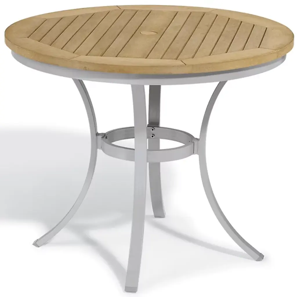 Enjoy stylish and convenient outdoor dining for 4 with the Travira 36 inch Outdoor Cafe Bistro Table by Oxford Garden. The graceful lines of this piece belies its toughness and durability against the elements. The top looks like teak, but it is actually a round of Tekwood, a specialty poly material made to realistically replicate the real thing without all the required maintenance. The elegantly curved base is made of lightweight and weather resistant powder-coated aluminum.