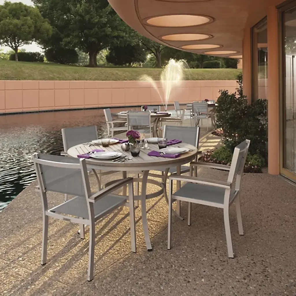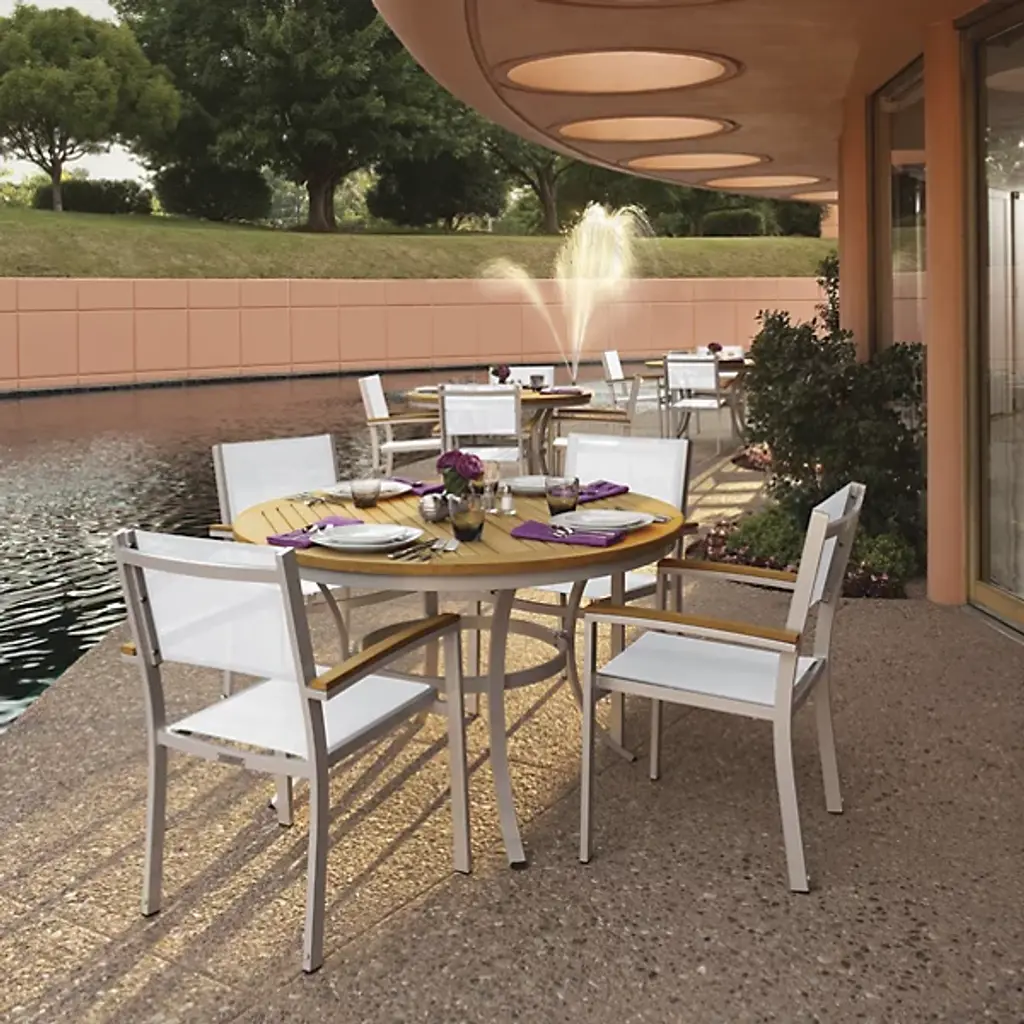 Capable of seating up to 6 people comfortably, the Travira 48 inch Round Outdoor Dining Table by Oxford Garden is a roomy, modern table for outdoor dining areas. From top to bottom, it is also highly durable and low maintenance. This starts with the round Tekwood top, a material that’s made to look like teak but be much less work to keep looking new. It sits on a similarly weather- and impact-resistant base made of powder coated aluminum.