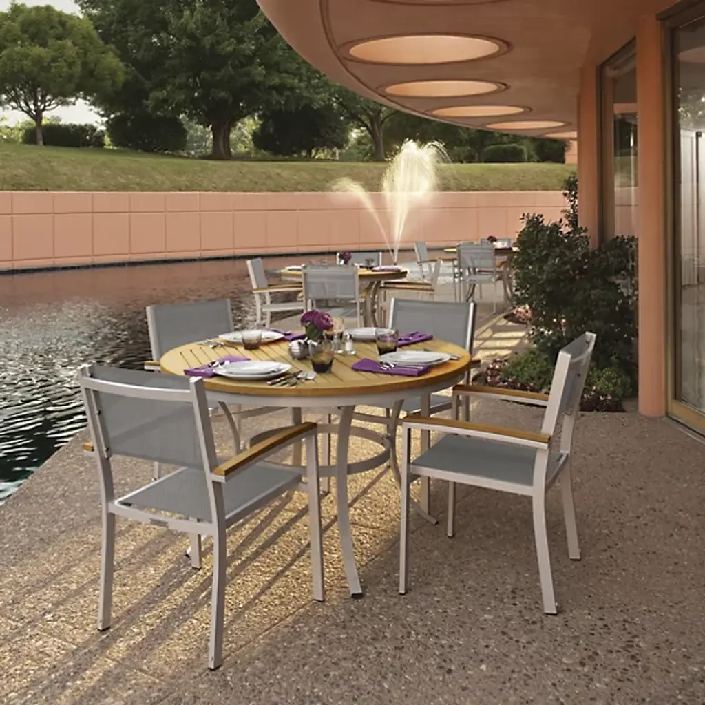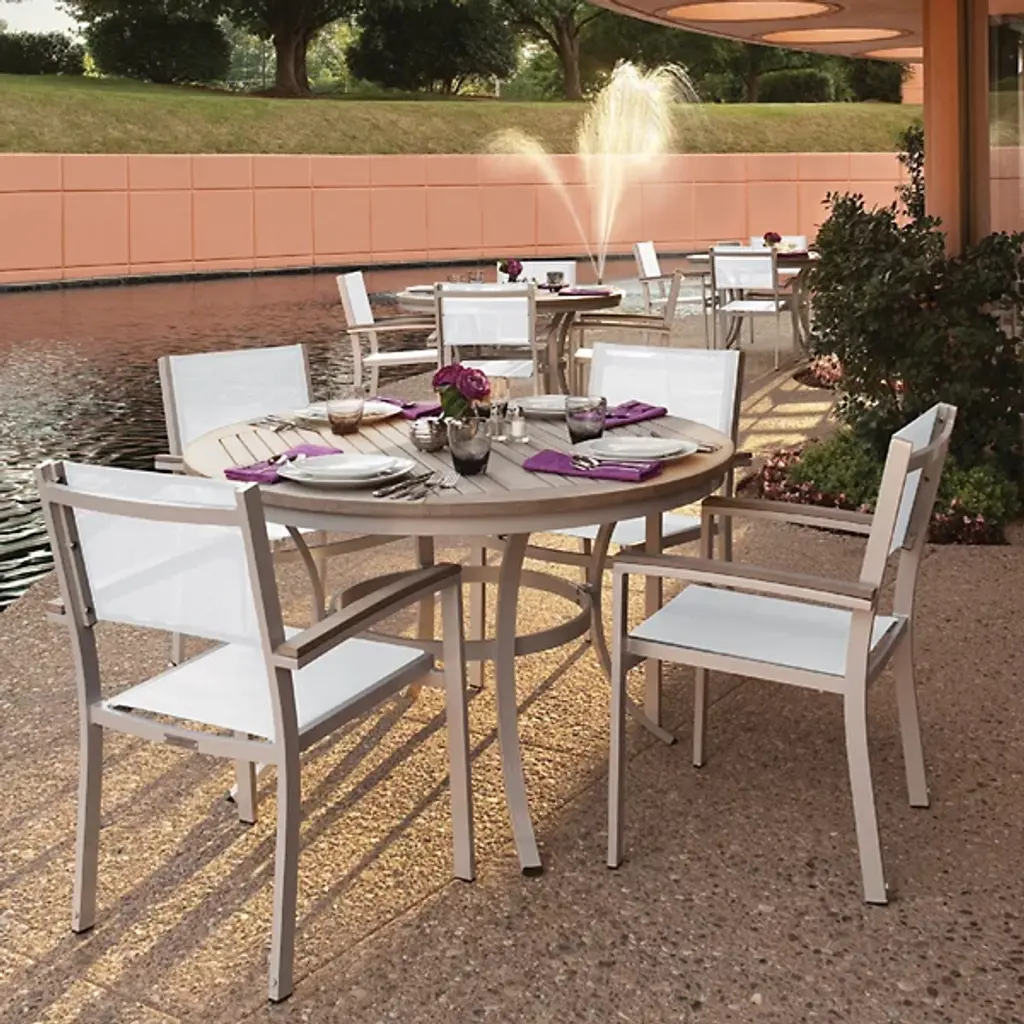 Capable of seating up to 6 people comfortably, the Travira 48 inch Round Outdoor Dining Table by Oxford Garden is a roomy, modern table for outdoor dining areas. From top to bottom, it is also highly durable and low maintenance. This starts with the round Tekwood top, a material that’s made to look like teak but be much less work to keep looking new. It sits on a similarly weather- and impact-resistant base made of powder coated aluminum.