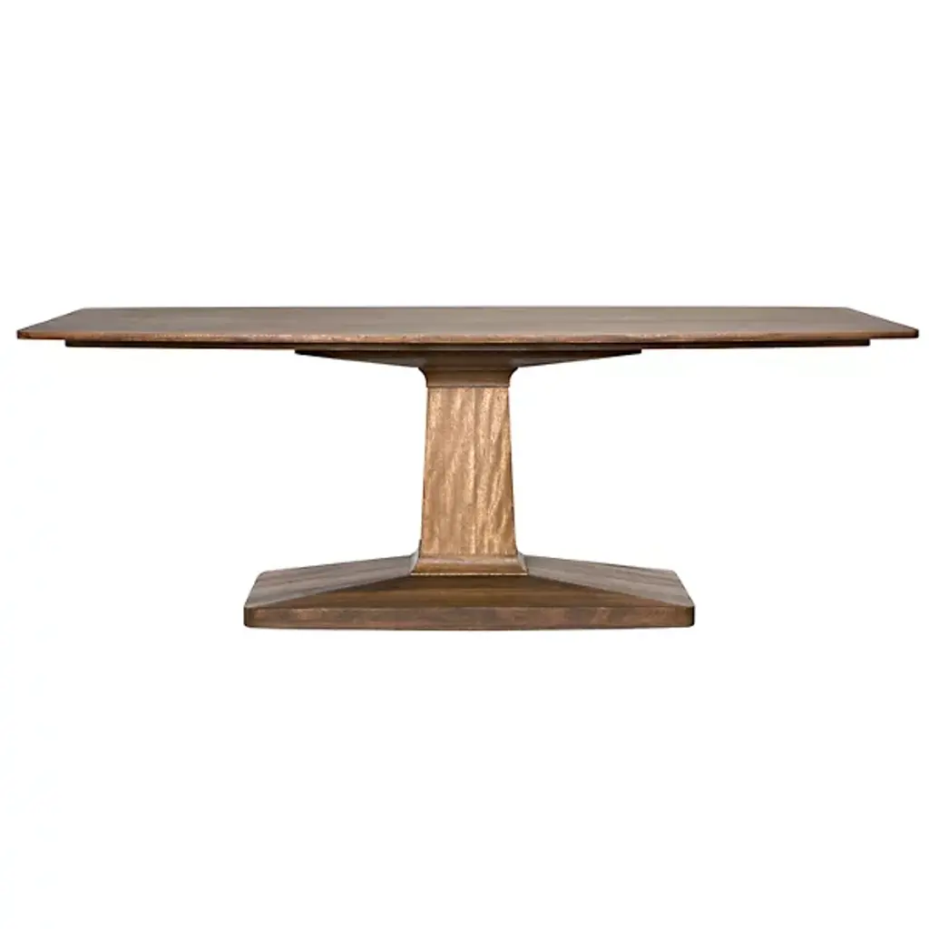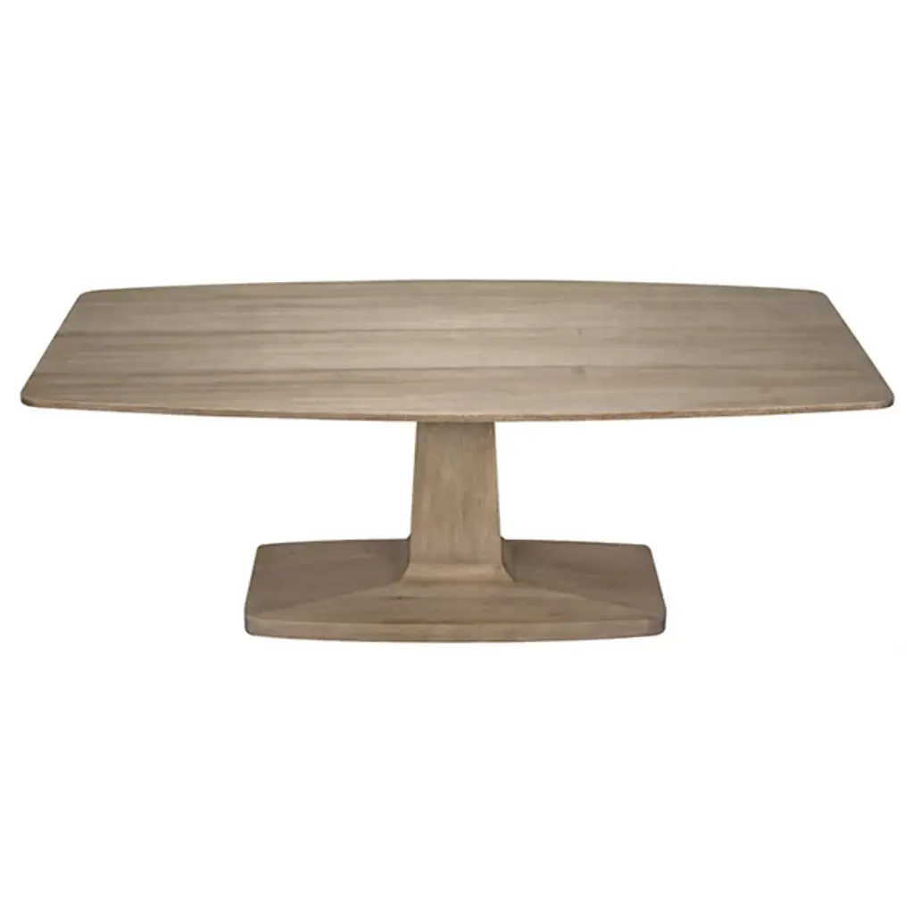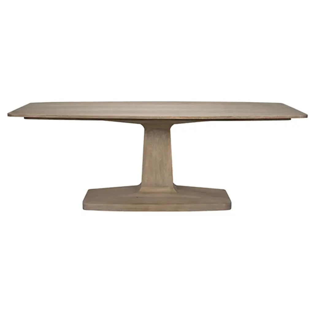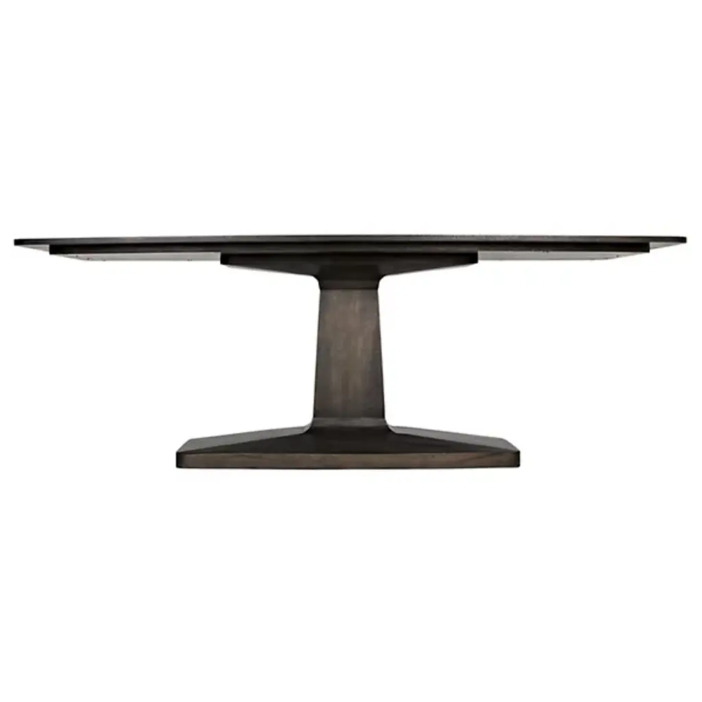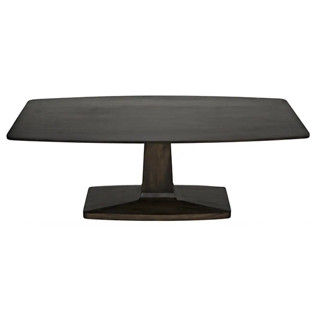 Elegant, abstract, and arresting, the Travis Dining Table from Noir enhances spaces with inspired angularity. A clever and clean-surfaced construction in natural woodgrain, it starts with a rectangular base that bevels upward, adding a touch of complexity, extending a contrasting column to a broader tabletop that flares out as it rises. The stepped lower construction of the table adds strength, while the rounded corners of each tabletop provide a visual and physical softening, transforming its environment with retro-modern charm.
