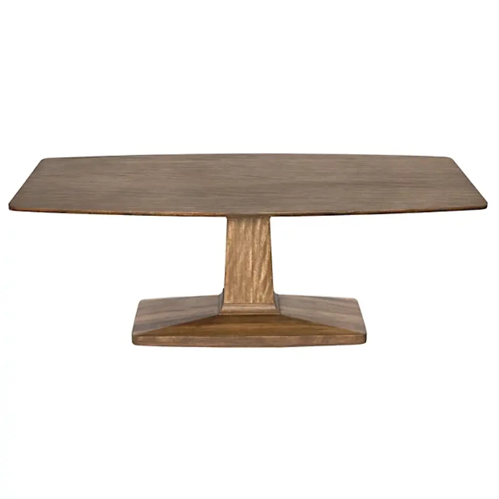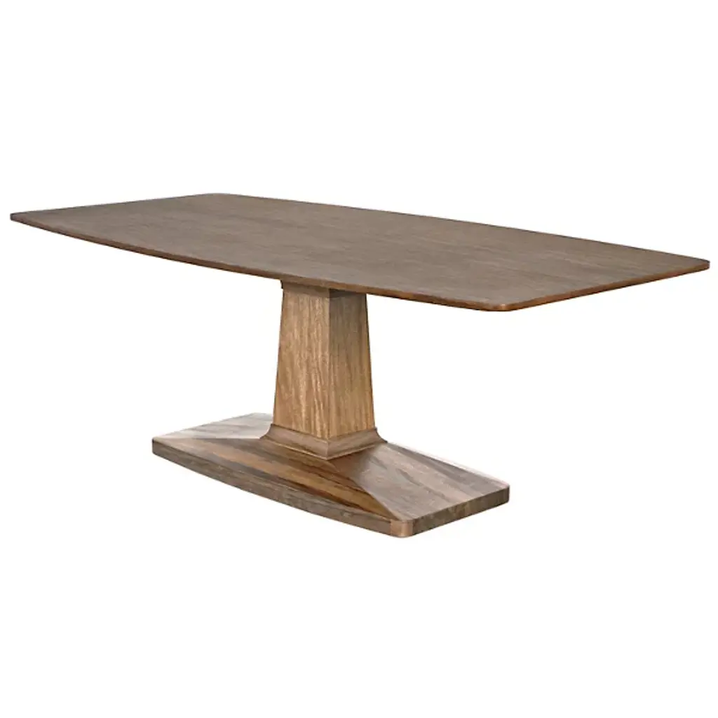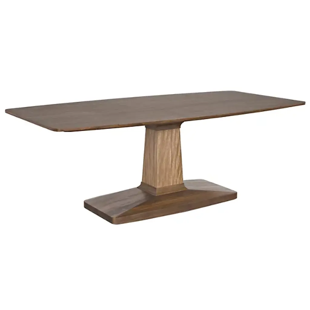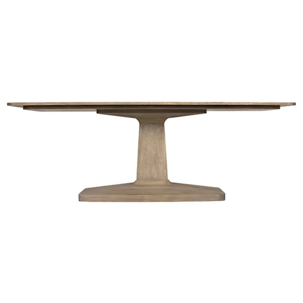 Elegant, abstract, and arresting, the Travis Dining Table from Noir enhances spaces with inspired angularity. A clever and clean-surfaced construction in natural woodgrain, it starts with a rectangular base that bevels upward, adding a touch of complexity, extending a contrasting column to a broader tabletop that flares out as it rises. The stepped lower construction of the table adds strength, while the rounded corners of each tabletop provide a visual and physical softening, transforming its environment with retro-modern charm.