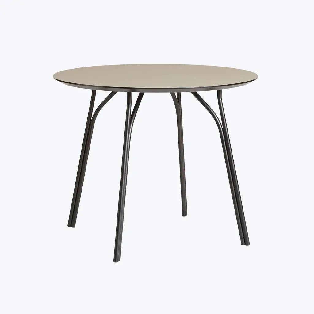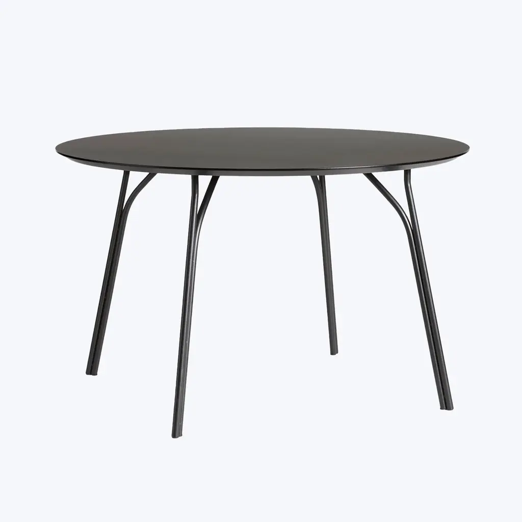 The Tree Dining Table, designed by Elisabeth Hertzfeld, showcases metallic legs in a variety of colorways for a sleek, graphic look in your dining room. Ramifying like the branches of a tree, this small round dining table's legs are crafted from two steel tubes that rise side by side before their paths separate to support the tabletop in several places. WOUD is FSC Certified ensuring that products are crafted in a responsible and sustainable manner.