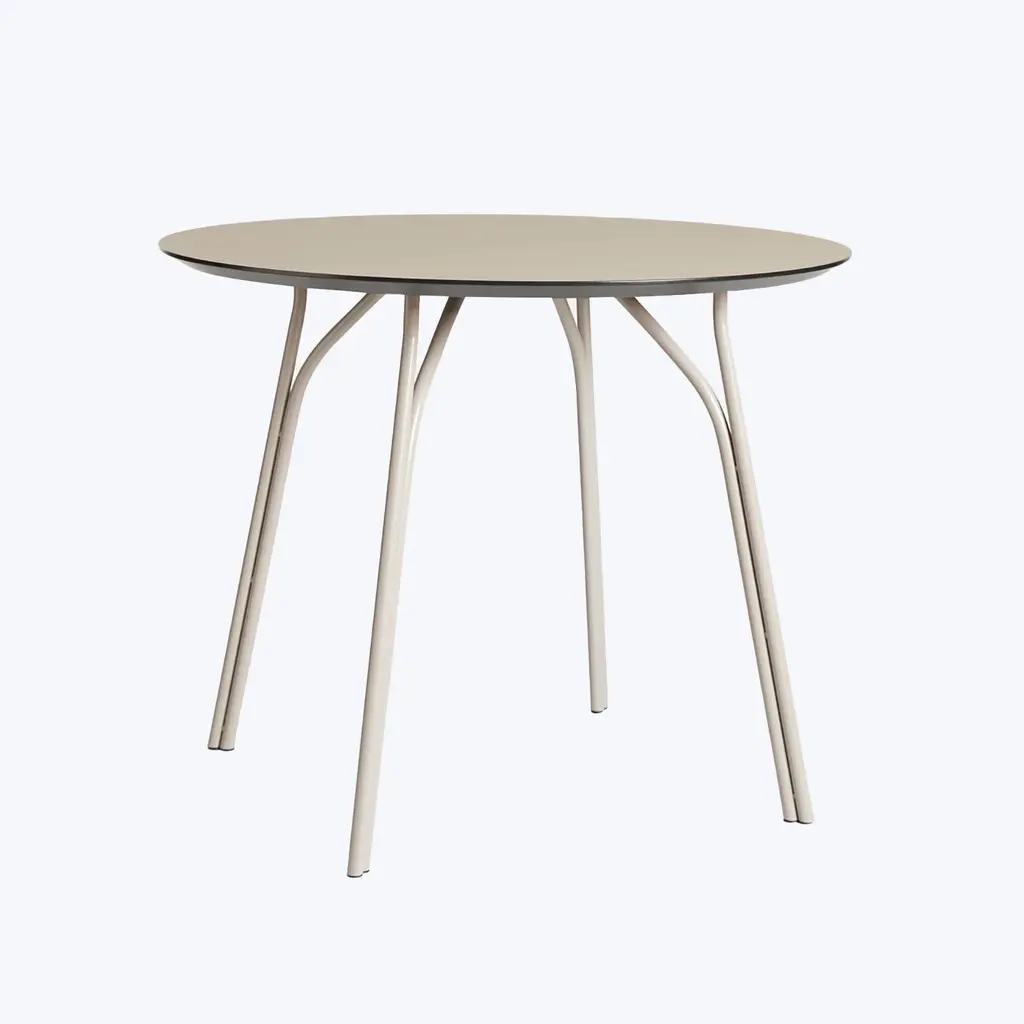 The Tree Dining Table, designed by Elisabeth Hertzfeld, showcases metallic legs in a variety of colorways for a sleek, graphic look in your dining room. Ramifying like the branches of a tree, this small round dining table's legs are crafted from two steel tubes that rise side by side before their paths separate to support the tabletop in several places. WOUD is FSC Certified ensuring that products are crafted in a responsible and sustainable manner.