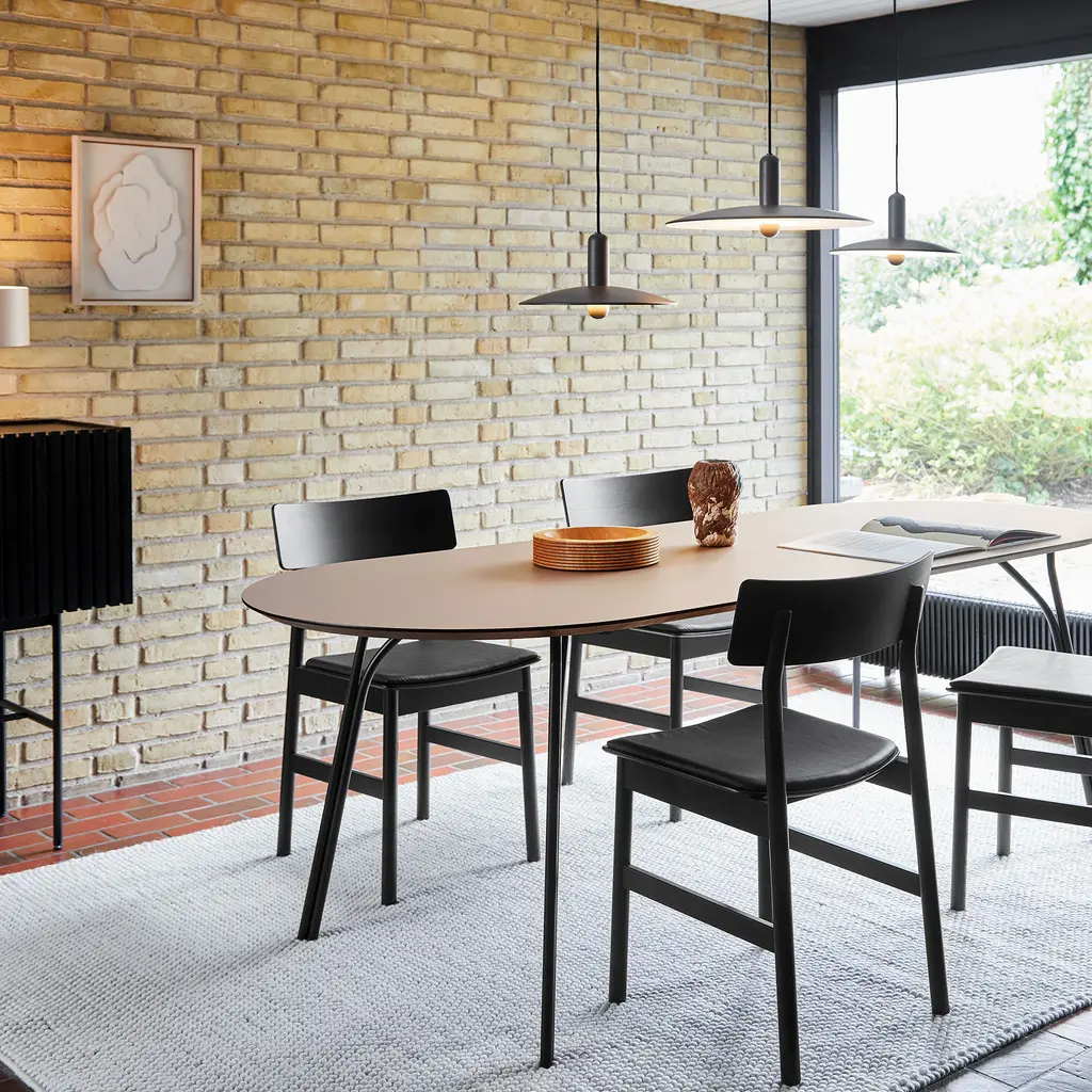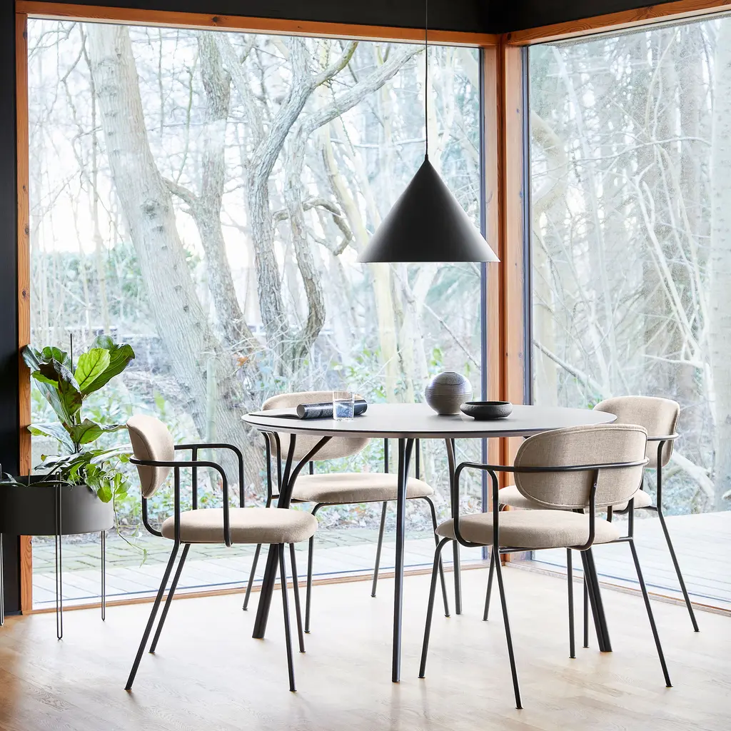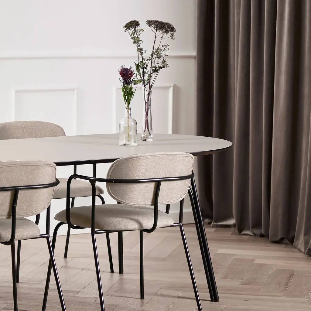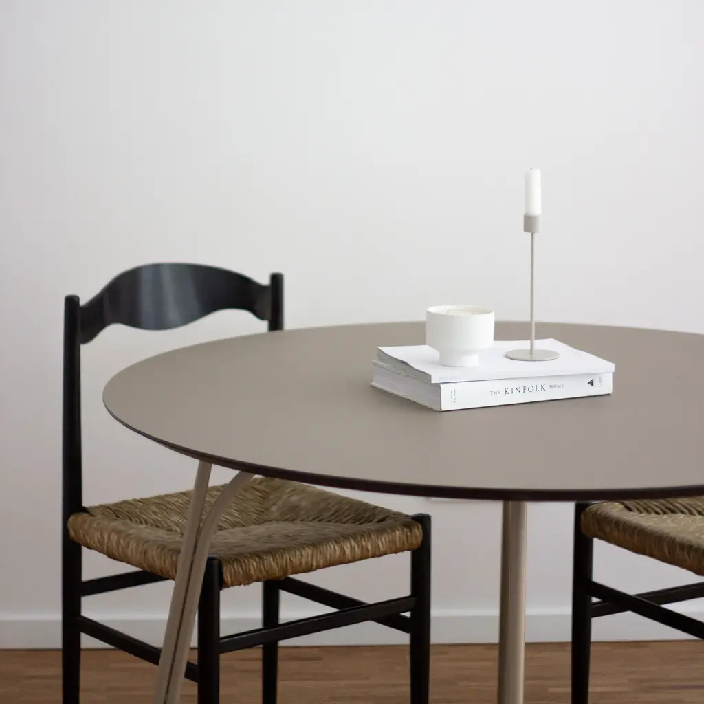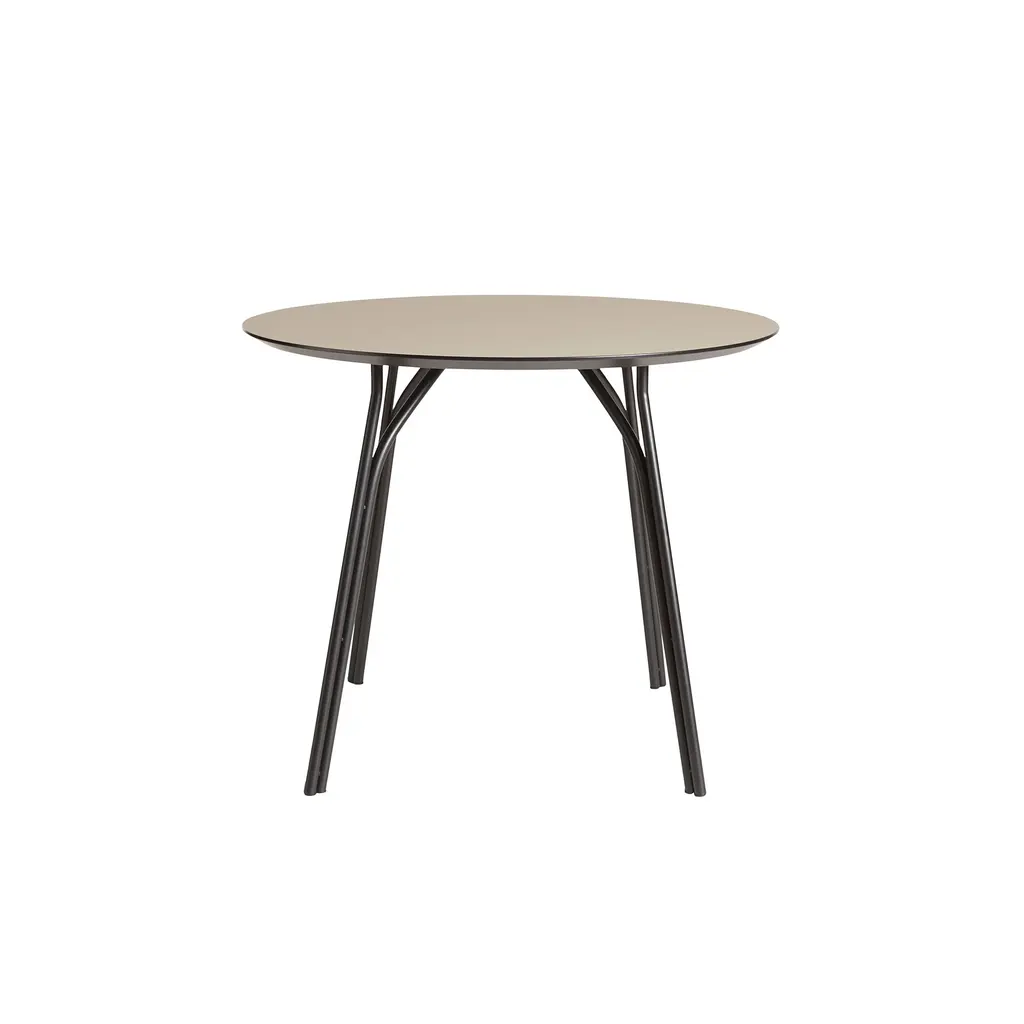 Translating the beauty of a forest into a minimalist form, the Woud Tree Dining Table refines the heart of the home: the place where family and friends gather and share meals. Inspired by a walk in a woodland, French-American designer Elisabeth Hertzfeld created the Tree table with branch-like legs that provide support to the tabletop, a symbolic canopy. The tubular legs add an organic accent to the design as they split into two branches each. Large and spacious, the top has a rounded shape to encourage lively conversations and close connections at the dining table. Made with a combination of metal legs and a Fenix nano laminate top.